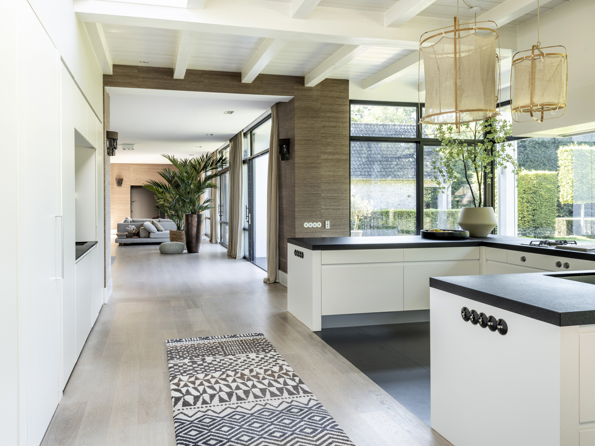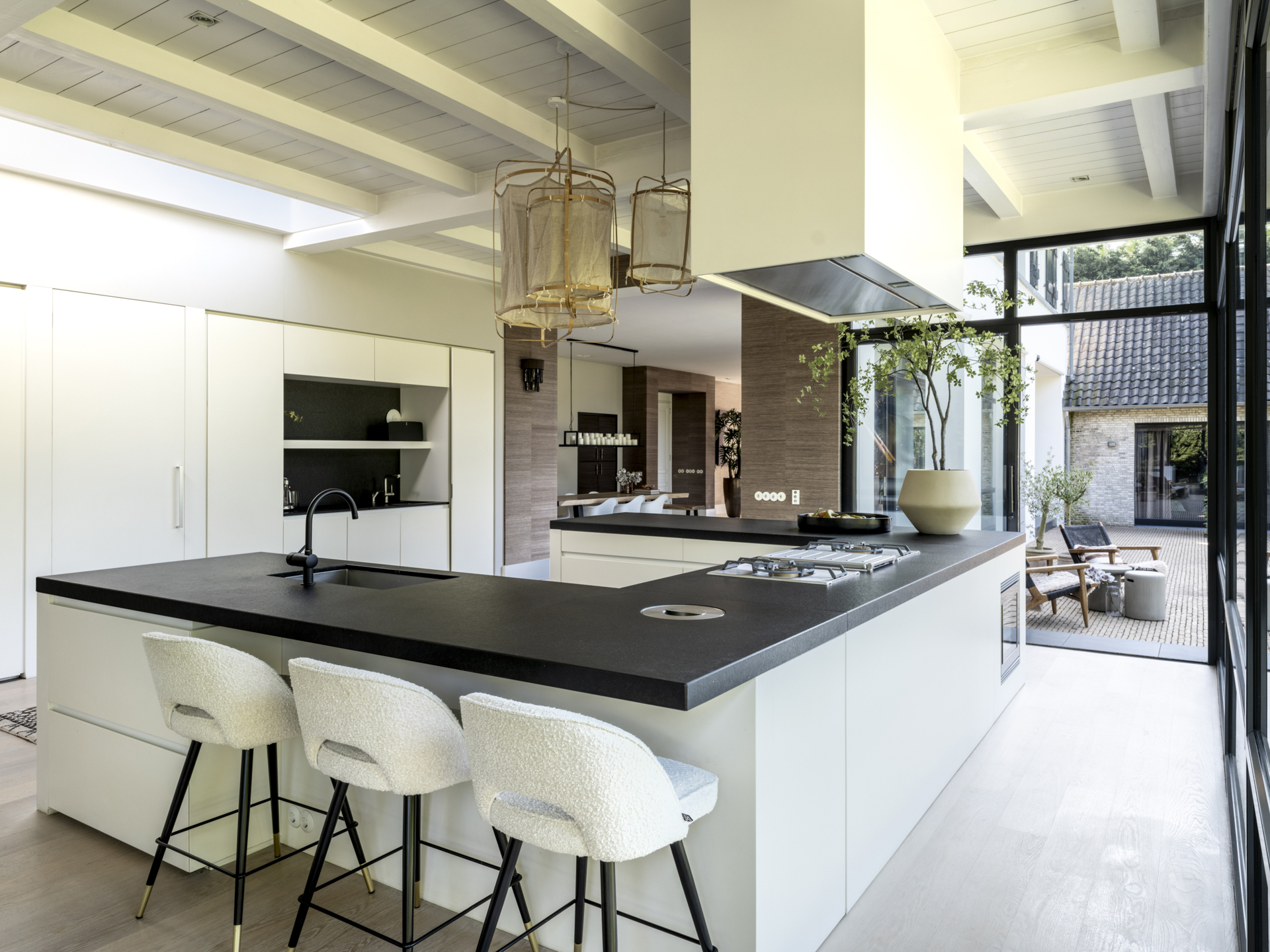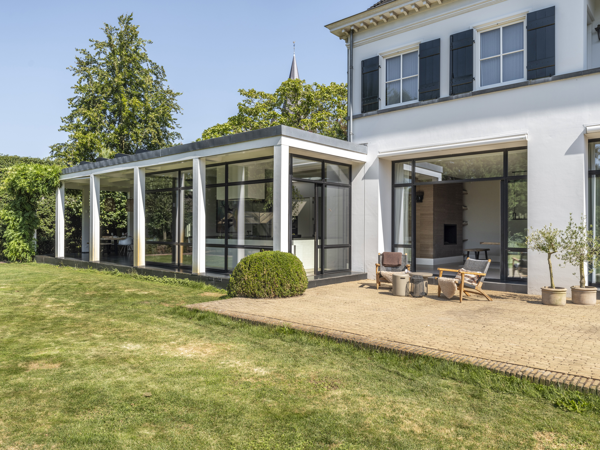 From the classic entrance, you can access the practical mudroom with a side entrance and the living and dining room. This bright and open living space connects two side wings and features beautiful light and a lovely view of the entire garden. Activity and warmth are centered around the kitchen (with an adjacent spacious and practical utility room) and the covered terrace. At the front, adjacent to the living area, you will find a separate TV/work room overlooking the courtyard.