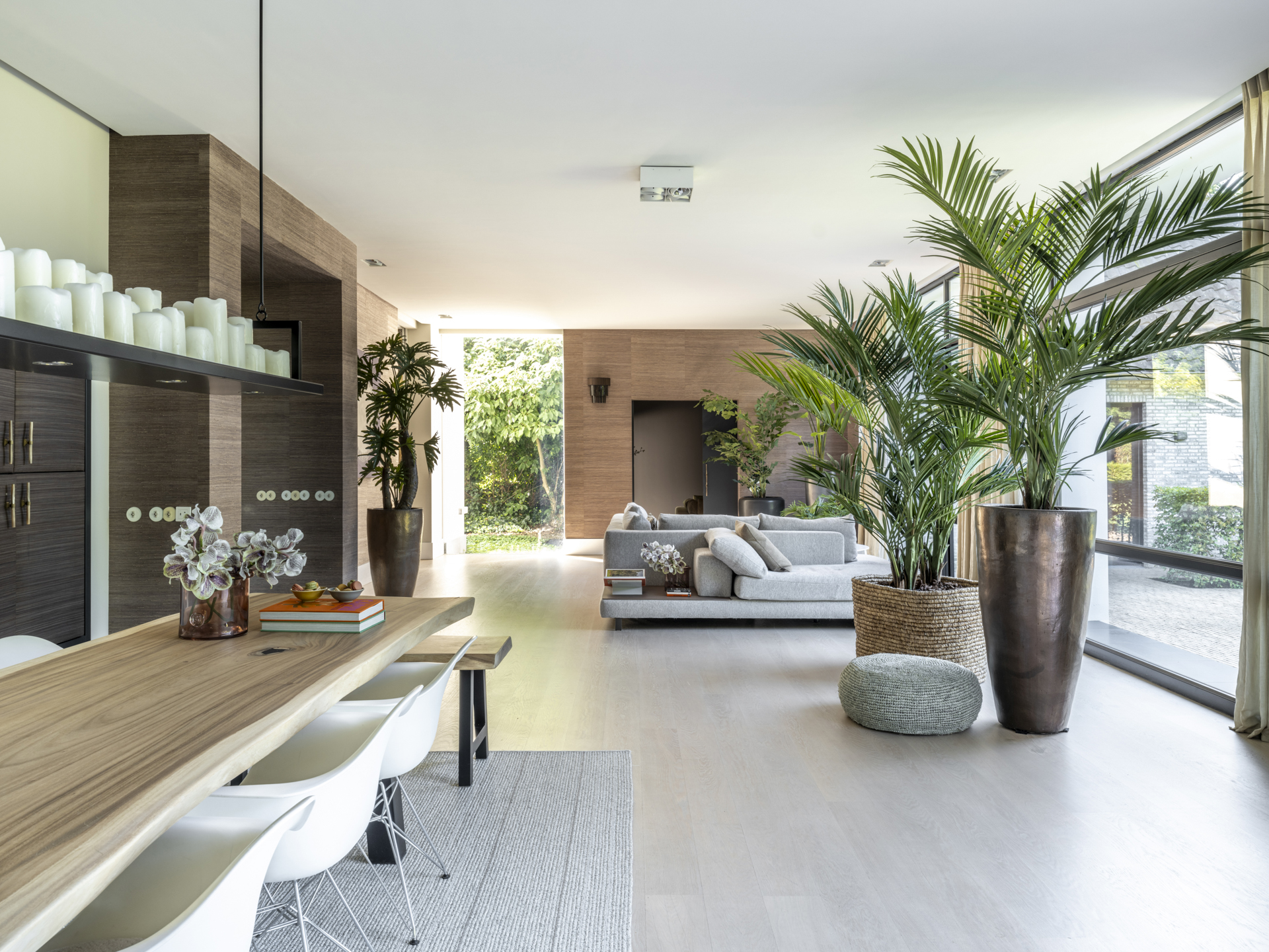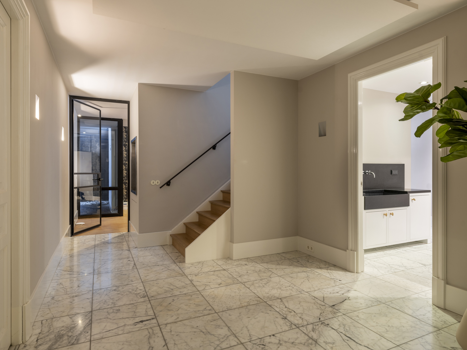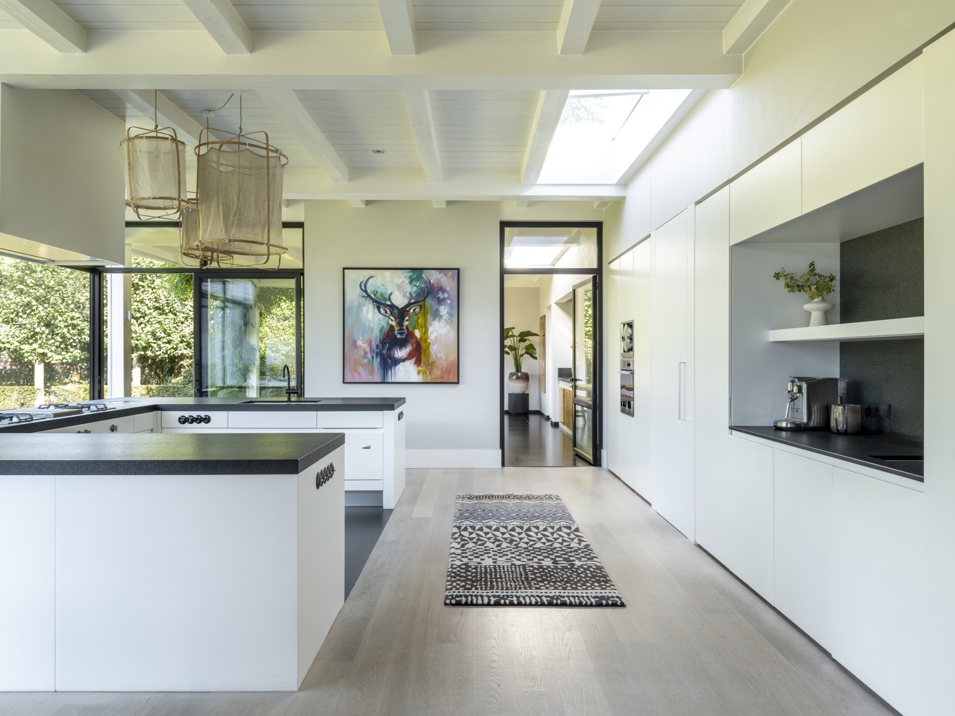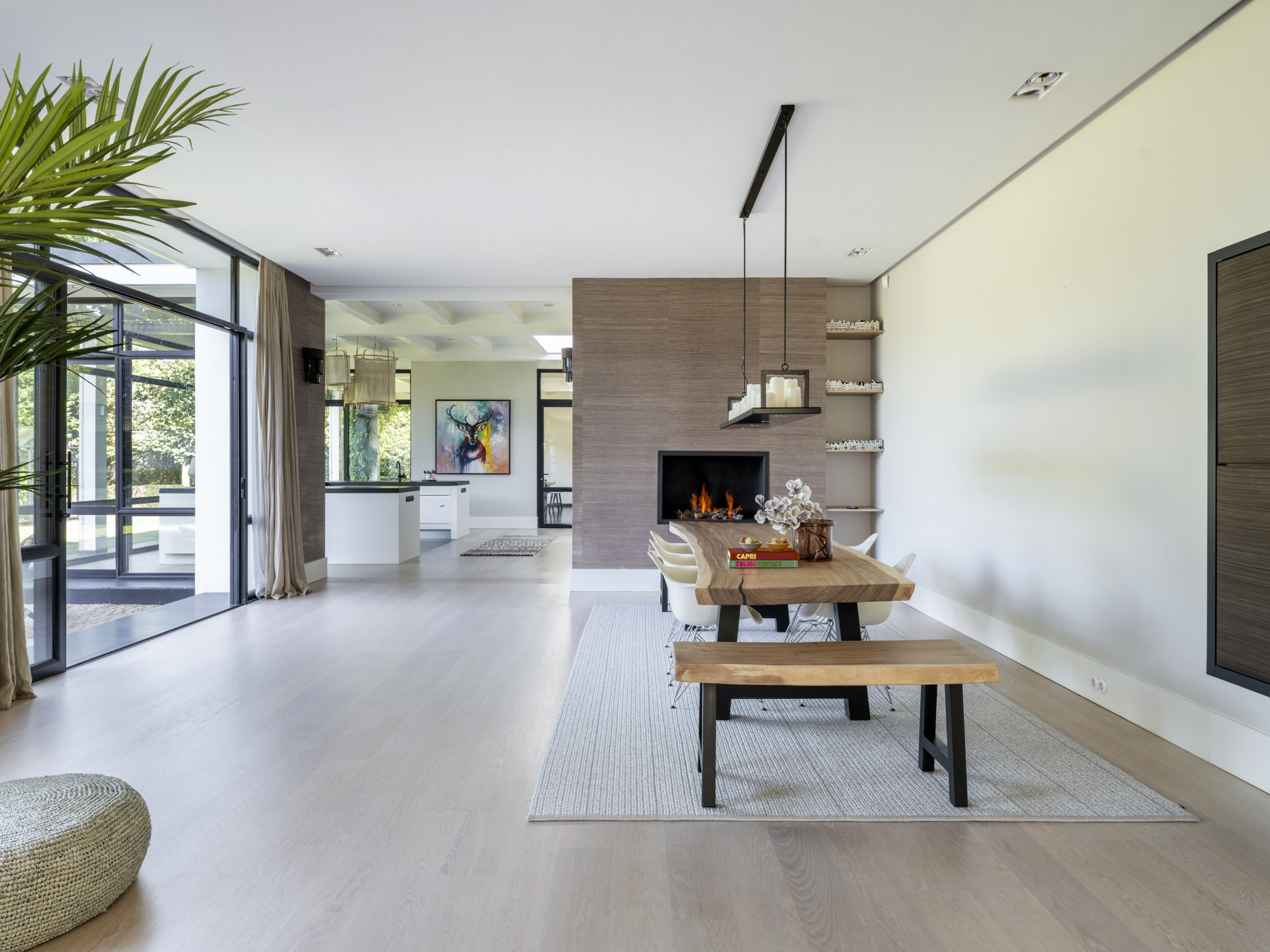 From the classic entrance, you can access the practical mudroom with a side entrance and the living and dining room. This bright and open living space connects two side wings and features beautiful light and a lovely view of the entire garden. Activity and warmth are centered around the kitchen (with an adjacent spacious and practical utility room) and the covered terrace. At the front, adjacent to the living area, you will find a separate TV/work room overlooking the courtyard.