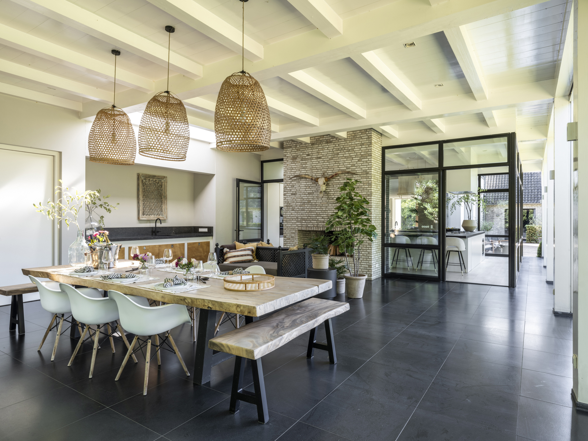 Adjacent to the kitchen is the generous, fully covered terrace, the veranda. This veranda, like the kitchen, is equipped with screens and is effectively an extension of the living area, featuring a cozy open fireplace. Next to the veranda is the (outdoor) bathroom with a toilet and shower.