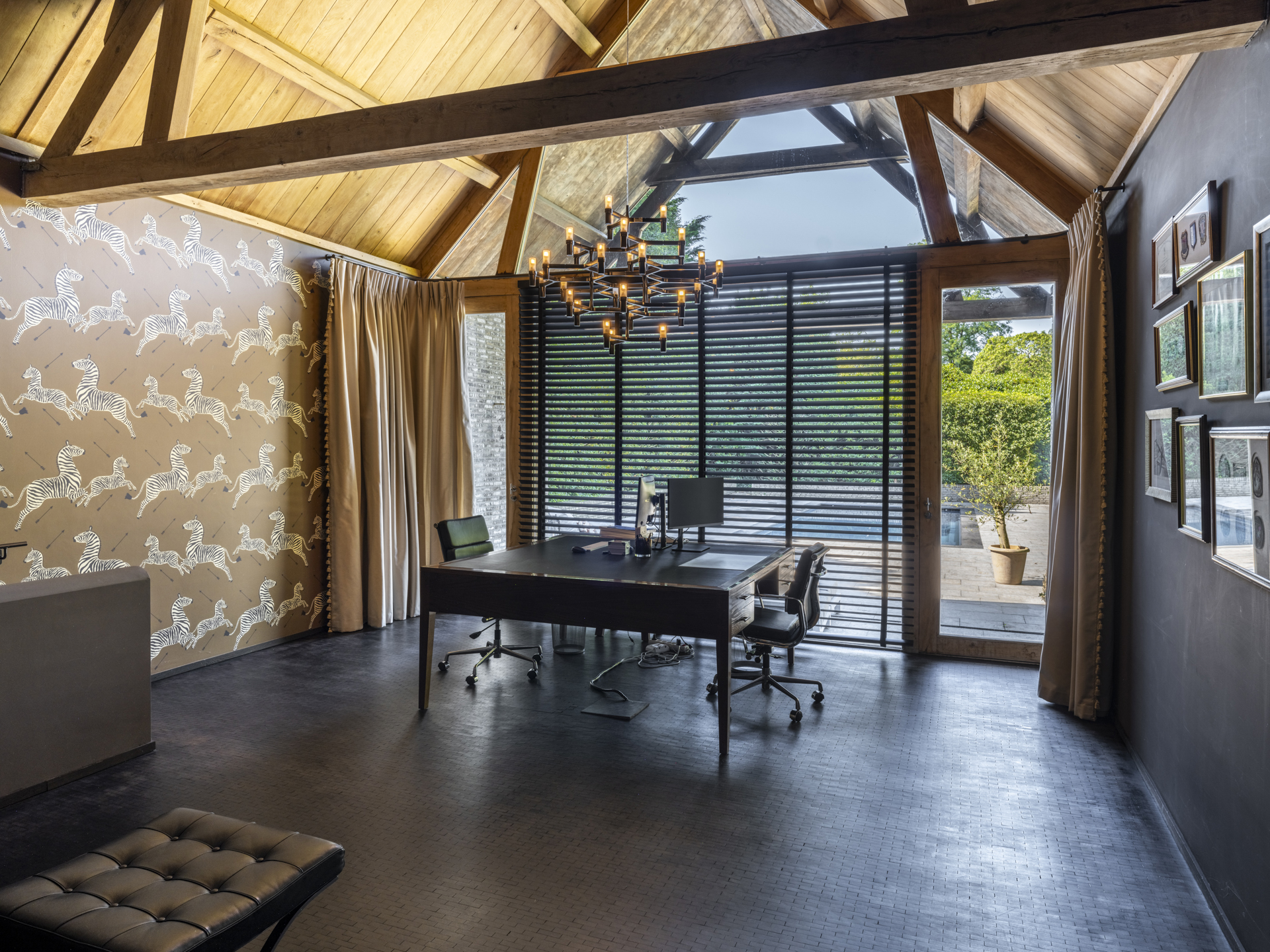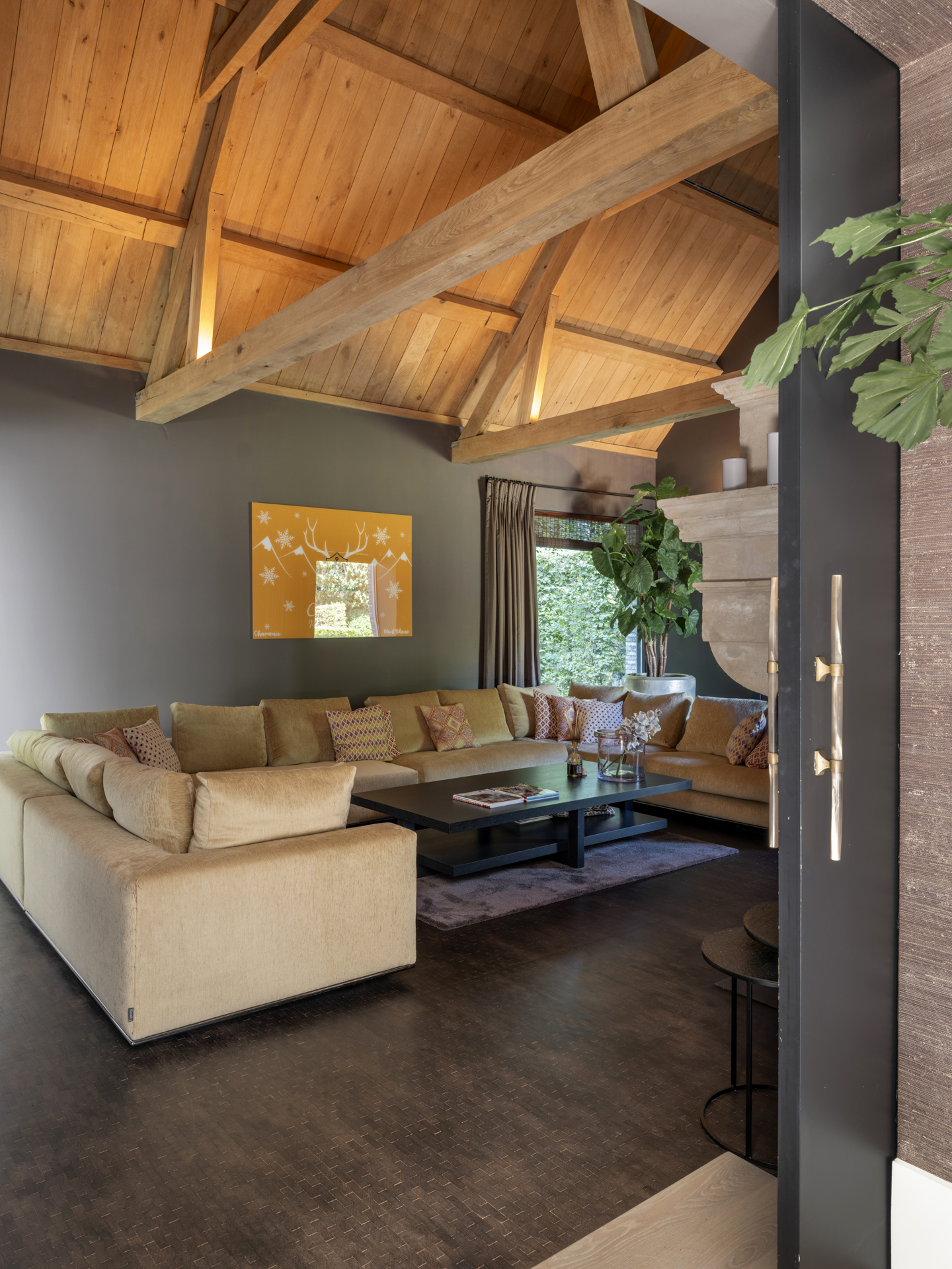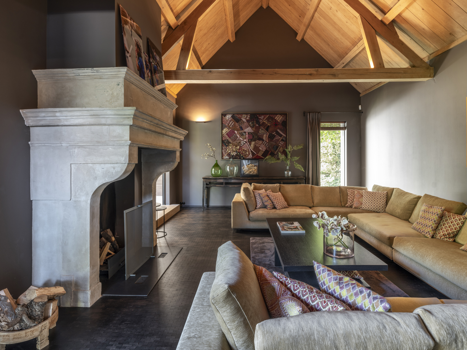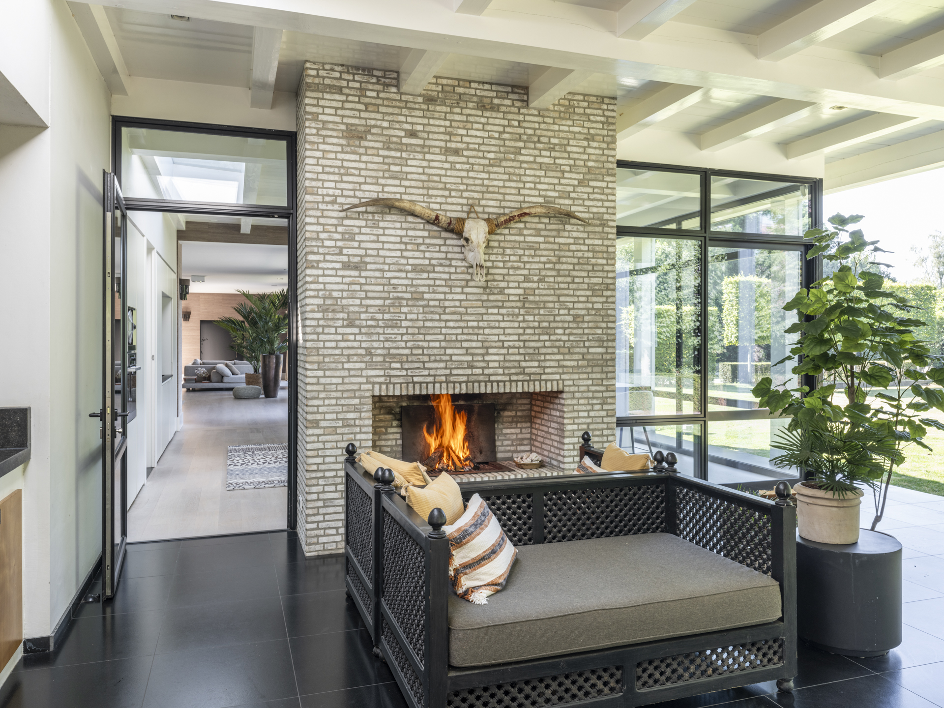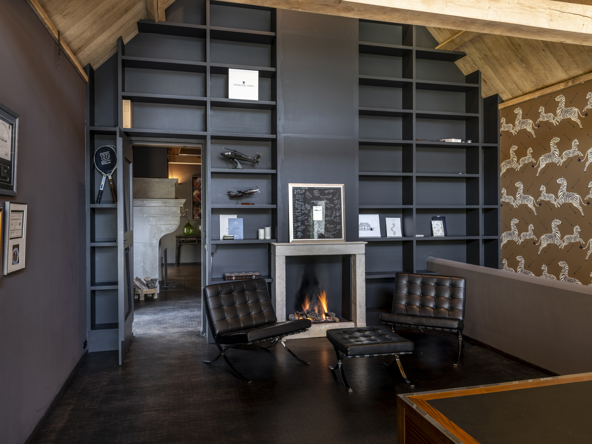 The left wing is a place to work and relax, with a charming study at the back of the house. The cozy fireplace room connects the living room and the study.