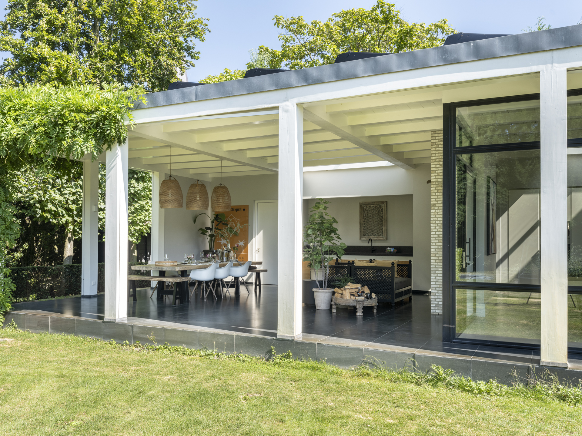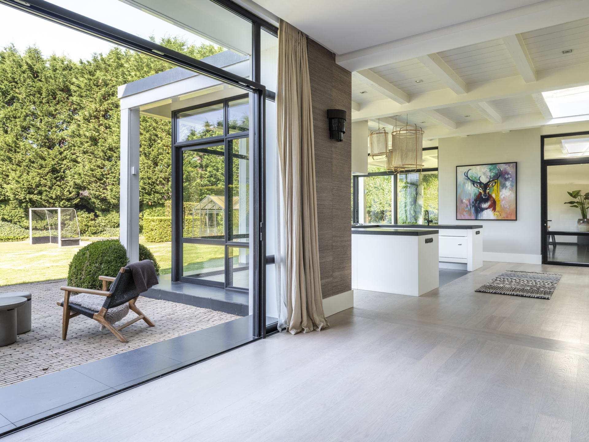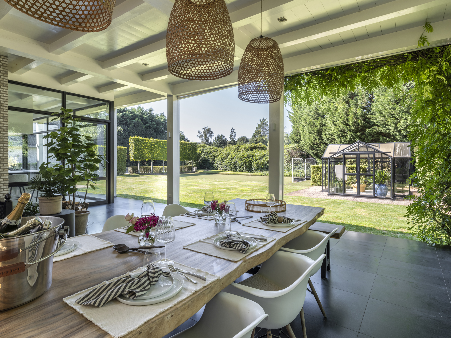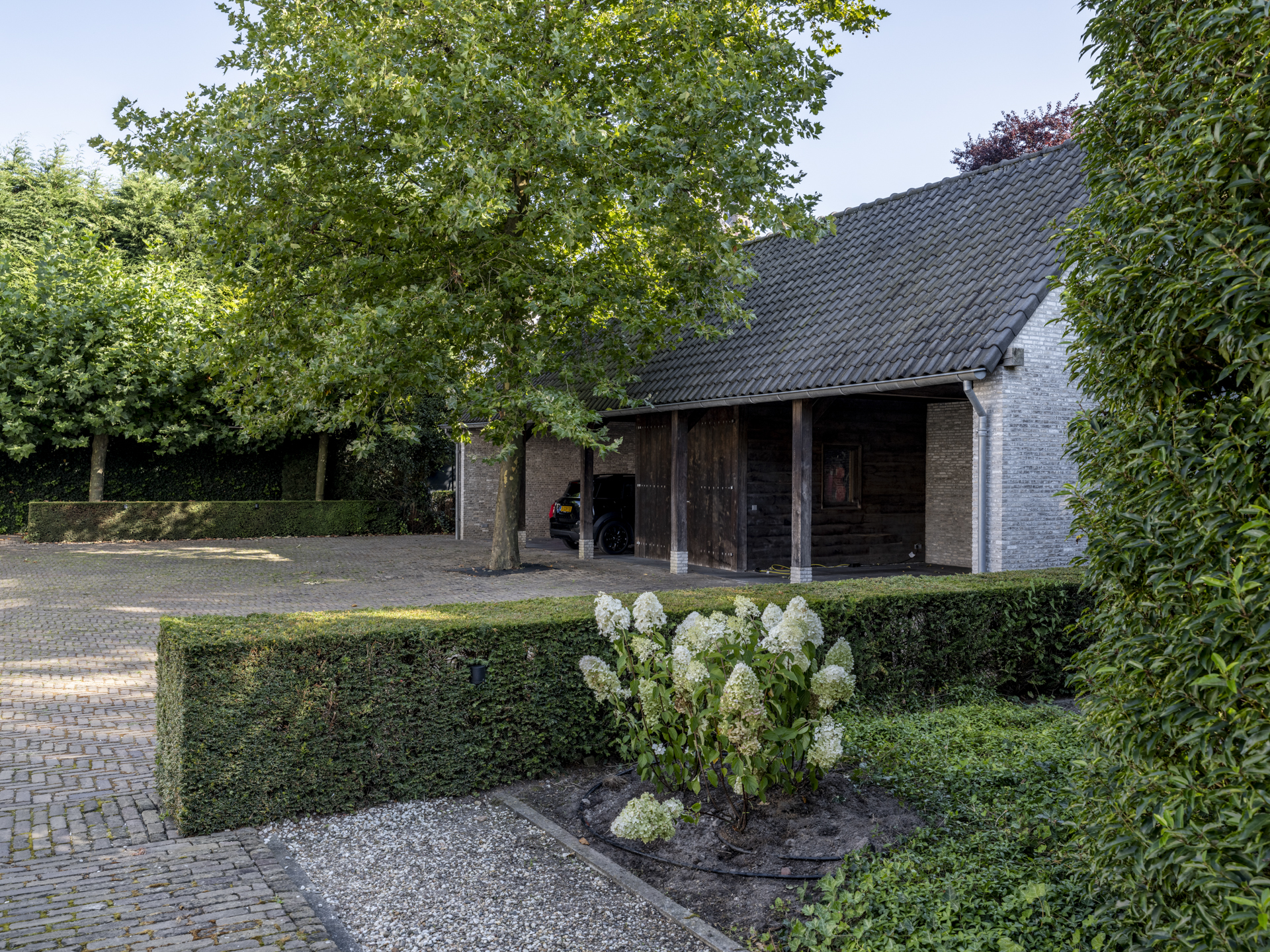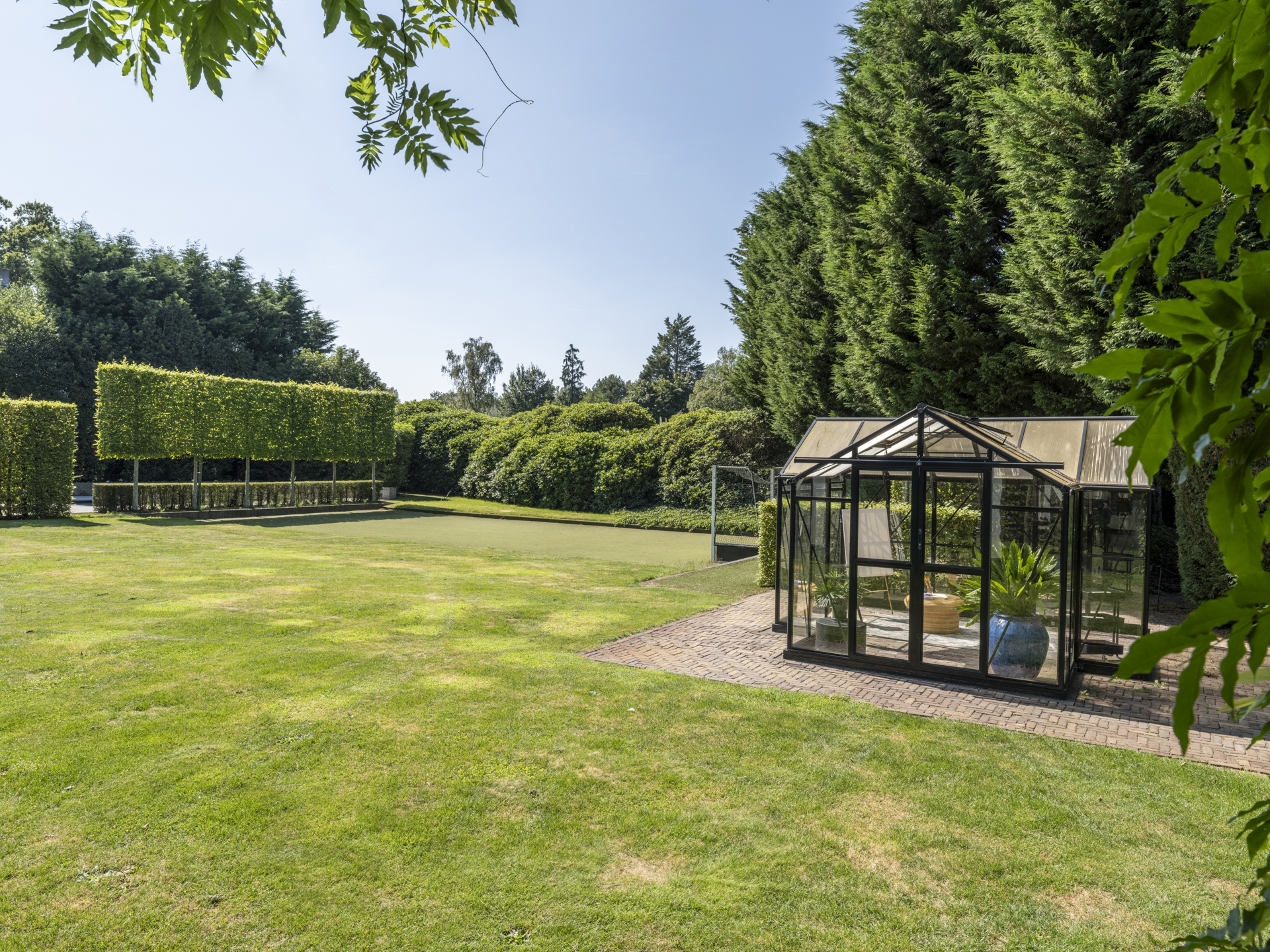 The swimming pool is slightly hidden from view by a hedge. From the kitchen, you can access the spacious covered terrace, where you feel transported to the south of France. Sheltered from rain or hot sun, you enjoy a wonderful view over the beautiful garden, where children can play on the synthetic grass hockey field. A drainage system has been installed in the garden.