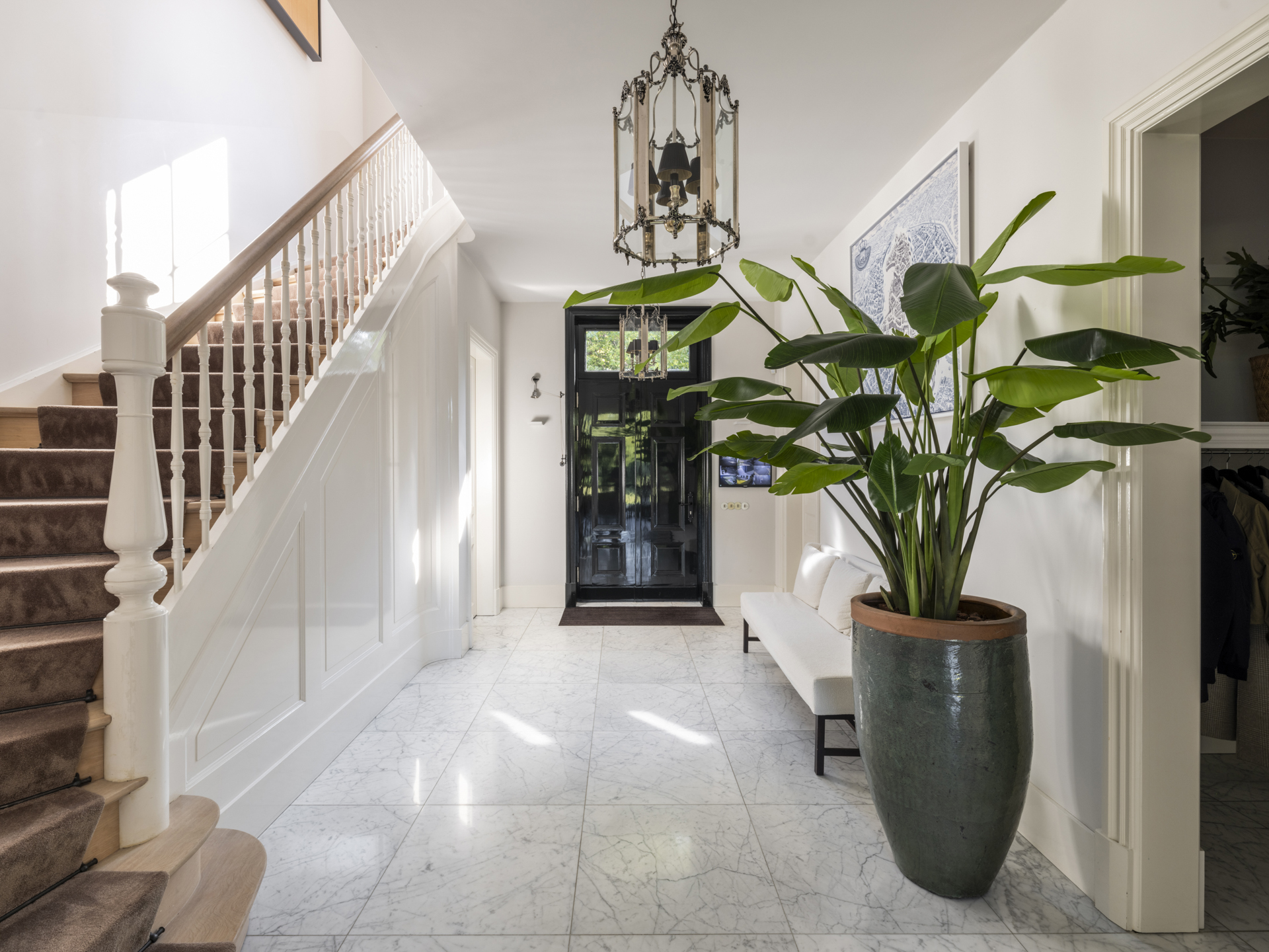 At the front, in the courtyard, you will find the “carriage house” with a beautiful (oak) roof structure, accommodating 4 cars. The front exudes the atmosphere of the charming, cozy Ginneken, while at the back, you can enjoy the peace and greenery of a country villa. Sitting on the terrace and in the garden, you see nothing but greenery and beautiful skies; no surrounding buildings.