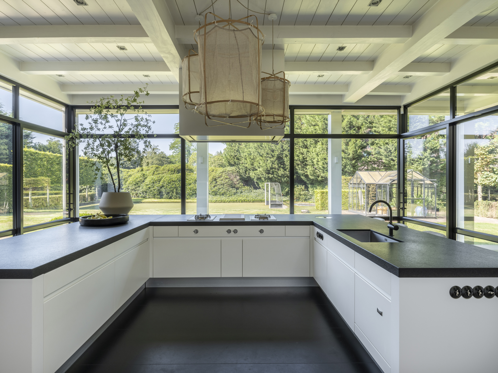 The kitchen is designed with a very luxurious setup and is equipped with all conveniences and appliances. The glass walls around it make it feel like you are cooking 'in the garden.'