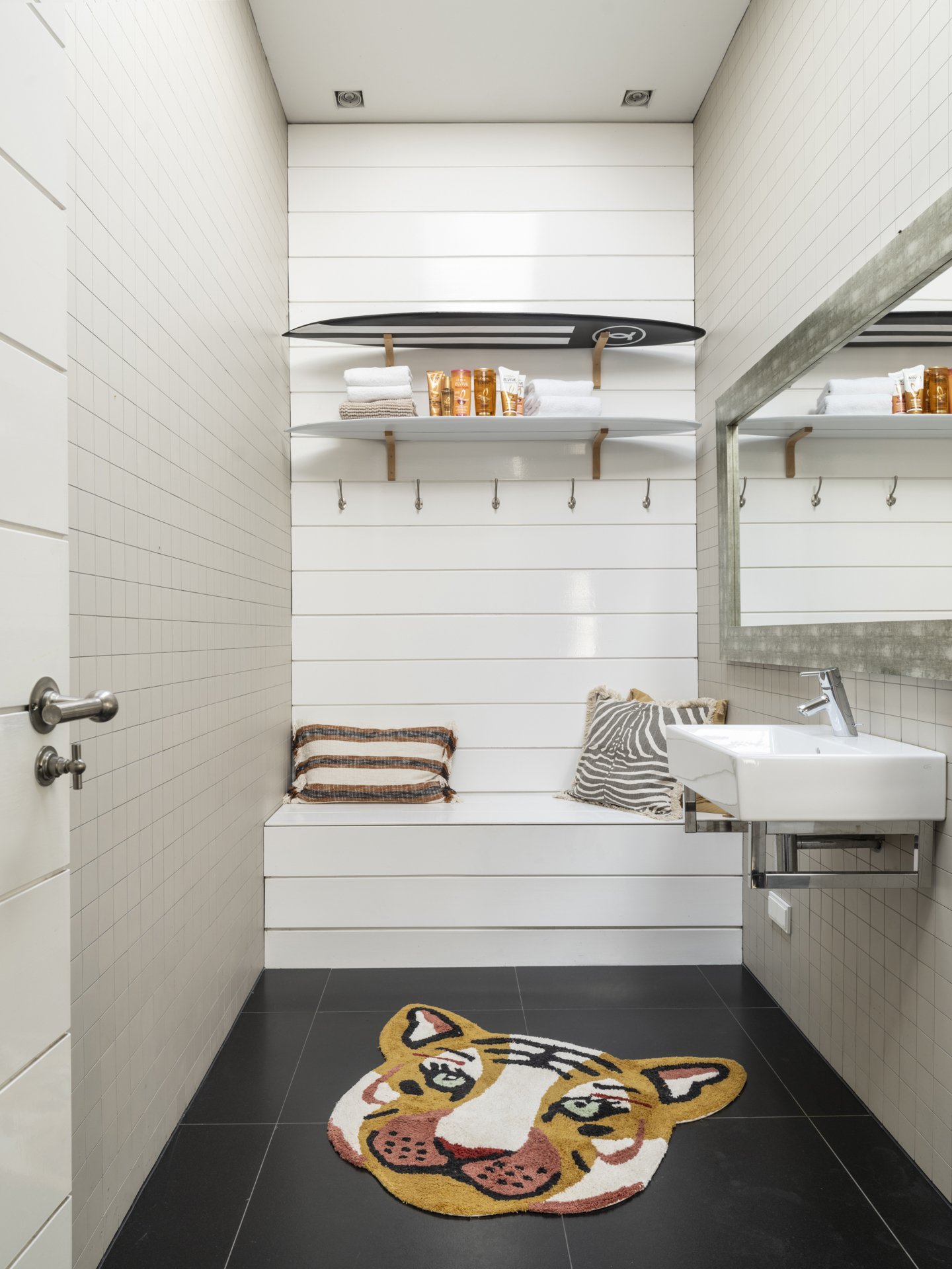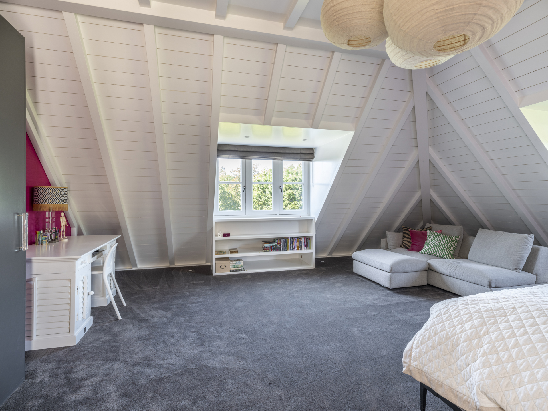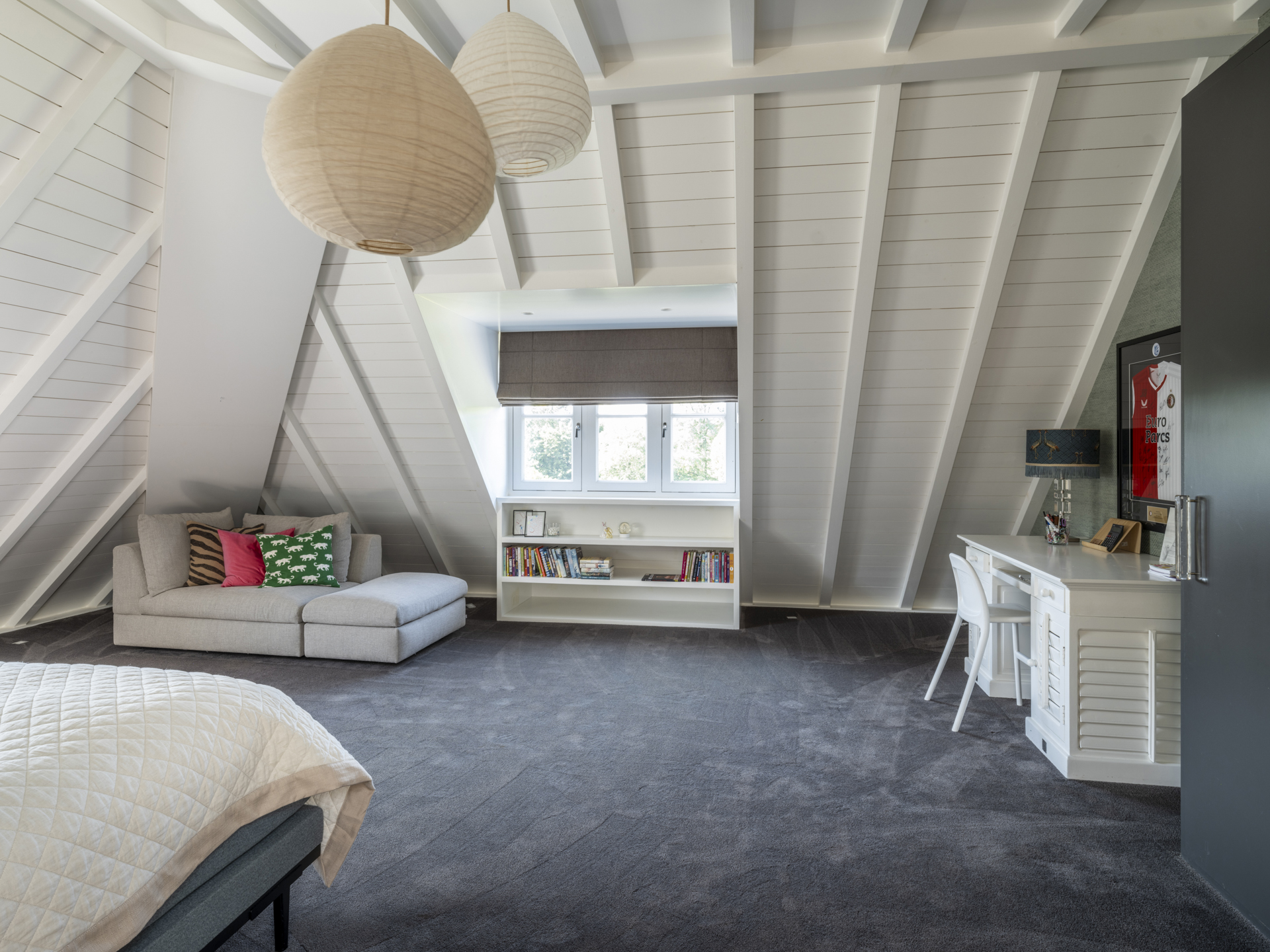 The other side of the floor is for the children; the two bedrooms have their own beautifully finished bathroom. The bedrooms are situated at the front and back.