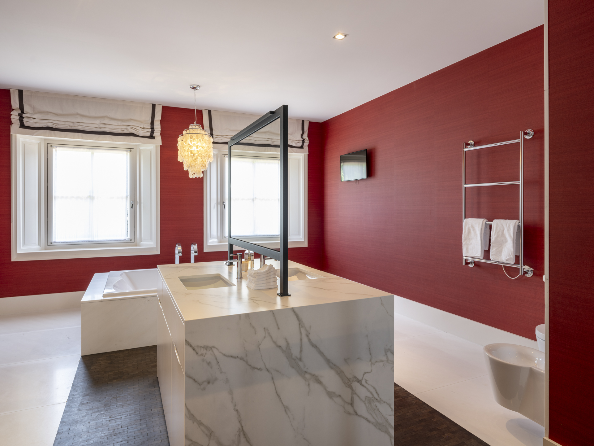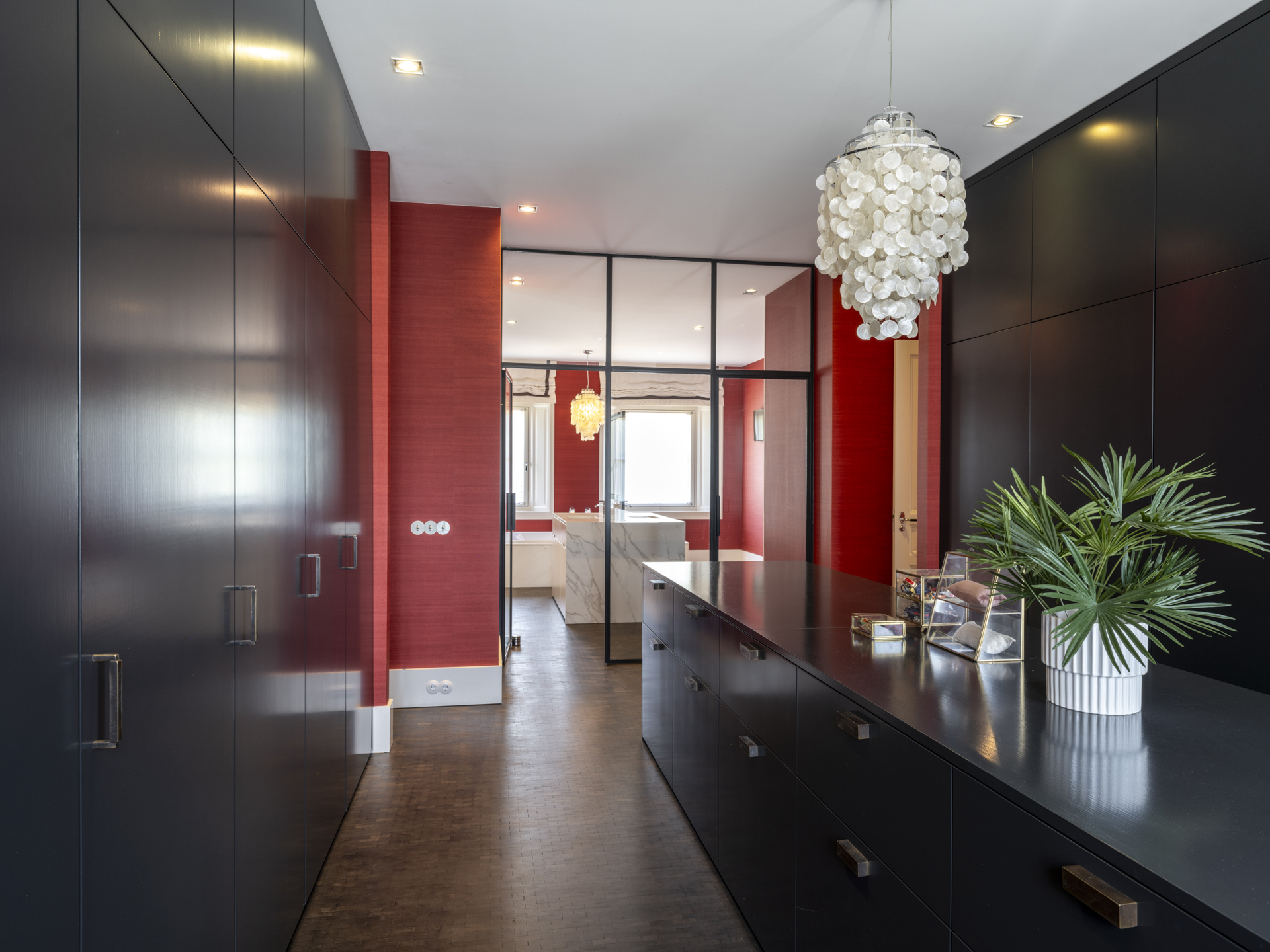 The dressing room features beautiful (custom-made) furniture with ample hanging and storage space. The bathroom is very spacious and equipped with a luxurious double bathtub, a large walk-in shower, a toilet, and a bidet.