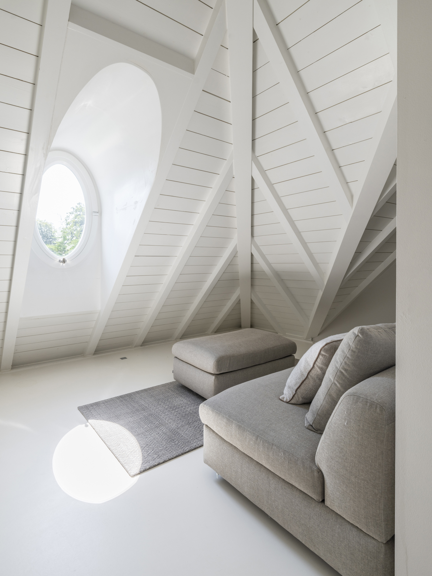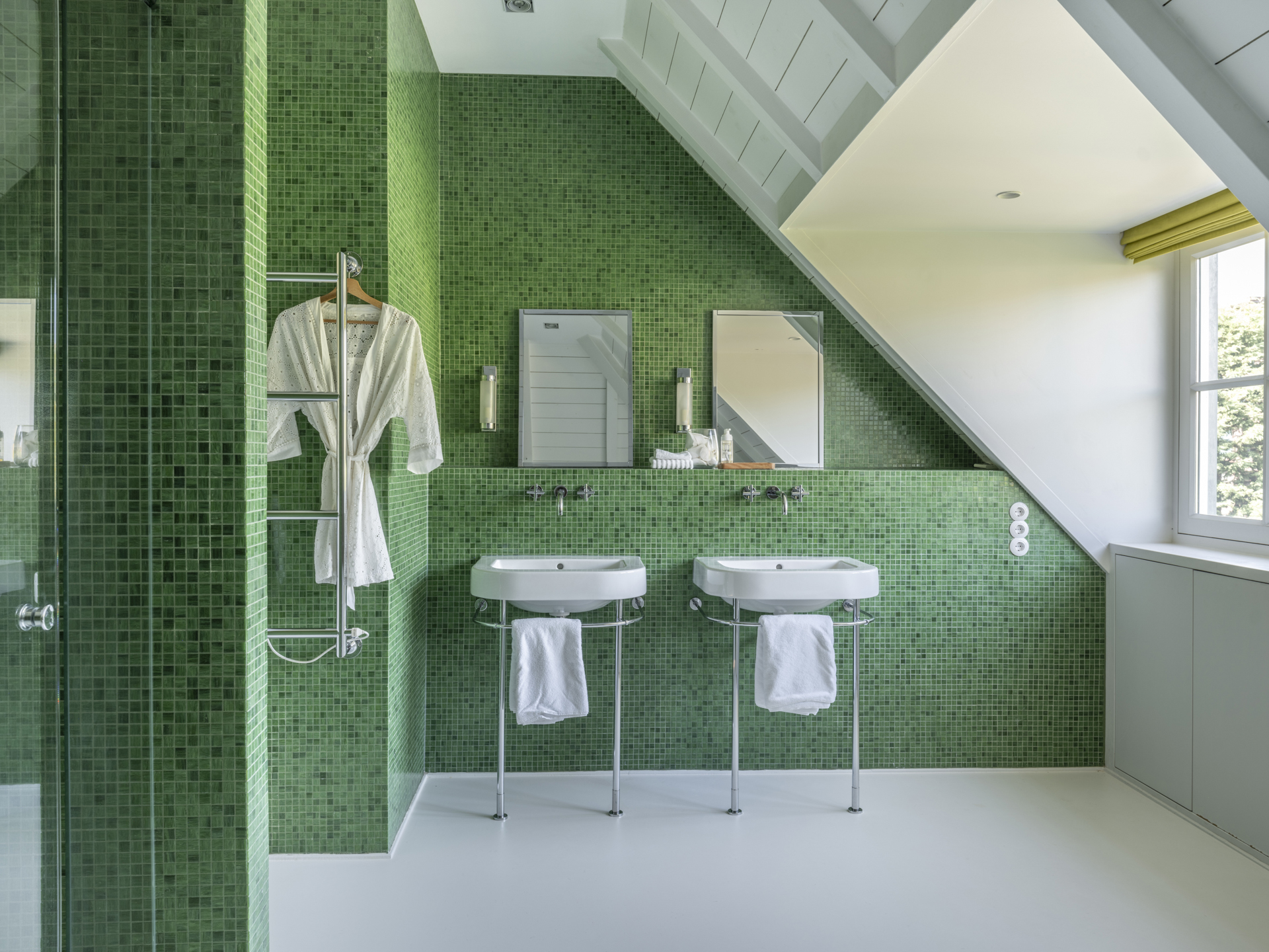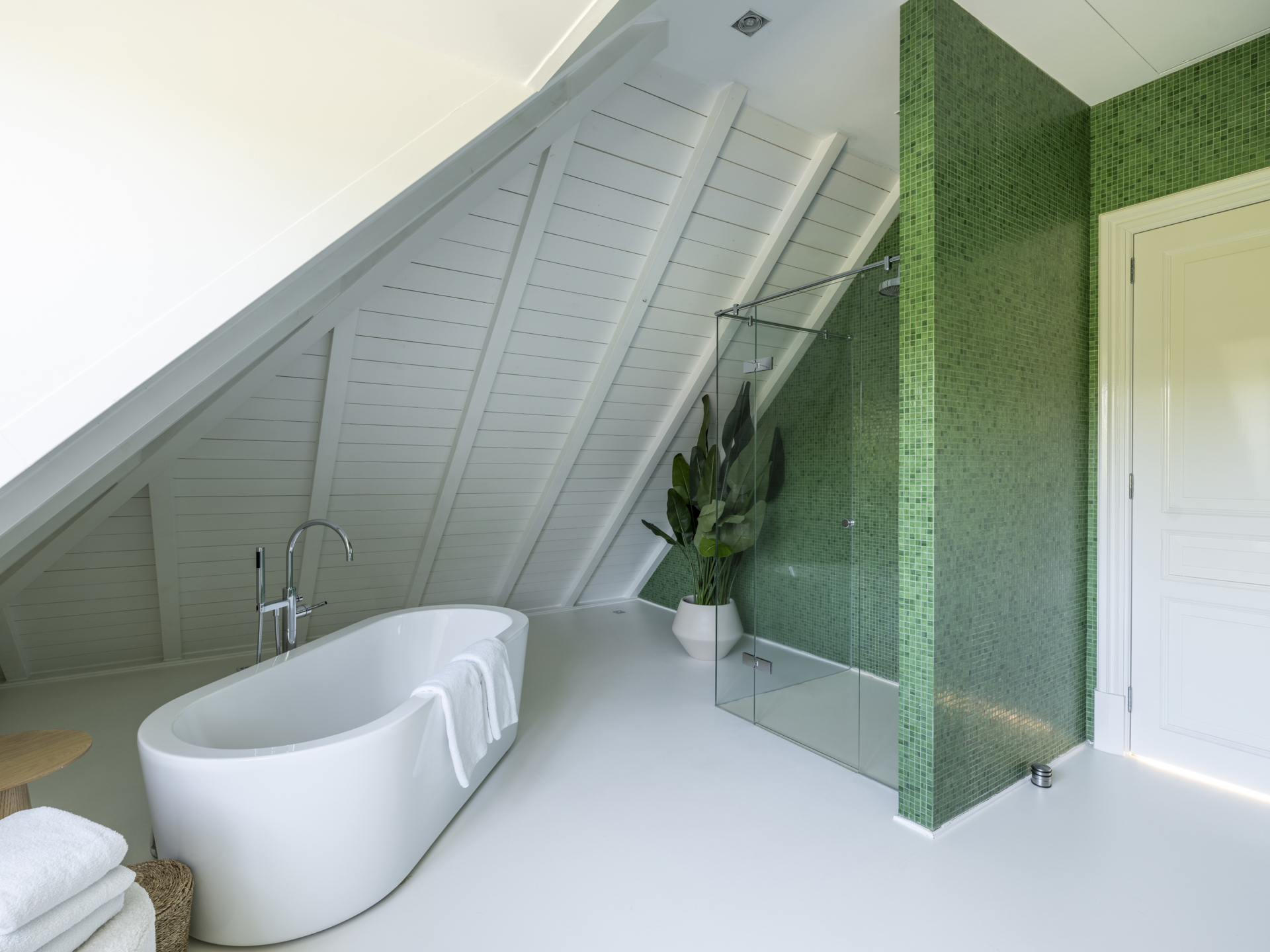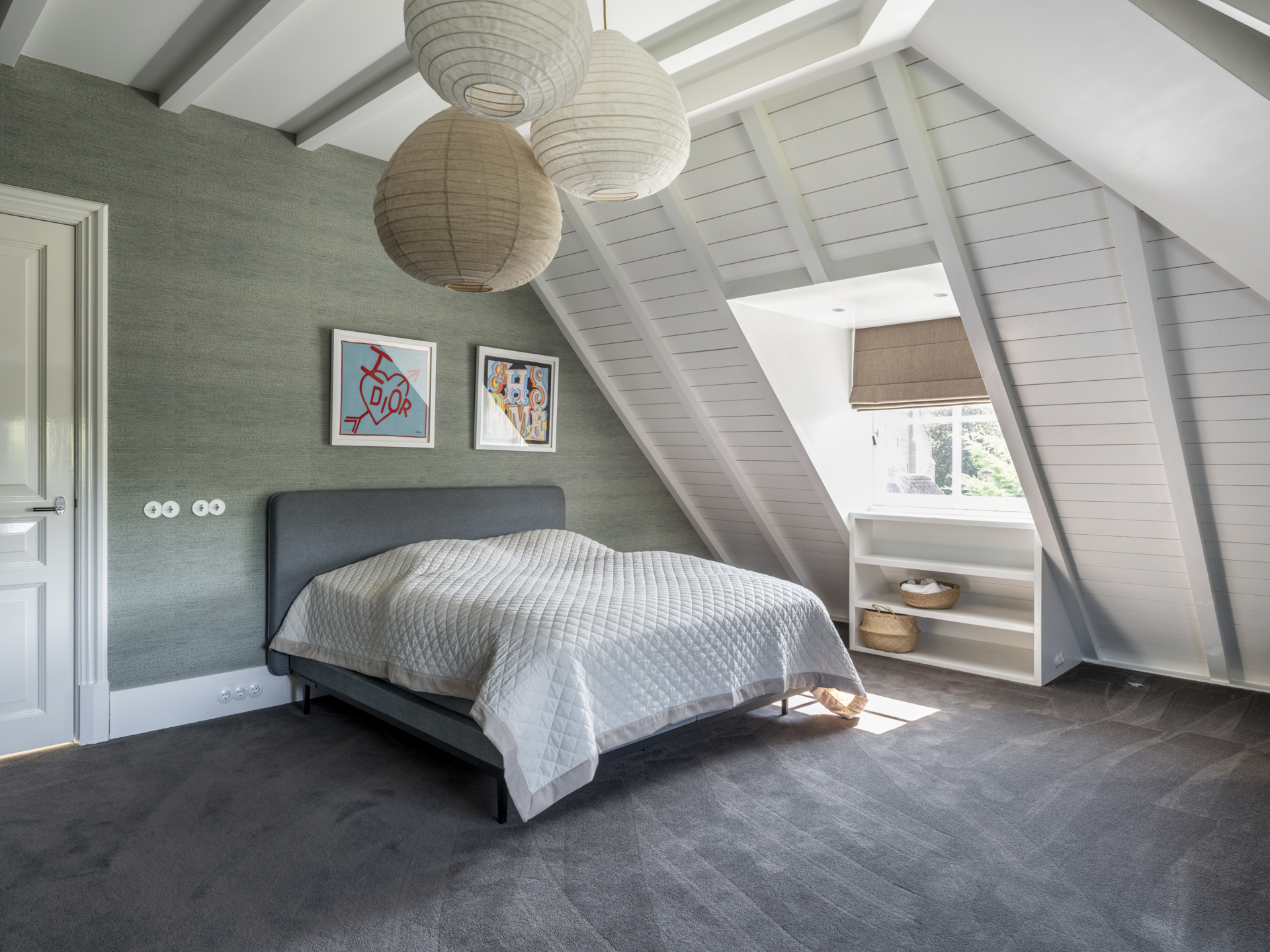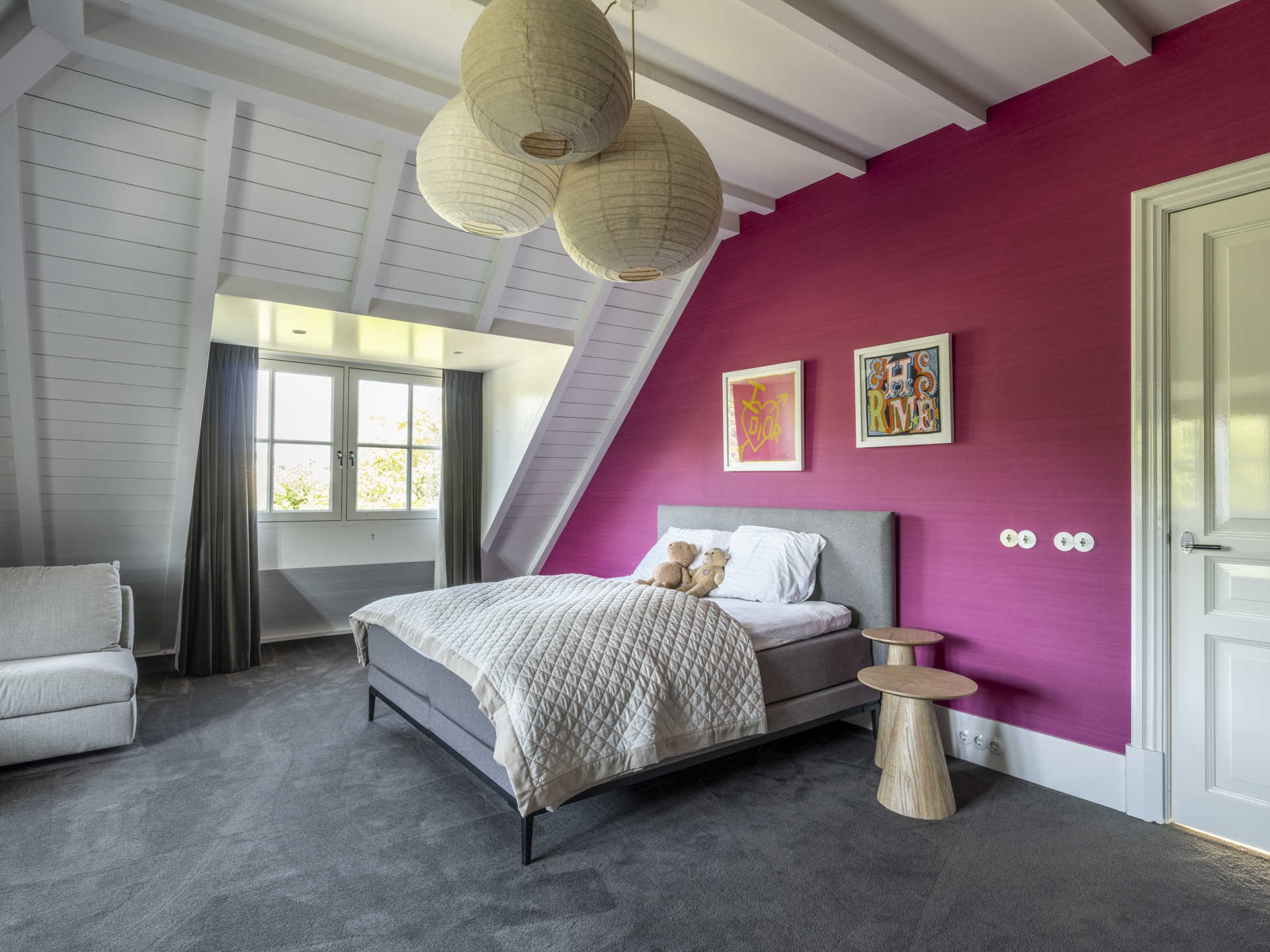 This cozy 'attic' level includes two spacious bedrooms located at the back and a separate, stylish bathroom. Additionally, there is a guest room with its own bathroom on this floor.