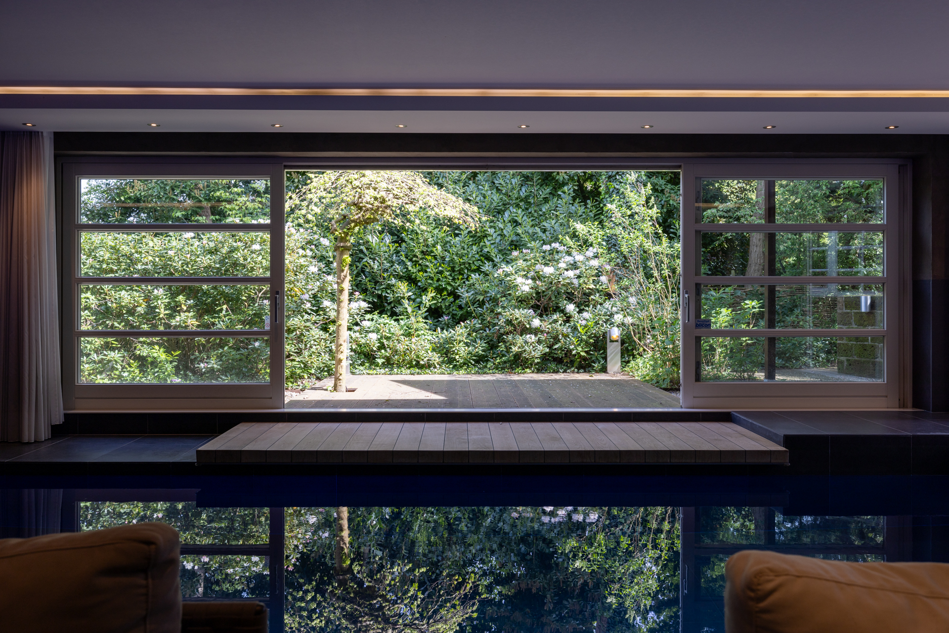 Wellness is at the heart of this villa. A dedicated suite includes a heated indoor pool with jet stream, sauna, rain shower, and relaxation area, opening via sliding doors onto the terrace and gardens. Fitness and office spaces are positioned for flexible, secluded work or recreation.