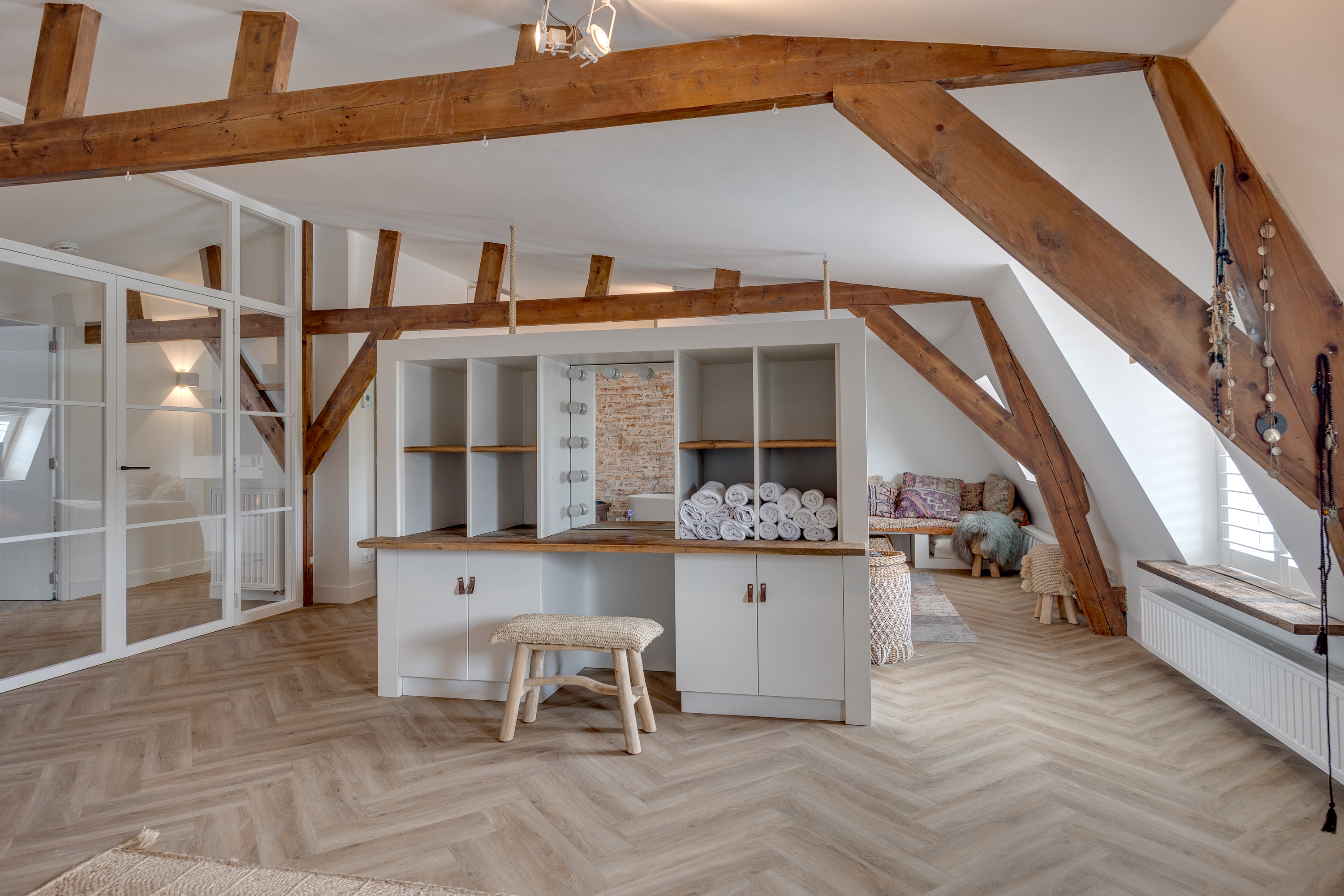 The spacious living room at the front is a real eye-catcher, with large windows that provide an abundance of natural light and offer a beautiful view of the lively Kerkbrink. The stylish PVC flooring that runs throughout the entire living area is immediately noticeable. This flooring combines a warm, soothing look with practical features such as durability and ease of maintenance. It forms the perfect basis for any interior. The modern gas fireplace creates a cozy ambiance, ideal for atmospheric evenings. In addition, the air conditioning ensures that the indoor climate remains pleasant throughout the year. Everything about this floor exudes comfort, style, and luxury.