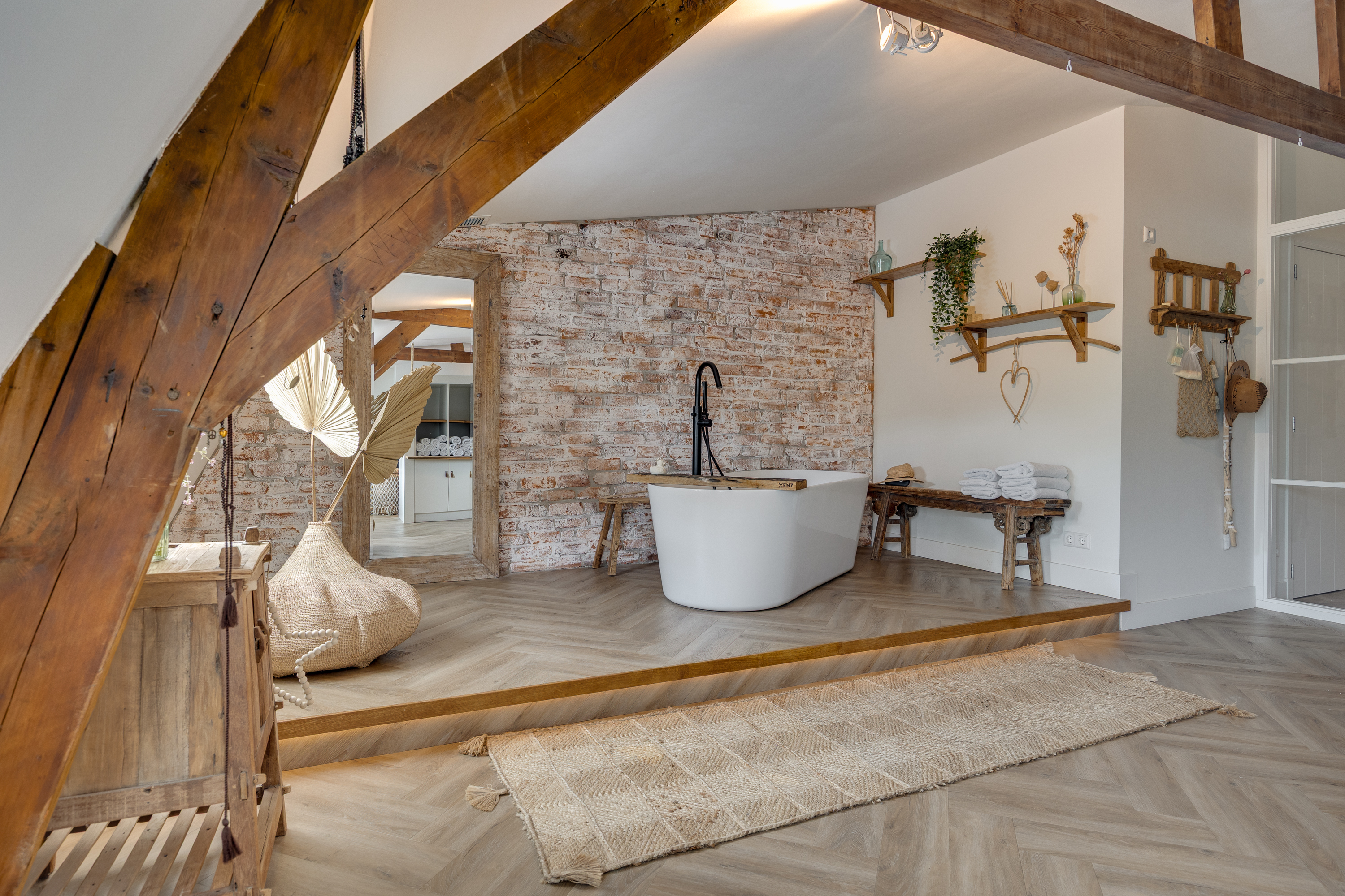There is also a second bathroom with a walk-in shower, washbasin, toilet, and space for a washing machine and dryer. An additional separate toilet is located on the landing. Authentic wooden beams have been left exposed and provide an attractive contrast to the modern finish.