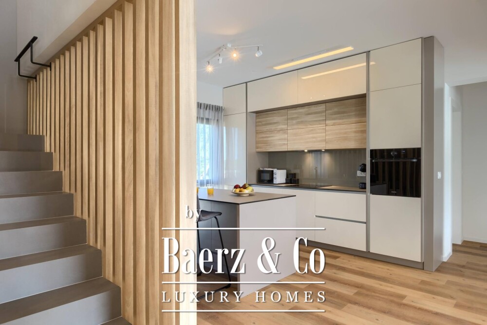 Townhouse Brtonigla is set in the heart of this picturesque Istrian town, surrounded by expansive greenery and mature olive groves. The property offers 274 m² of living space across two levels. The entry leads to an open-plan living room, a modern kitchen and dining area, and a bedroom suite with direct pool access. Practical features include a storage room, technical facilities, and a guest toilet with laundry.