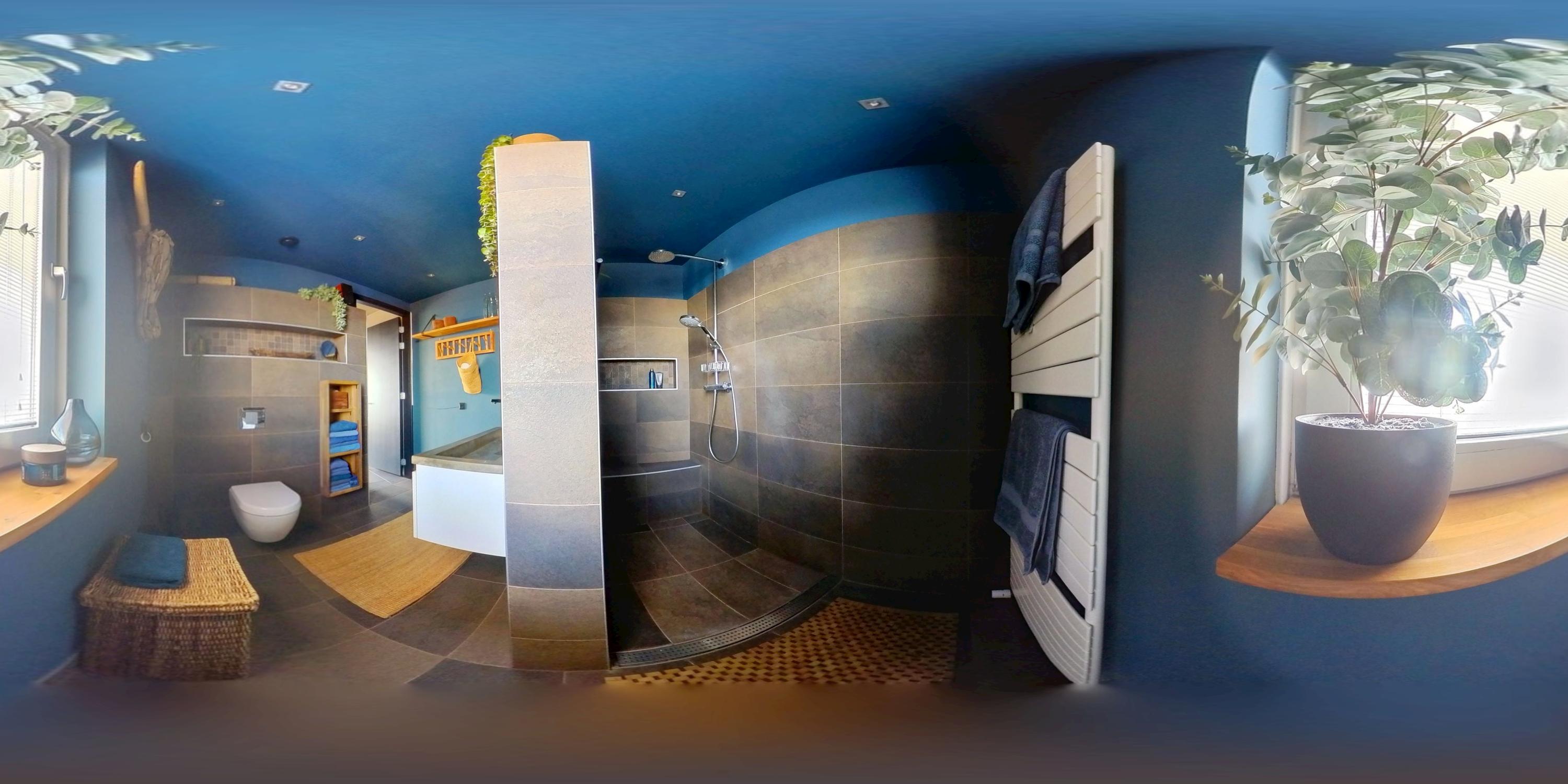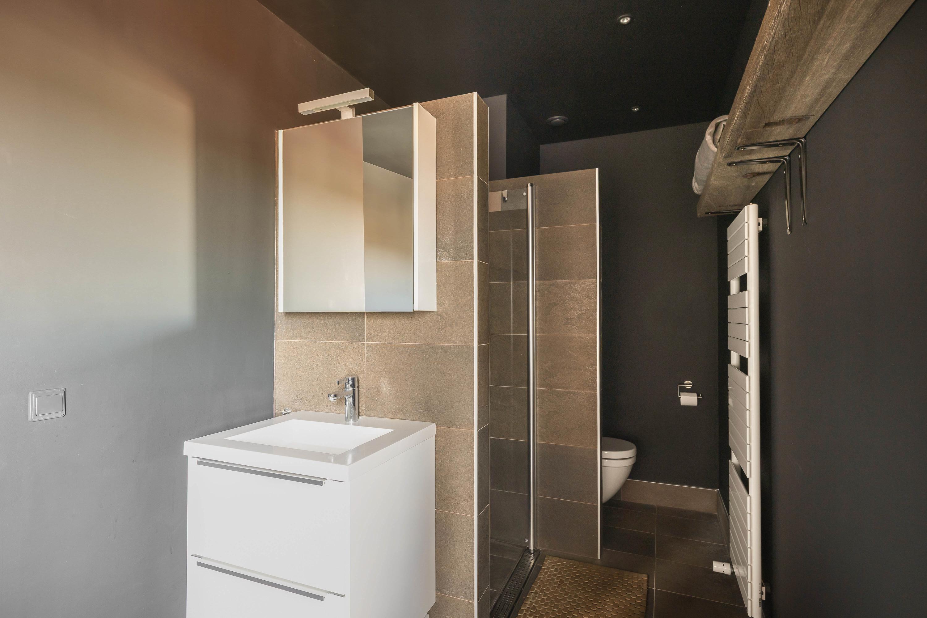 A connecting hallway leads to the second bedroom, also with an en-suite bathroom (walk-in shower, third toilet, sink unit, and designer radiator). Here you’ll also find the second main entrance to the penthouse.