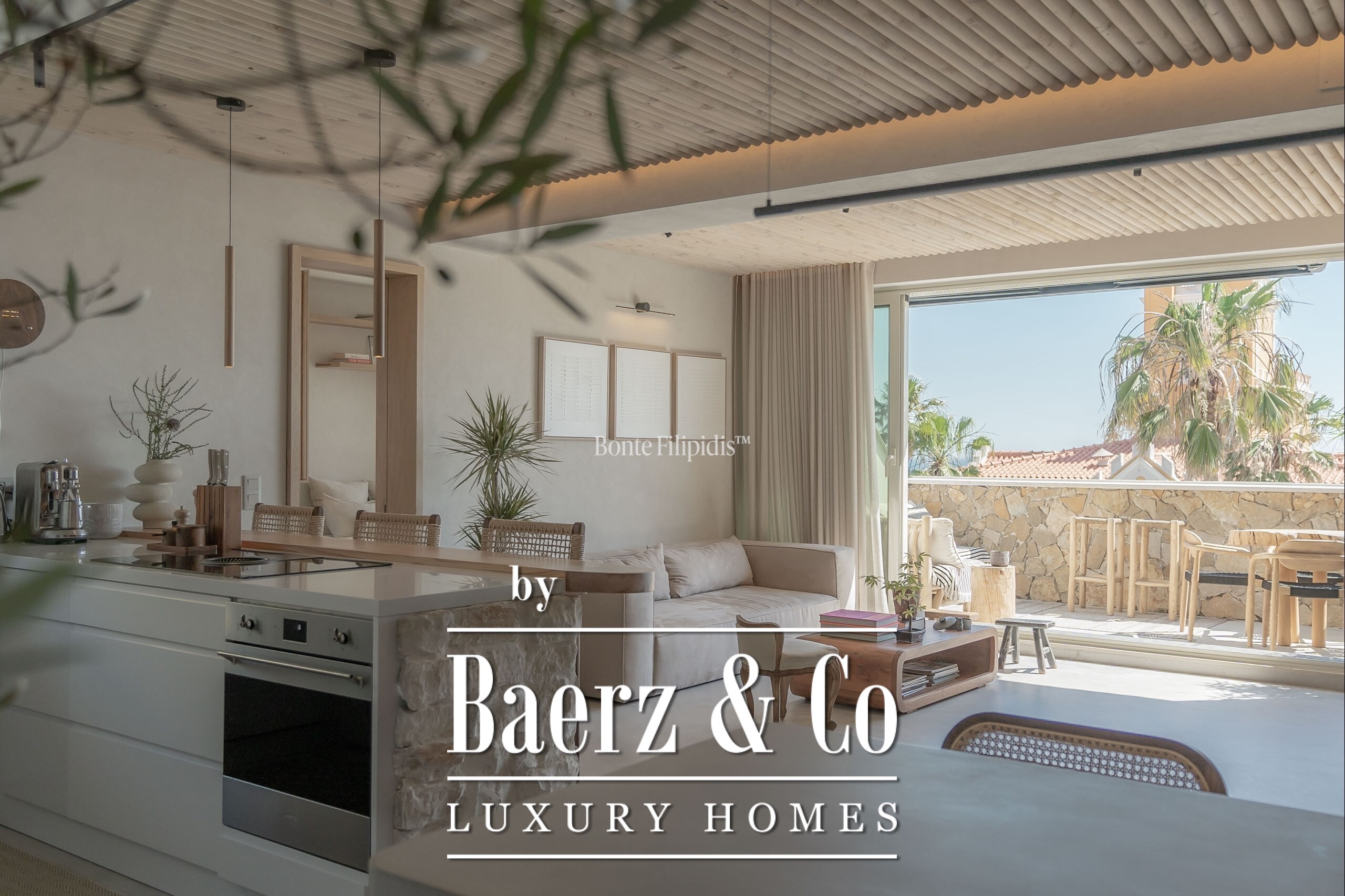 The 88 m² layout offers a seamless flow between the open-plan living room, dining area, and kitchen, all with high-quality finishes and fully integrated appliances. The living room leads to a 19 m² terrace featuring a bar as well as an outdoor shower for cooling off under the sky, offering a calm vantage over the bay. In the private area, the en-suite bedroom ensures privacy, while the second bedroom features sea views, its own balcony, and an independent, full bathroom.