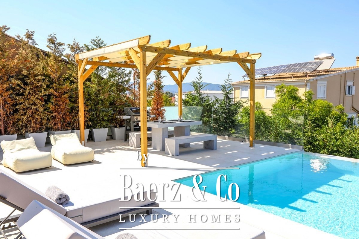 Villa Corfu offers a refined, contemporary statement in the northeast of the island, combining 497 m² of sophisticated living space with panoramic Ionian Sea views. This villa occupies a privileged plot of 1,073.59 m² in Alykes Potamou, less than four kilometers from Corfu town, the port, and international airport. The villa’s setting on a gentle hill assures privacy, with seamless access to renowned beaches including Kommeno and Paleokastritsa.