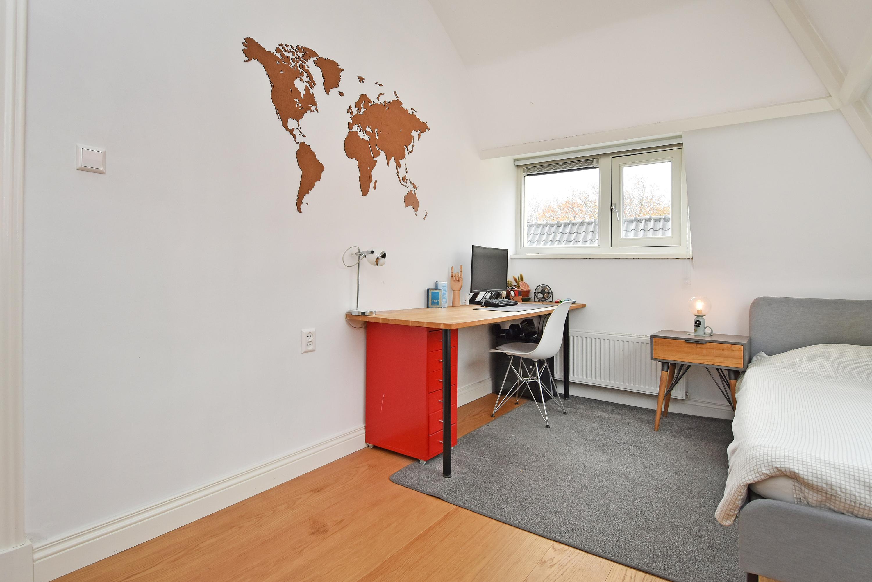 On either side of the kitchen are two inviting living areas: on one side a sitting room, and on the other a cozy living room with a comfortable seating area. Adjacent is an integrated studio, also featuring a high ceiling and French doors opening to the street. This room is arranged as a bedroom with its own bathroom, including a walk-in shower, double washbasin, and toilet—ideal as a guest suite, annex apartment, office, or practice space at home. At the rear, there is a large, practical bicycle storage room with attic space, accessible via Broerhuisstraat. From the living room, a straight staircase leads to the first floor.