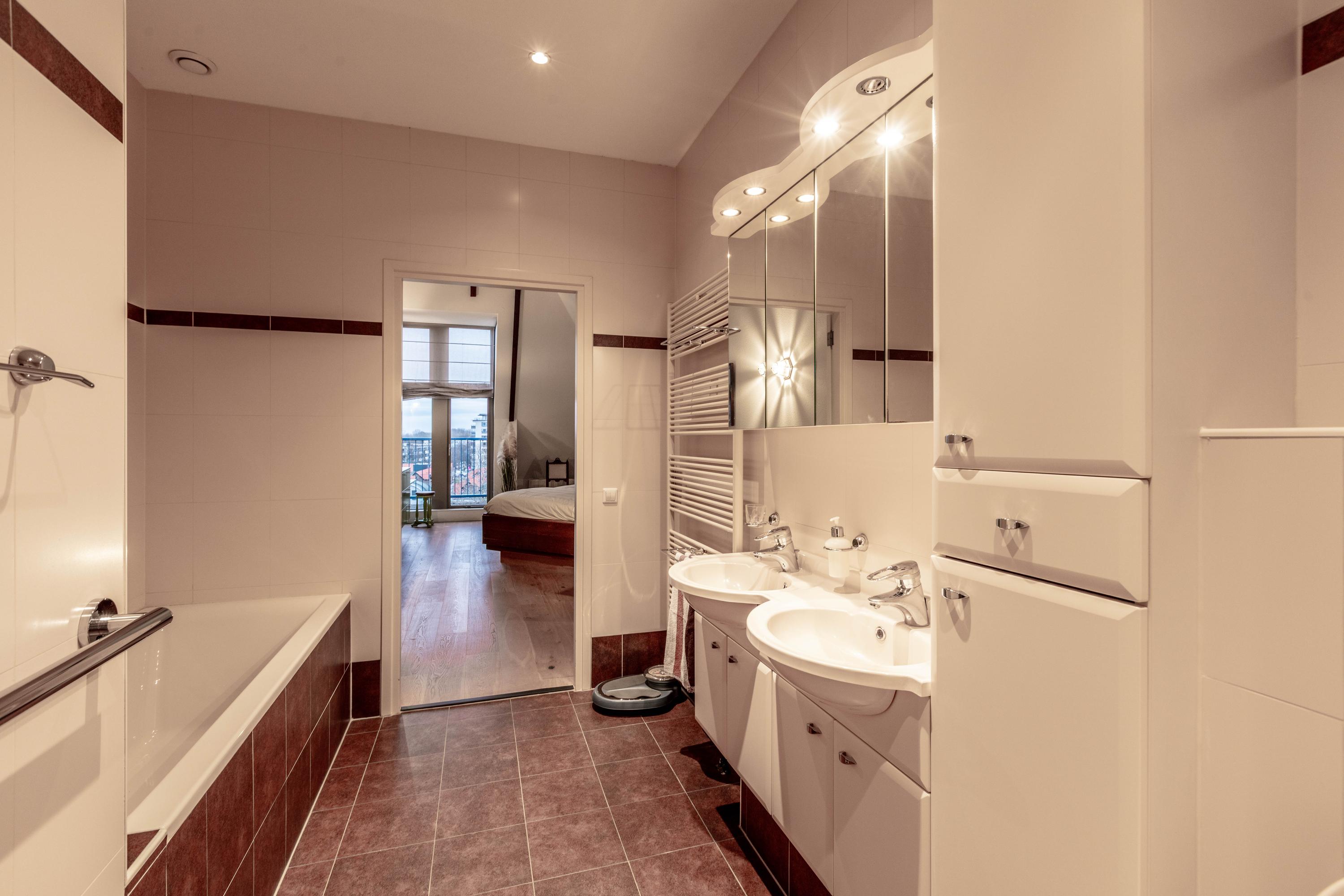 De grootste slaapkamer is in gebruik als masterbedroom en beschikt over een royale inloopkast en een aangrenzende ruime badkamer met inloopdouche, tweede toilet, bidet, ligbad en een badkamermeubel met dubbele wastafel.