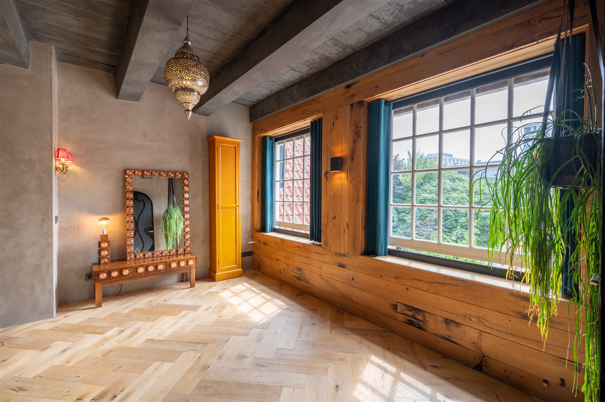 At the front: the grand living room with soaring four-metre ceilings, oak flooring, and a splendid view over the canal and the historic Armamentarium.