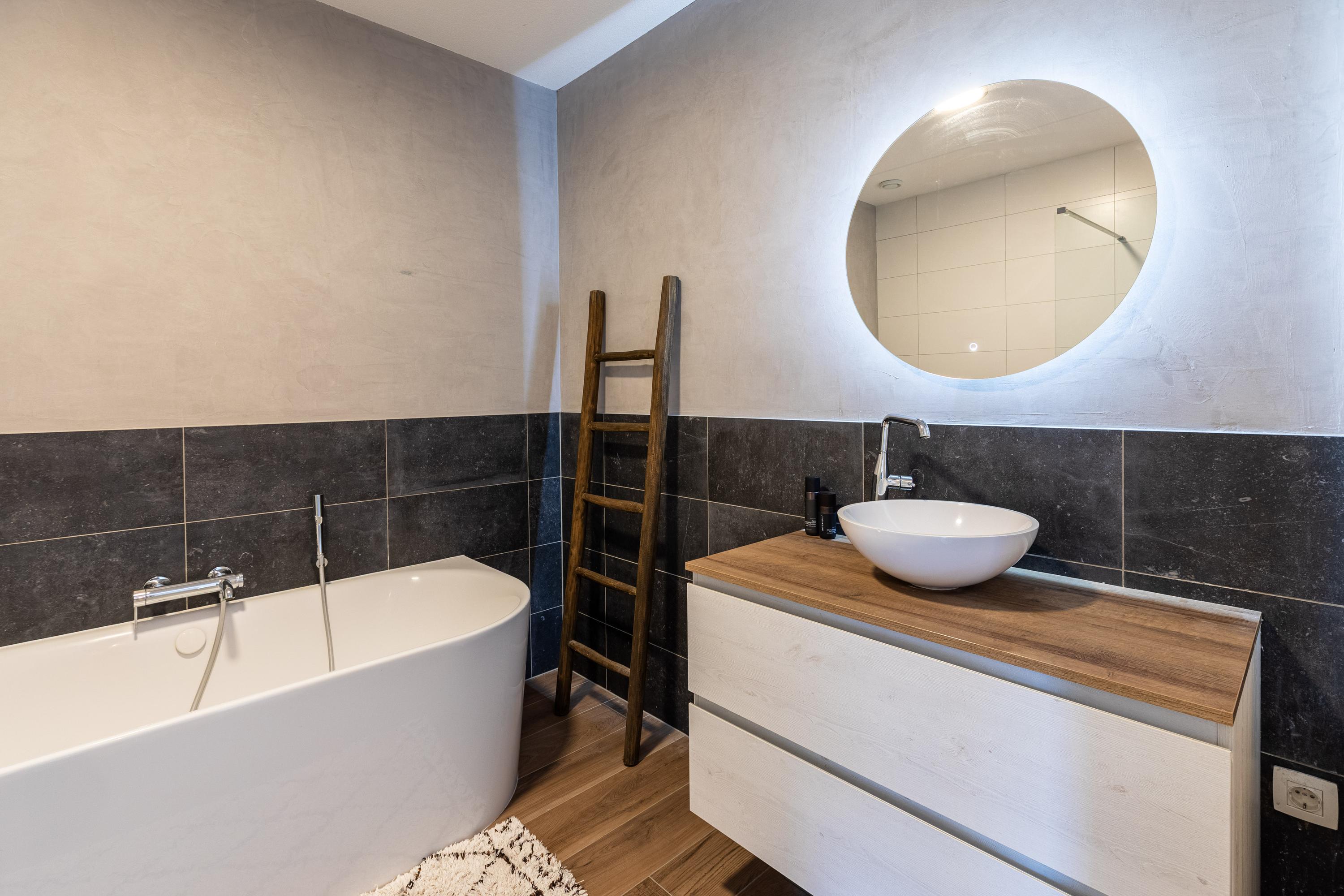 A stylish glass industrial door leads to the bright living room. At the front is the spacious open kitchen with a cooking island and various built-in appliances. The sliding doors give you direct access to the terrace in the front garden – a lovely place for a cup of coffee or a drink in the sun.