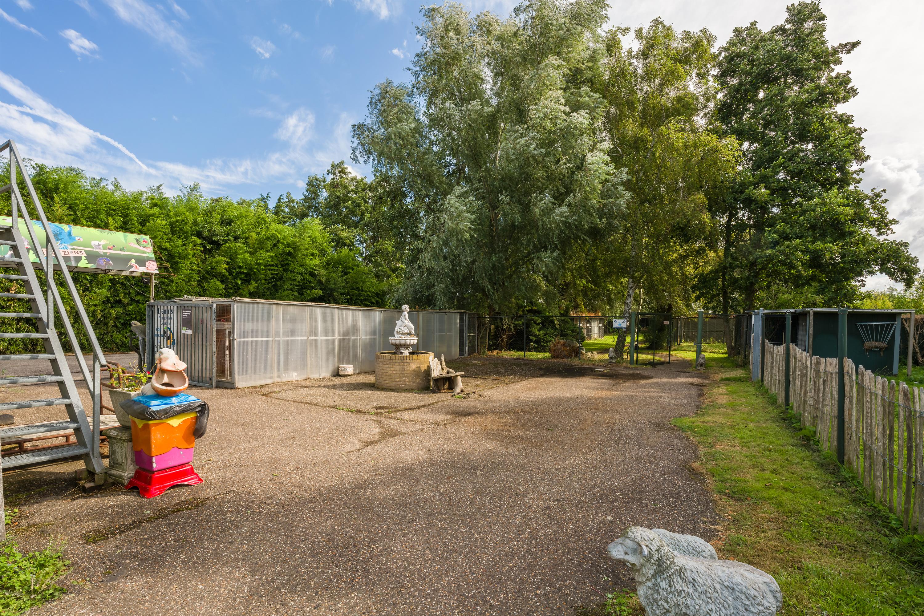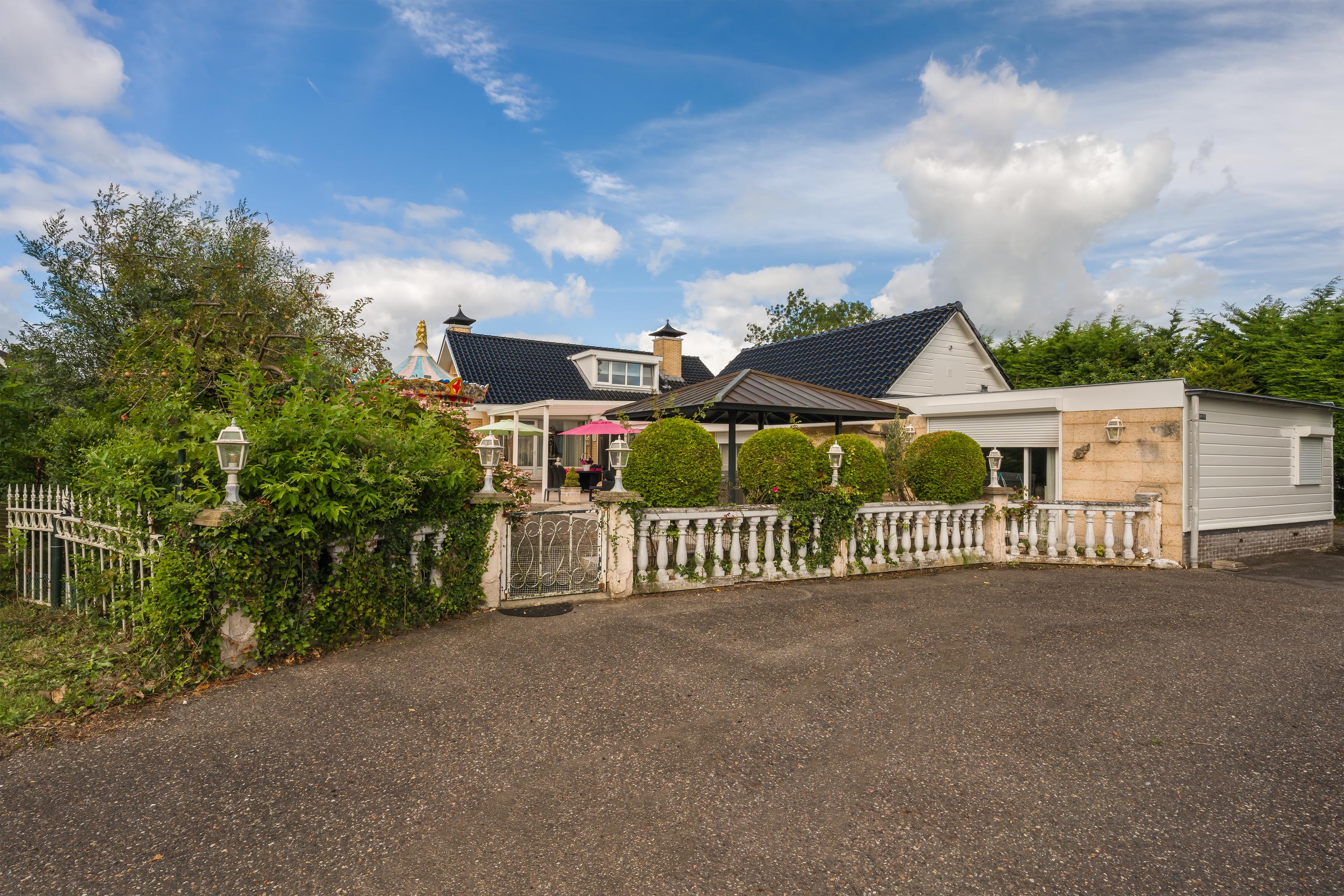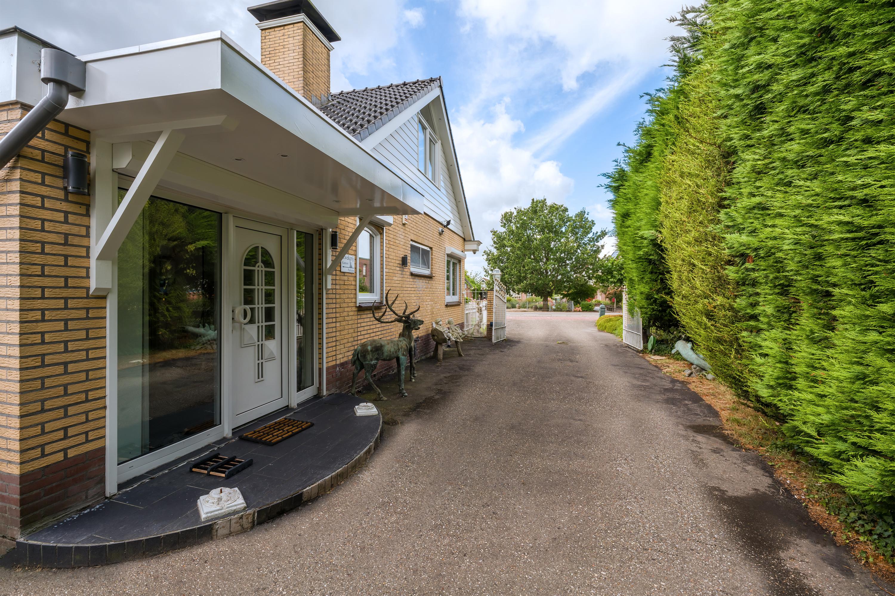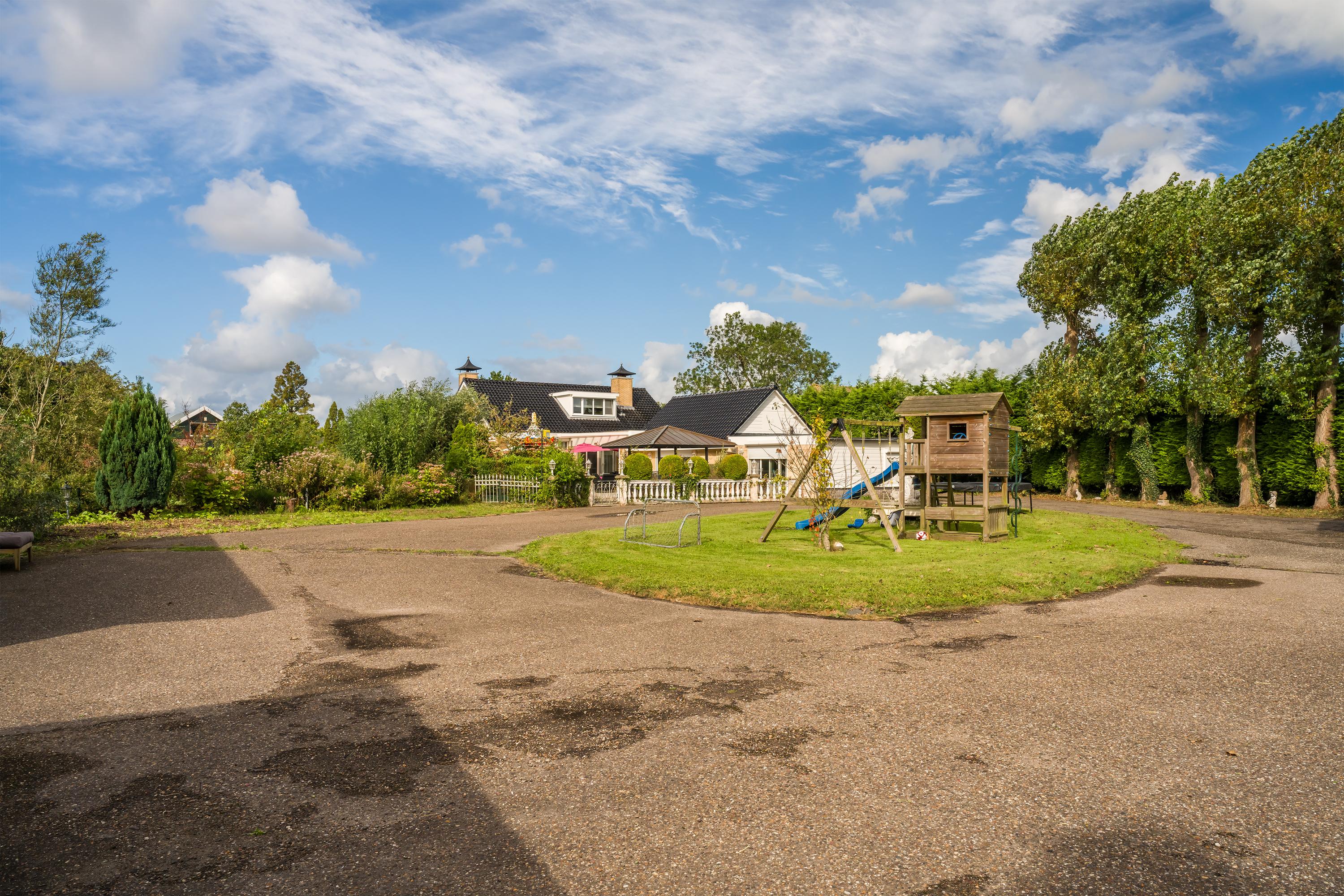 A beautifully enclosed private domain is hidden behind this cleverly positioned detached house with a guesthouse. The entire property exudes a grand vibe as soon as you drive up. Your eyes are drawn to the white iron gates that accentuate the green plot as you approach the gate. Your journey continues along the asphalt driveway, turning around at the back of the property and parking on the roundabout. From here, you can admire the American-style bungalow with its piled terrace, the spacious guesthouse, the commercial space, and the animal enclosures, where flamingos once graced the North Holland landscape.