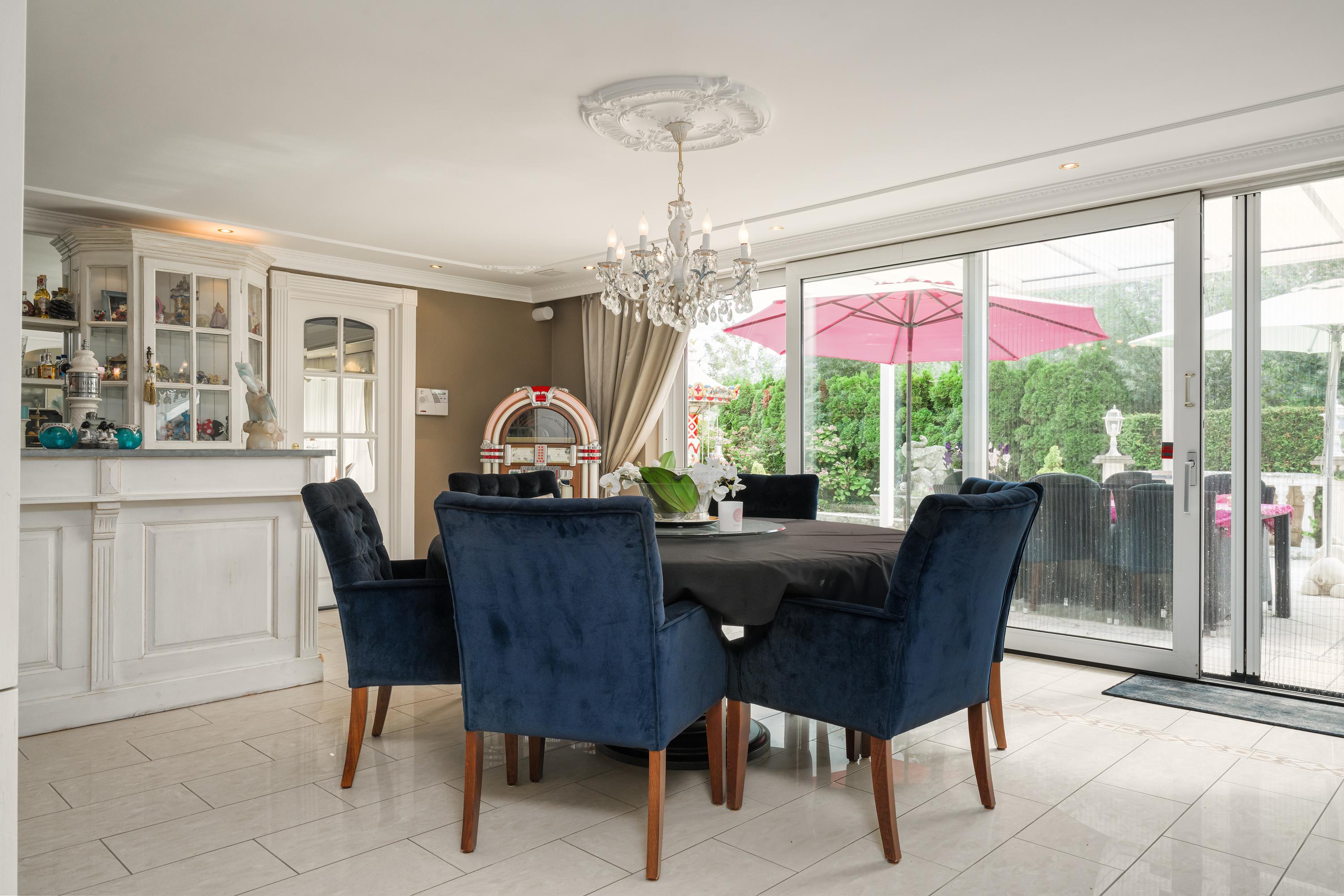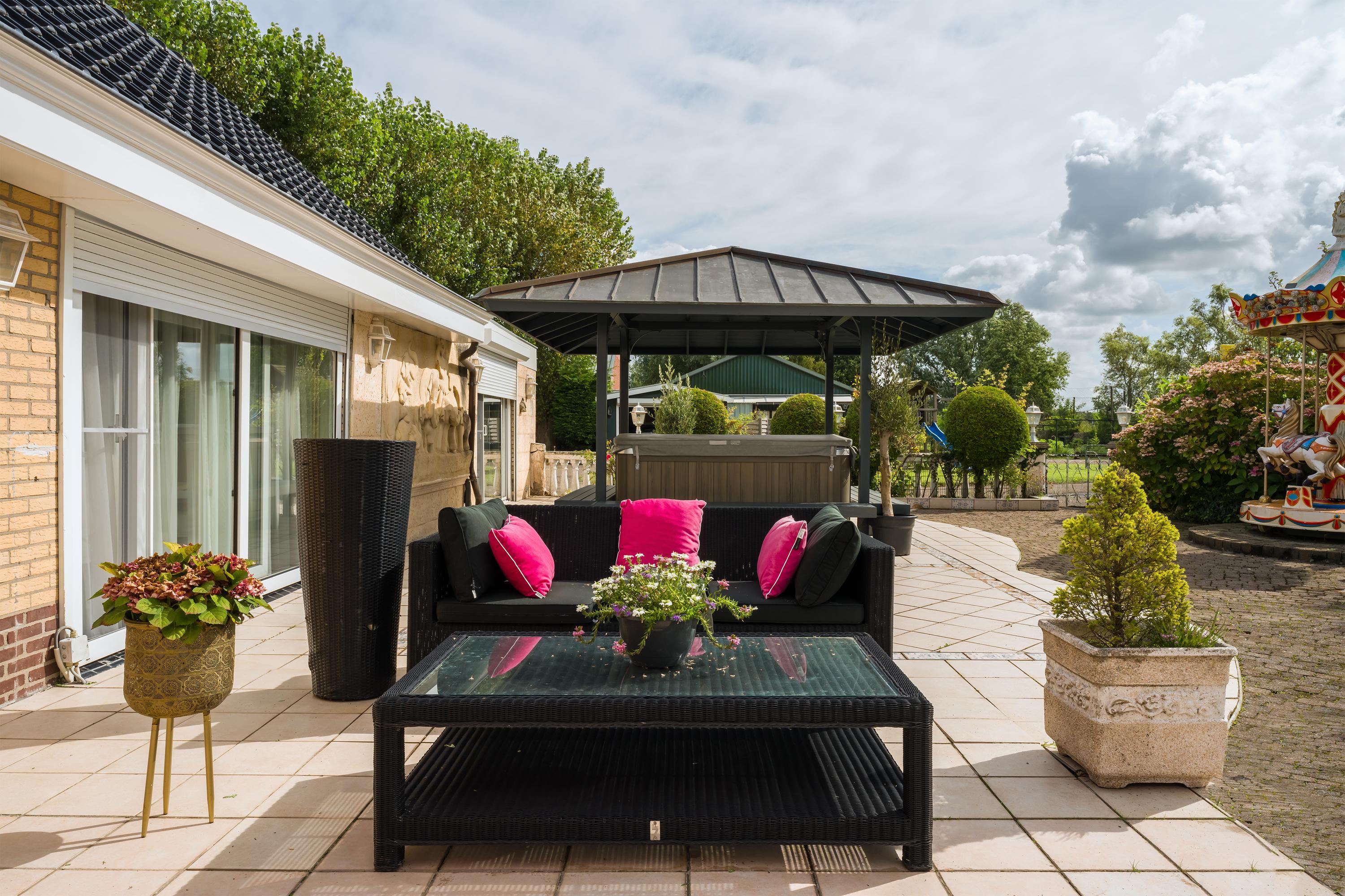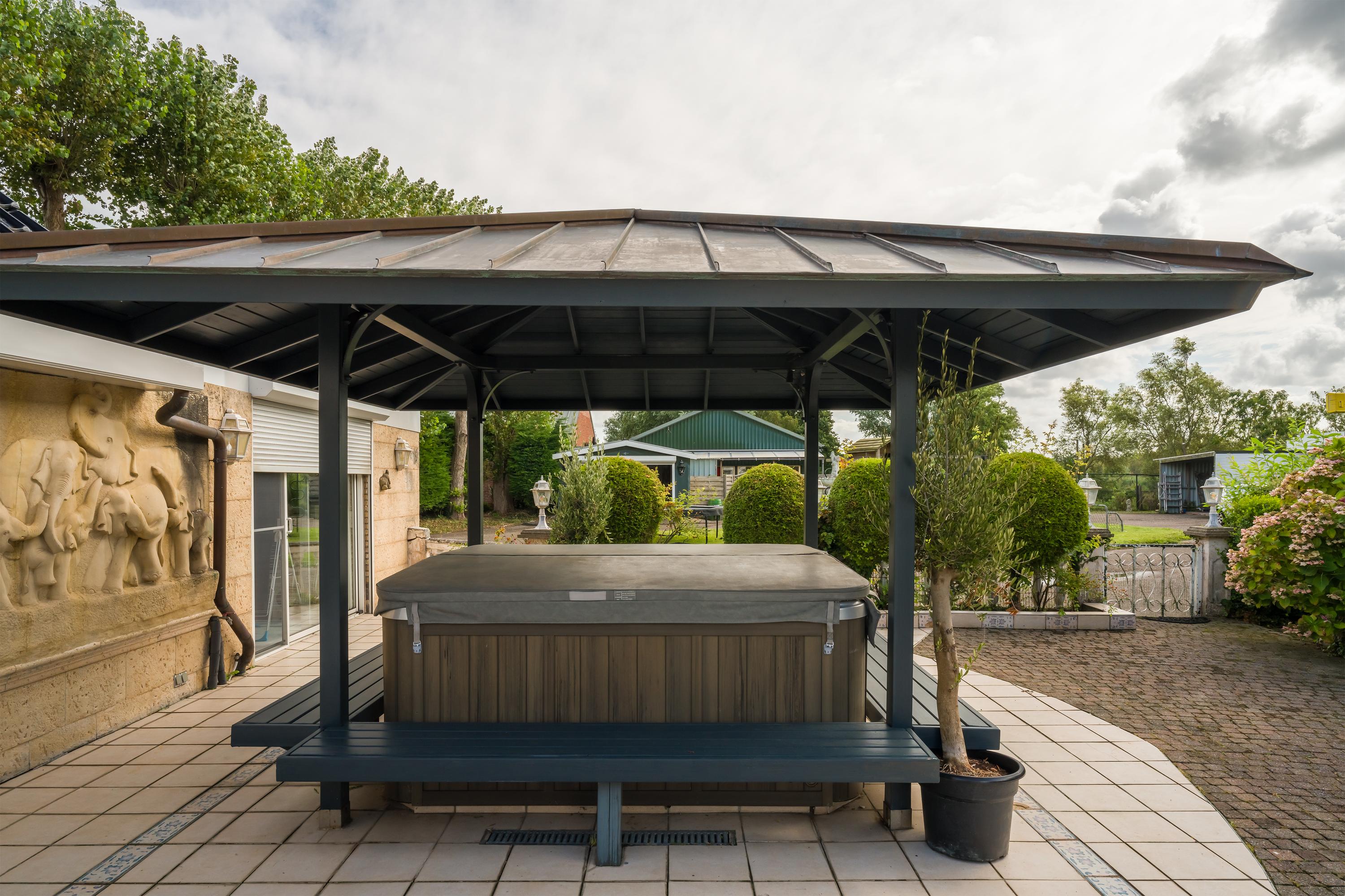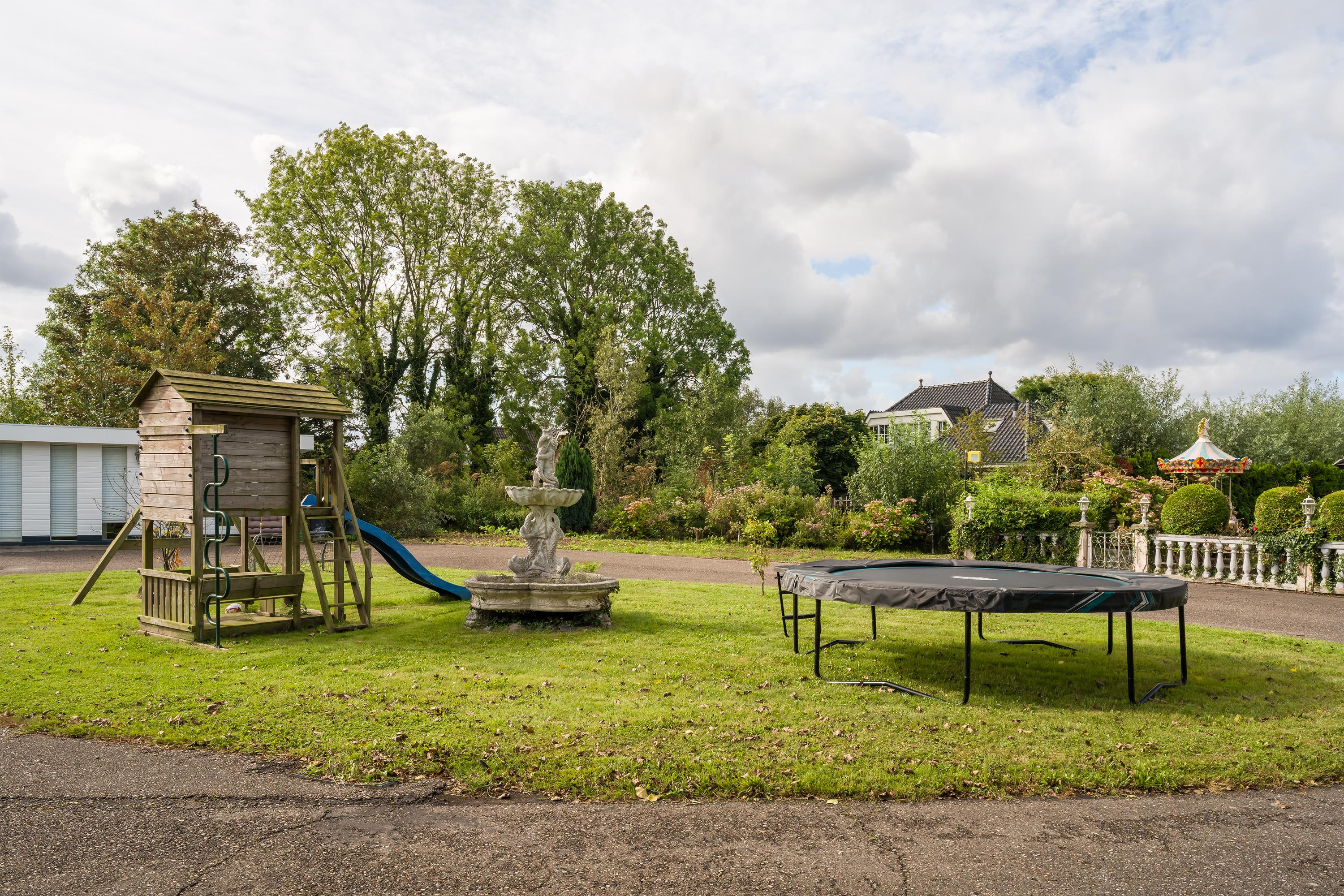 A beautifully enclosed private domain is hidden behind this cleverly positioned detached house with a guesthouse. The entire property exudes a grand vibe as soon as you drive up. Your eyes are drawn to the white iron gates that accentuate the green plot as you approach the gate. Your journey continues along the asphalt driveway, turning around at the back of the property and parking on the roundabout. From here, you can admire the American-style bungalow with its piled terrace, the spacious guesthouse, the commercial space, and the animal enclosures, where flamingos once graced the North Holland landscape.