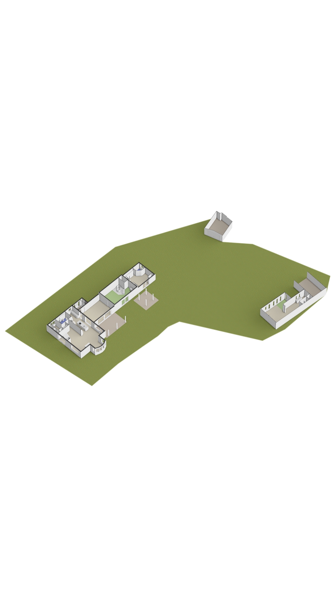 Guesthouse: Side entrance under the double carport, open kitchen, shower, living room, bedroom.