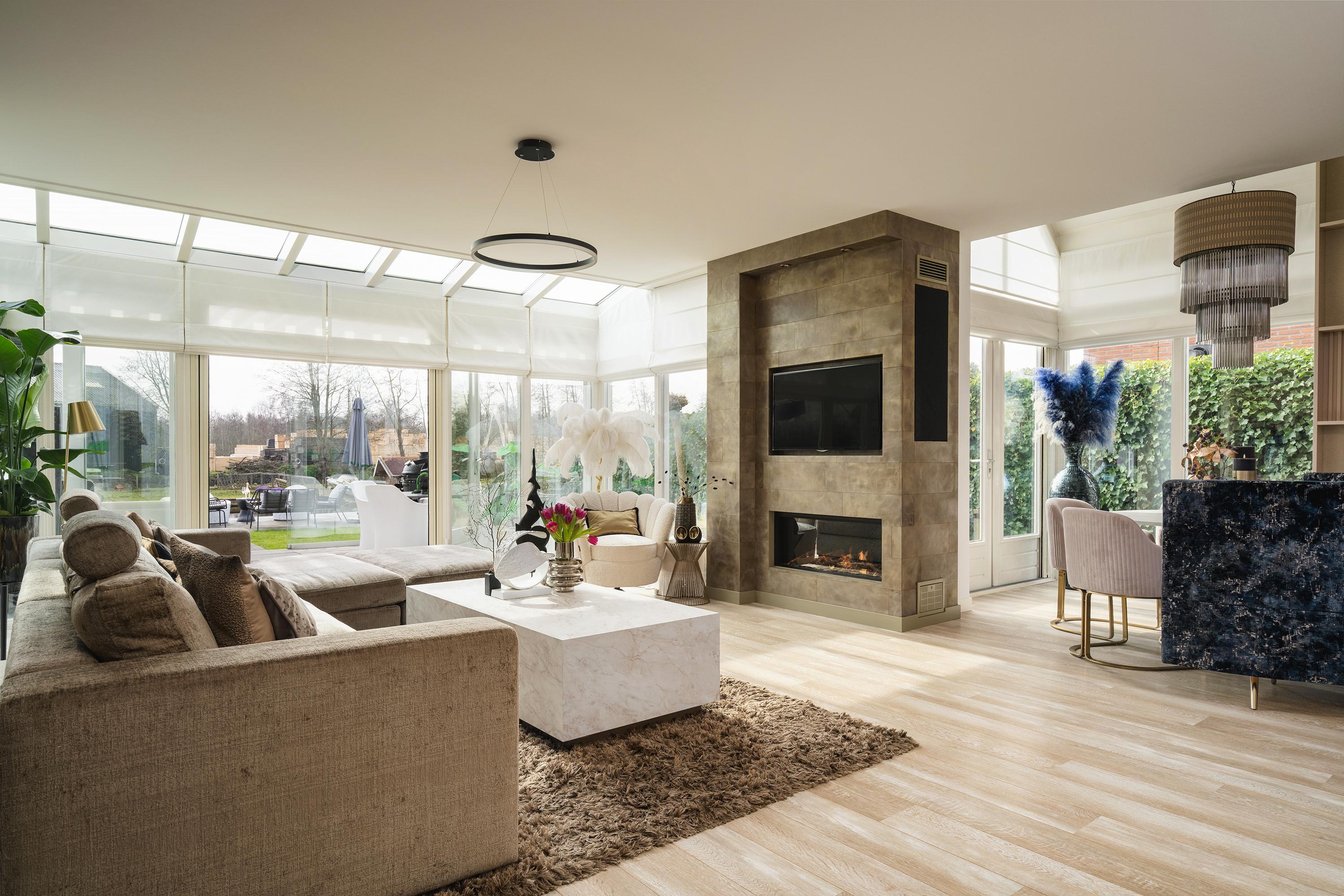 • Living room with atmospheric gas fireplace, adjacent conservatory