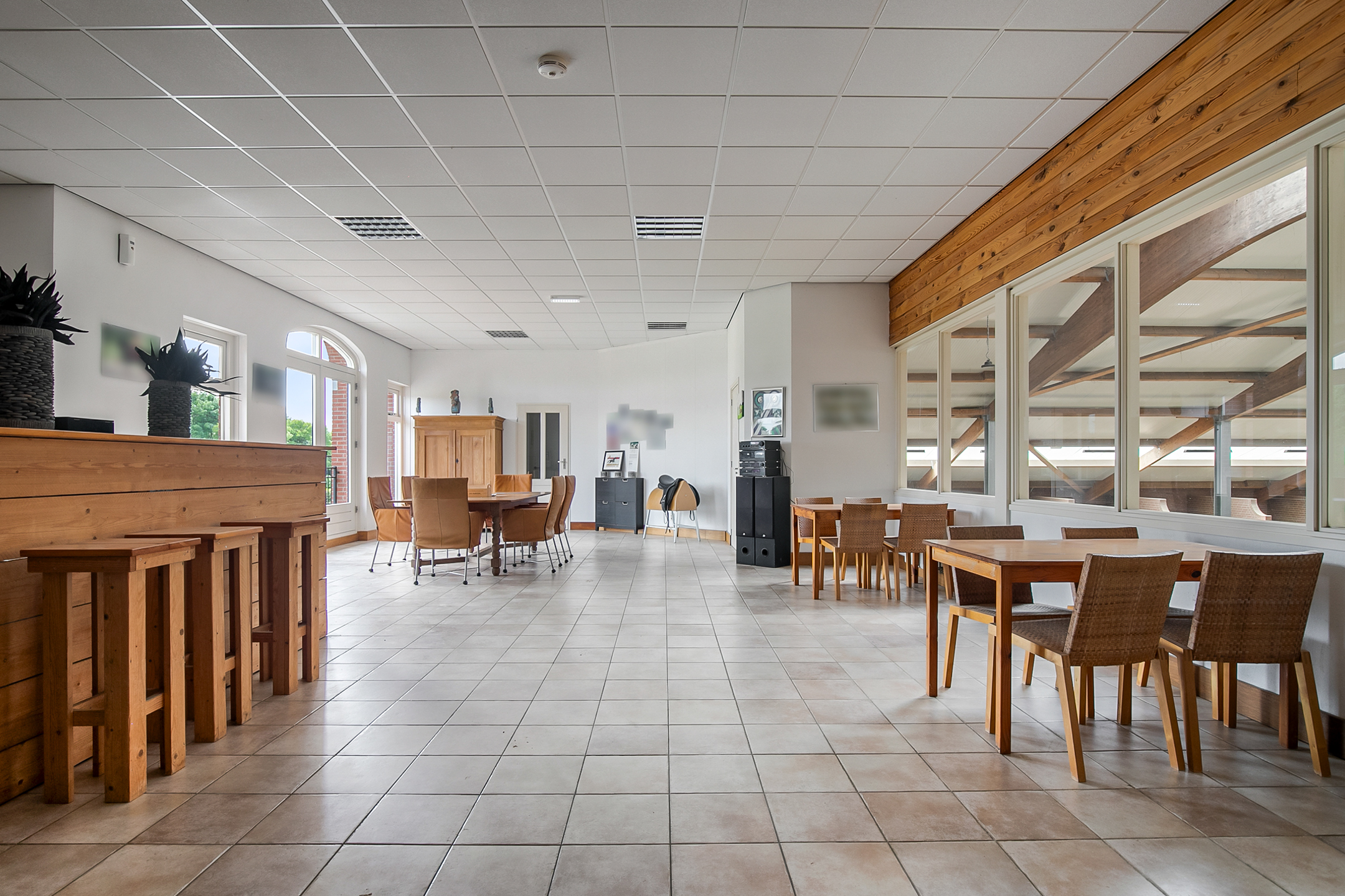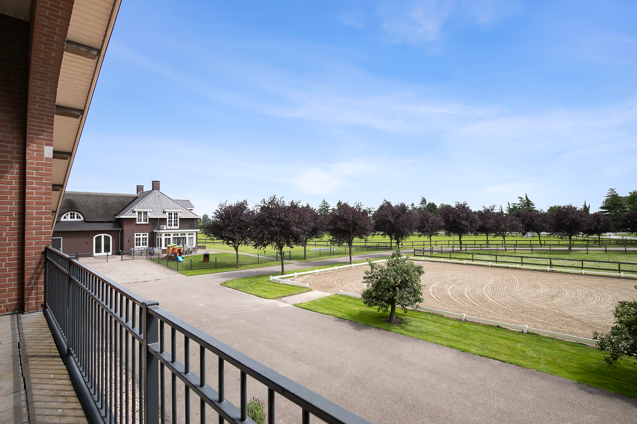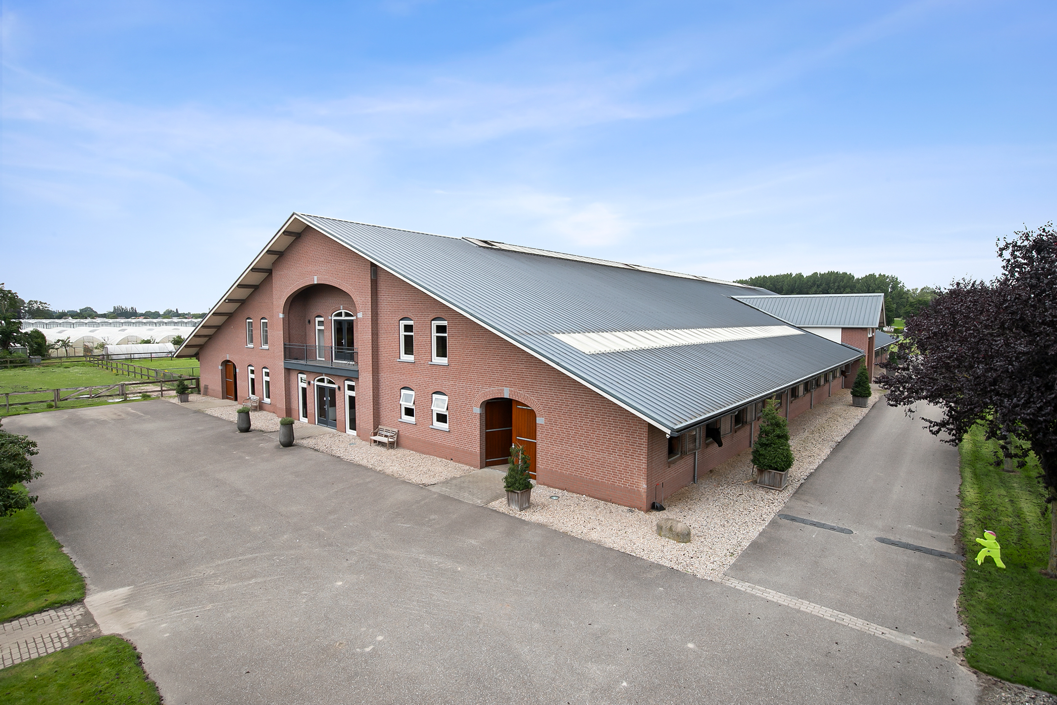 The hall at the front of the riding hall has a cobbled floor and provides access to a storeroom, toilet rooms, laundry room and a shop area. A spiral staircase provides access to the 1st floor. The reception area and a flat are located here. The reception area has a tiled floor, stucco walls and a suspended ceiling. There is a kitchenette and bar. French doors provide access to a balcony at the front of the riding hall. Large windows offer nice views of the indoor arena and stables. There is also access from the reception area to a balcony above the indoor arena.The flat is equipped with a living room with open kitchen, 2 bedrooms and a spacious bathroom. The flat has a tiled floor. The kitchen unit features a sink, induction hob, dishwasher, fridge and combination microwave. The bathroom is fully tiled and further equipped with a shower room, washbasin with cabinet and a floating toilet. A laundry room is located behind a practical sliding wall. The indoor arena (approx. 21x61 m) is equipped with a professional soil (Ben Agterberg), a beautiful hardwood arena edge. Vaulted wooden rafters add to the atmosphere. A skylight in the ridge provides beautiful natural light. LED lighting is also available. The 39 horse stalls are divided over two stall corridors. The stalls have partly hardwood / partly galvanised front walls and masonry partitions and rear walls. The doors of the stalls are hinged. The stalls are also equipped with an outside hatch. Each stall corridor has its own facilities such as washing areas and a tack room. Between the corridors there are three spacious loose boxes. The washing areas are equipped with hot and cold water supply. There is also a place for the farrier and physio. There is another flat at the rear. Access is gained via a flight of stairs on the outside. There is also a balcony here. The flat features a spacious living room with open kitchen, 3 bedrooms, a spacious bathroom, a utility room, laundry room and a toilet room.At the rear of the plot is a detached field barn situated. The barn is constructed of masonry skirting with sheet pile walls and the insulated roof is covered with sandwich panels. At the front, the field barn is fitted with windbreak netting. There is a feed silo in the barn. There are currently 14 horse boxes and a lunging circle, but this barn is of course also extremely suitable for various other purposes.