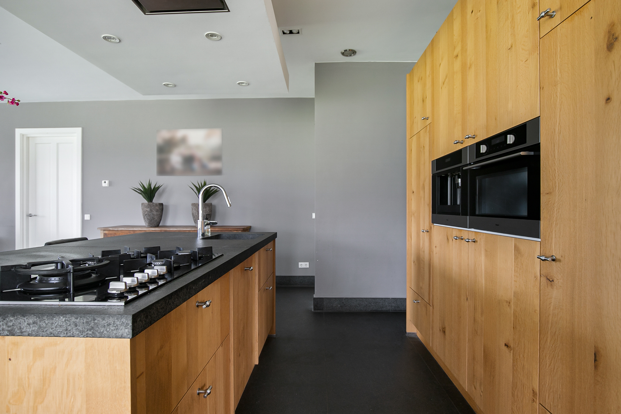 The covered entrance with a double sliding front door, gives this villa an attractive appearance. The spacious reception hall with imposing wooden staircase provides access to the living room and the 1st floor. The hall has a natural stone tiled floor, stucco walls and a stucco ceiling. The spacious living kitchen with dining area has a natural stone tiled floor, stucco walls and a stucco ceiling with recessed lighting. The kitchen features a wall-mounted unit with appliance wall and a cooking and rinsing island. The appliance wall is further equipped with an oven, coffee maker, steam oven and fridge. The island features a 5-burner gas hob with built-in extractor fan in the ceiling, a sink and a dishwasher. Various cupboards and drawers provide plenty of storage space. A large bay window/extension with French doors provide access to the garden. The many windows provide plenty of natural light. A fireplace adds atmosphere and warmth to the room. From the living room there is a nice view of the horse pastures. And here, too, large windows and double doors provide a sea of light. In addition, there is a beautiful, large fireplace with a gas fire that provides even more atmosphere and warmth in the room. Sliding doors close off the living room from the kitchen/dining area. Semi-circular French doors in the side wall of the house provide access to the front house. The spacious entrance hall provides access to the utility/laundry room, living room, toilet room and the meter cupboard. The utility/laundry room is equipped with a sink. Also located here are the connections for the washing equipment. From here, there is access to the office/workroom. The office space is a fine room which is obviously suitable for various purposes, such as a playroom or chill room.