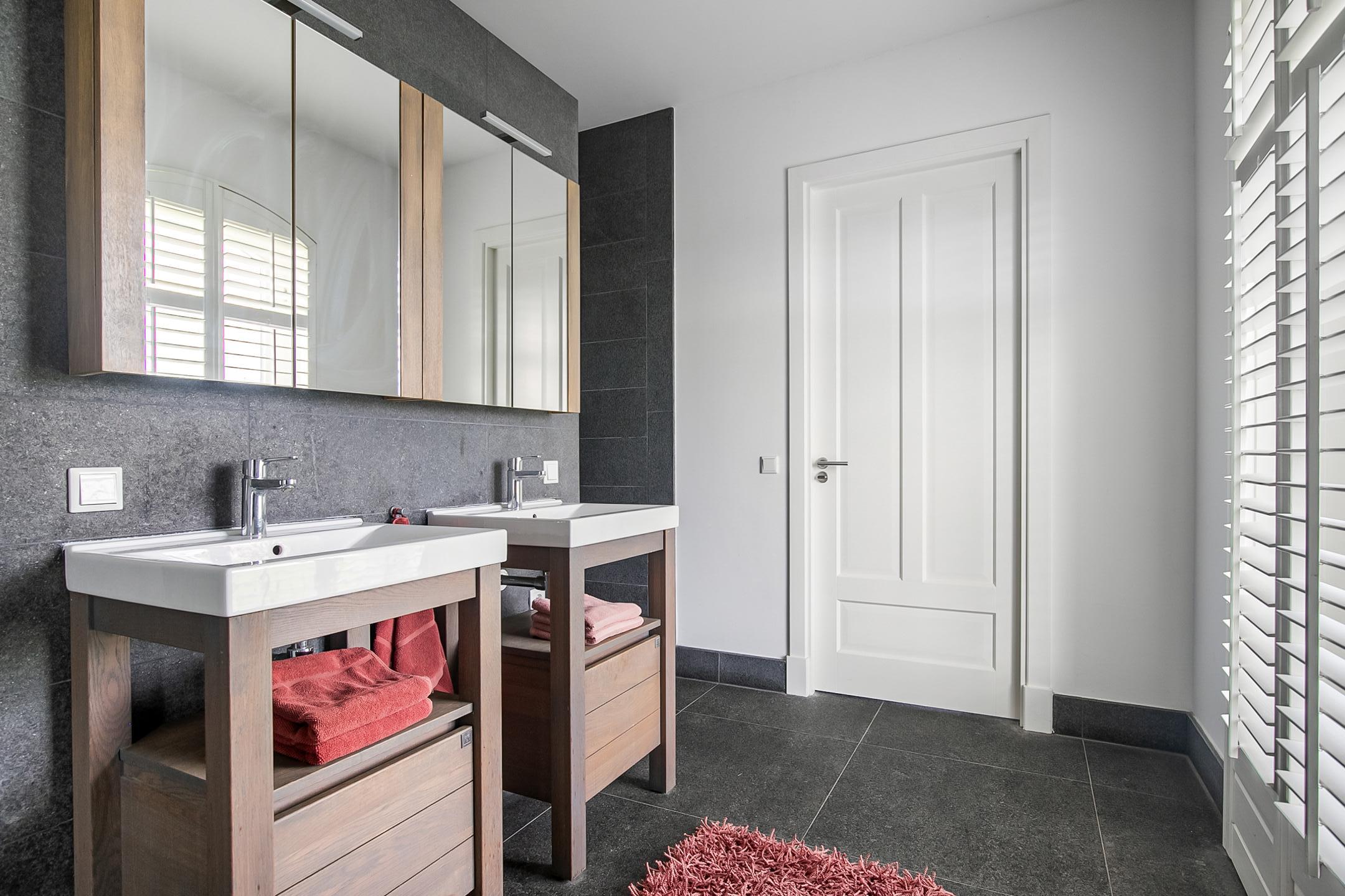 From the living room, you can access the guest bedroom. This bedroom has a natural stone floor, stucco walls and a stucco ceiling with recessed lighting. From this room, there is access to the bathroom. This bathroom is finished with the same natural stone floor as in the rest of the rooms. The walls and ceiling have stucco. The bathroom is further equipped with a spacious walk-in shower with sun shower, two washbasins with cabinet, a floating toilet and a design radiator. A window provides natural light. From the bathroom, you walk further to the master bedroom.
