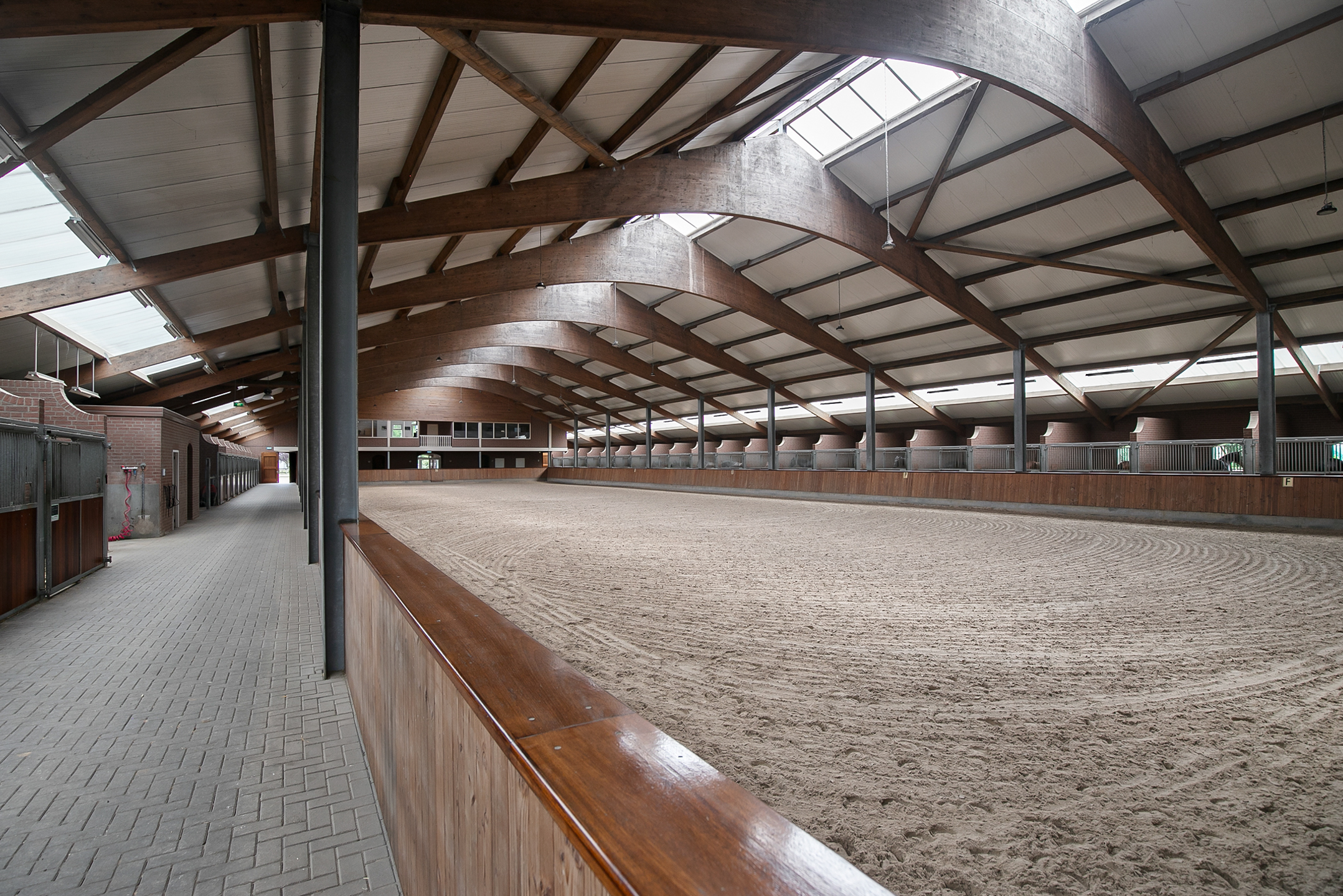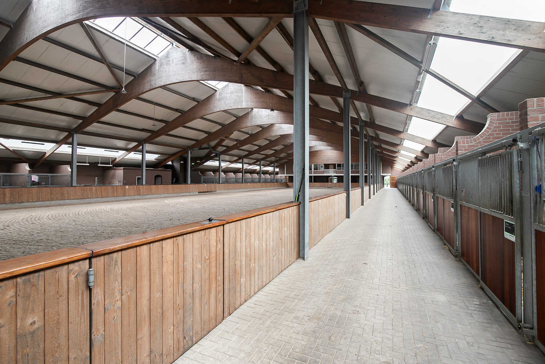 The riding hall is built of masonry facades with rafters. A skylight in the ridge and above the stables provides plenty of natural light. French doors in the front facade provide access.