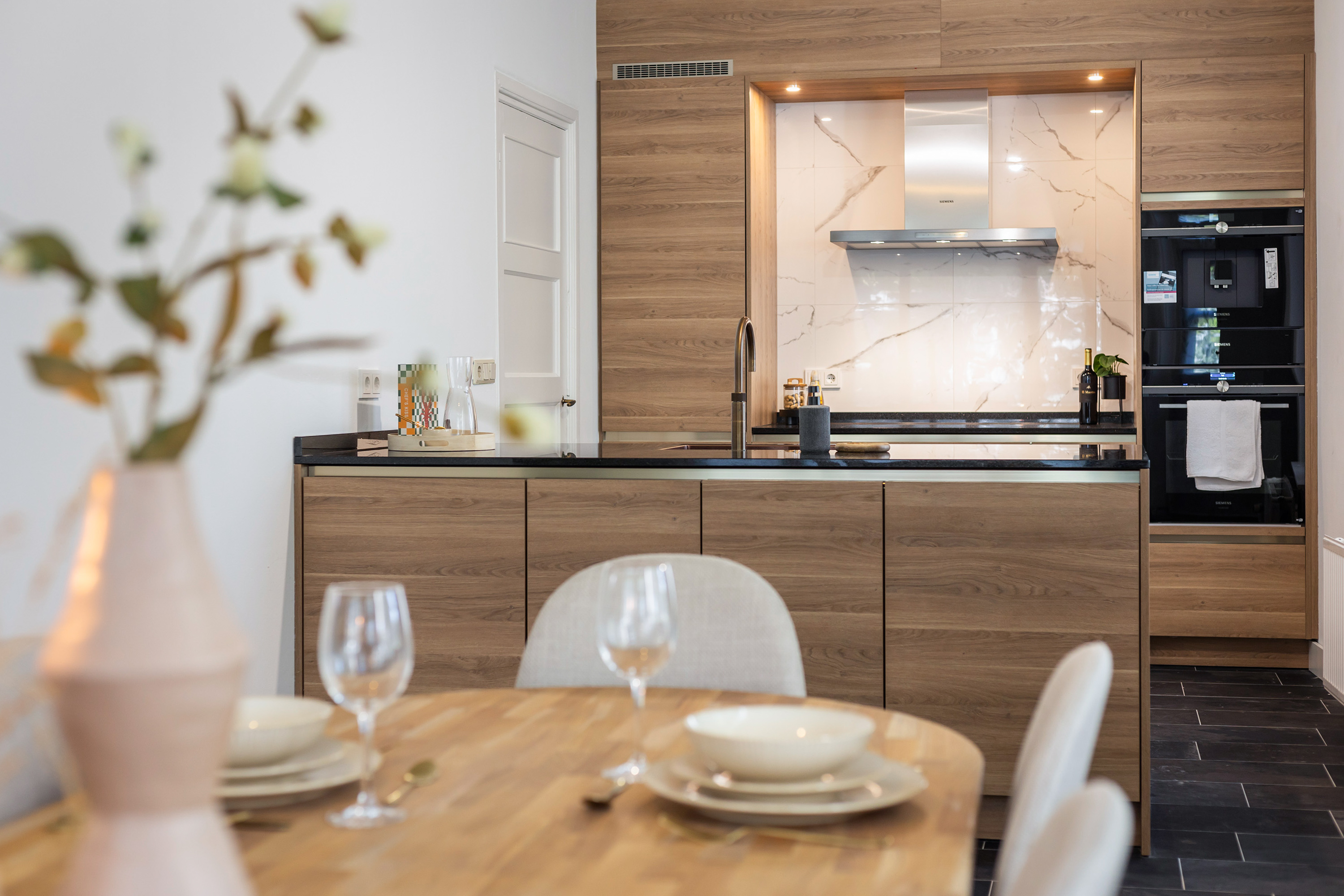 The kitchen-diner forms the heart of the home. Large new windows and the renewed door to the front garden create a light and welcoming space. The brand-new Siematic kitchen features a dual arrangement with island and is fitted with Siemens appliances, including an induction hob with fish burner, combi-oven, built-in coffee machine with warming drawer, dishwasher and a stylish bronze-coloured Quooker. The black granite worktop contrasts beautifully with the oak cabinetry and the marbled splashback. Additional cabinetry has been added at the rear of the island, ensuring practicality and design go hand in hand. The adjoining dining area is generous, easily accommodating a large table, with French doors opening directly onto the south-west facing terrace.