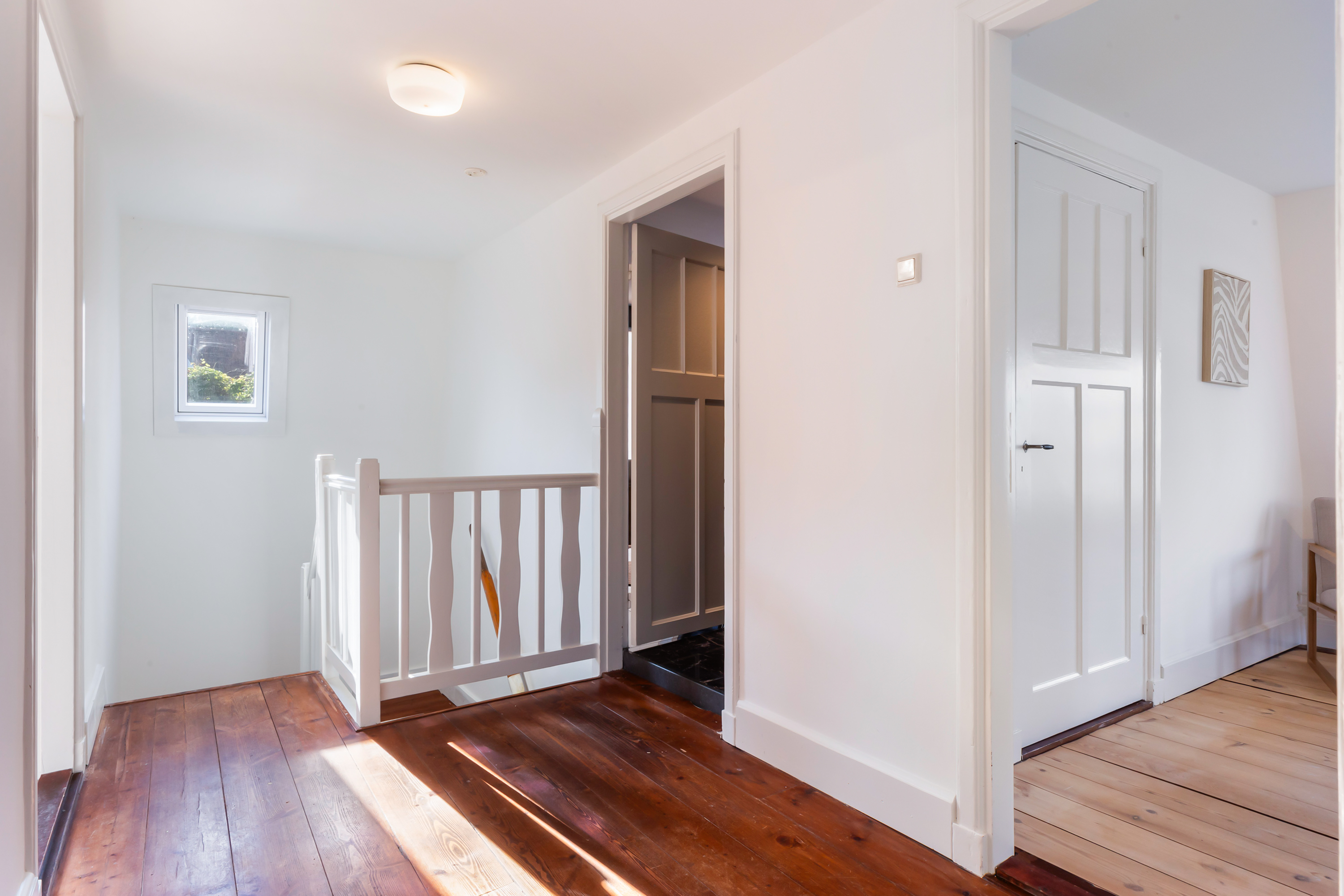 The spacious landing leads to the bedrooms and bathroom. The bedrooms are light and airy, with wooden flooring and smooth plastered walls. Four of the bedrooms are large enough to accommodate a double bed. Two have built-in wardrobes, the turret room has a charming corner window, and two others have French doors to the roof terrace. The fourth bedroom is connected to the bathroom and could also serve as a guest room. From this room, a fixed staircase leads to a small loft. The fifth room is currently used as a study but could just as easily serve as a dressing room, nursery or walk-in wardrobe.