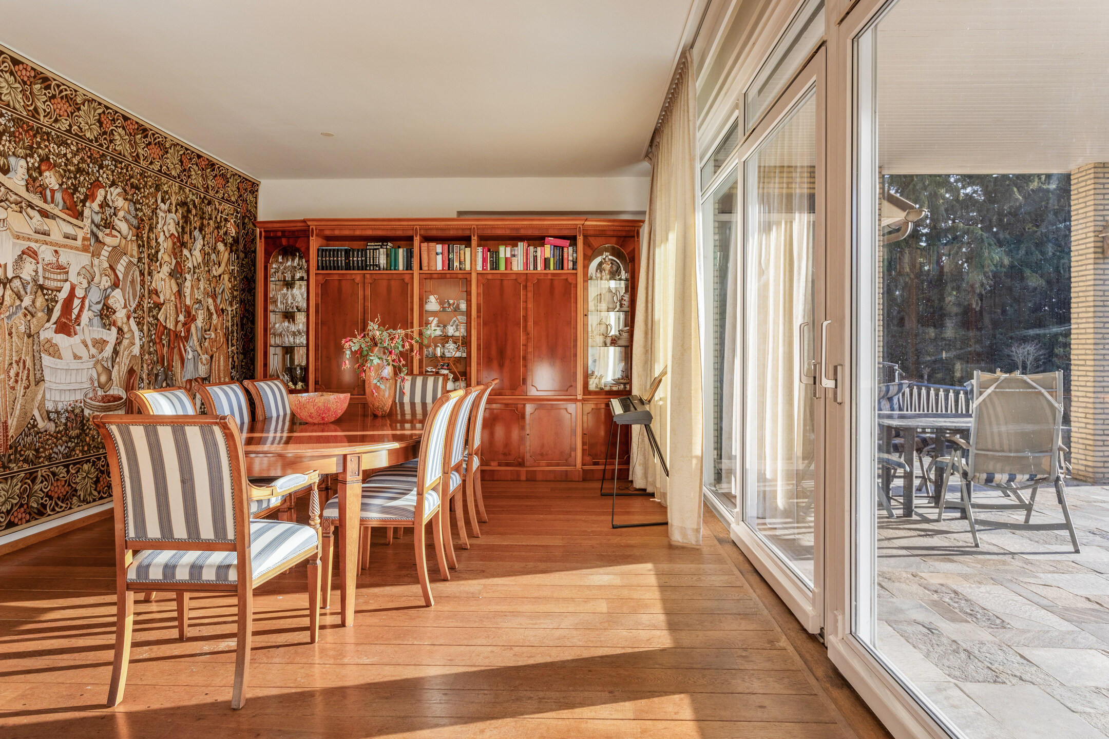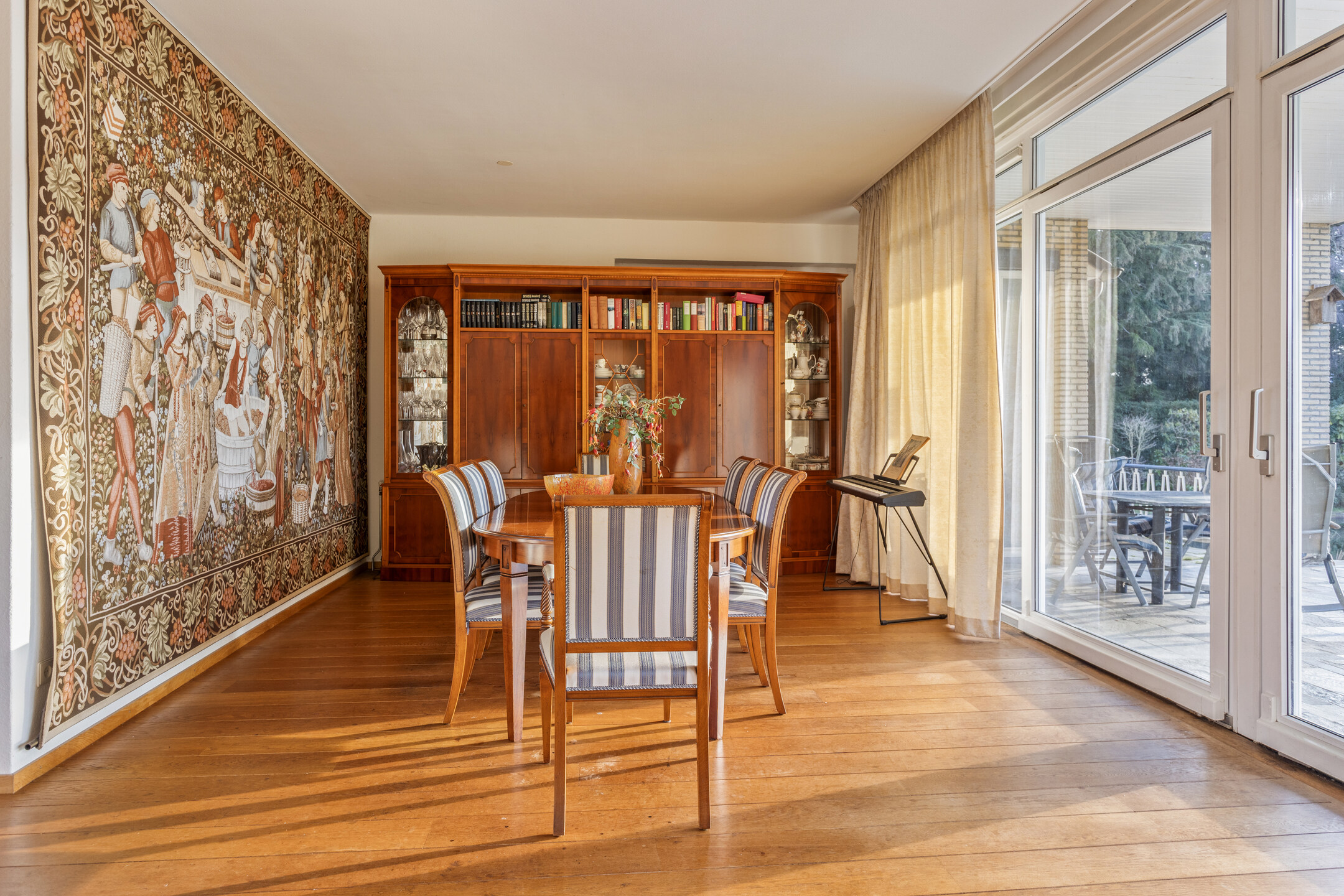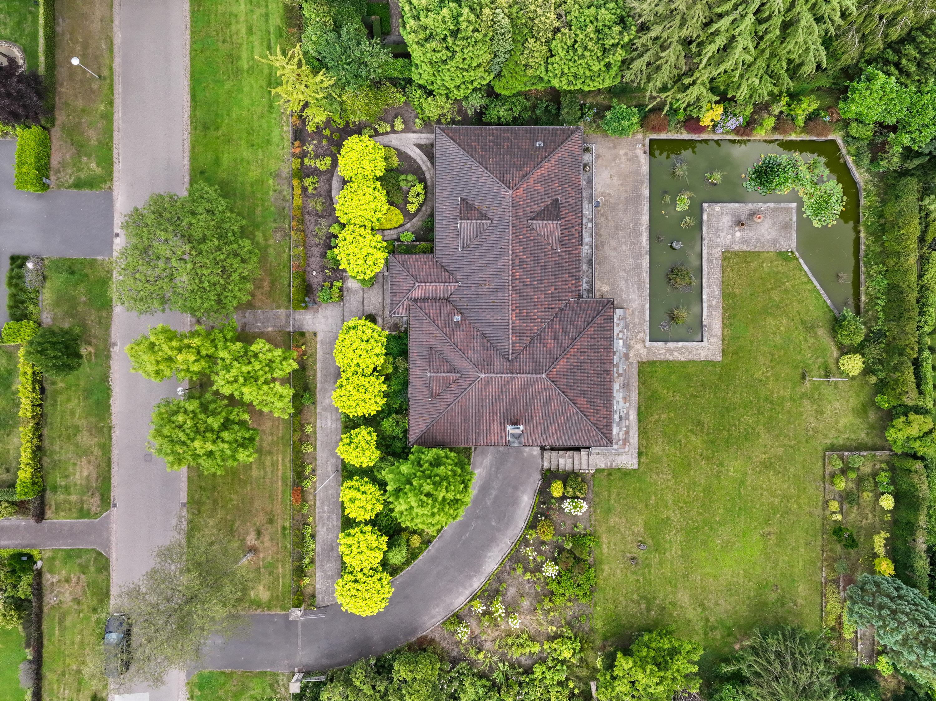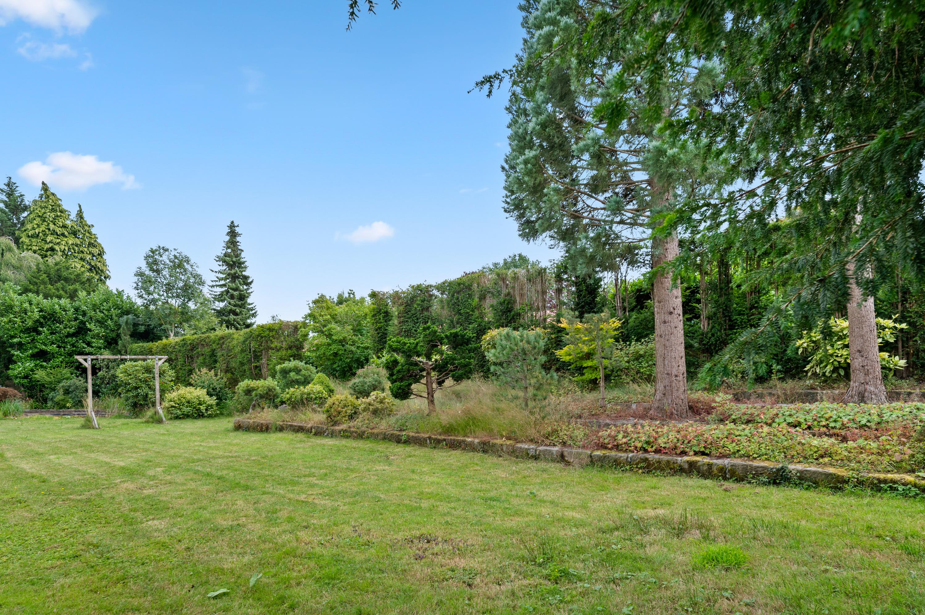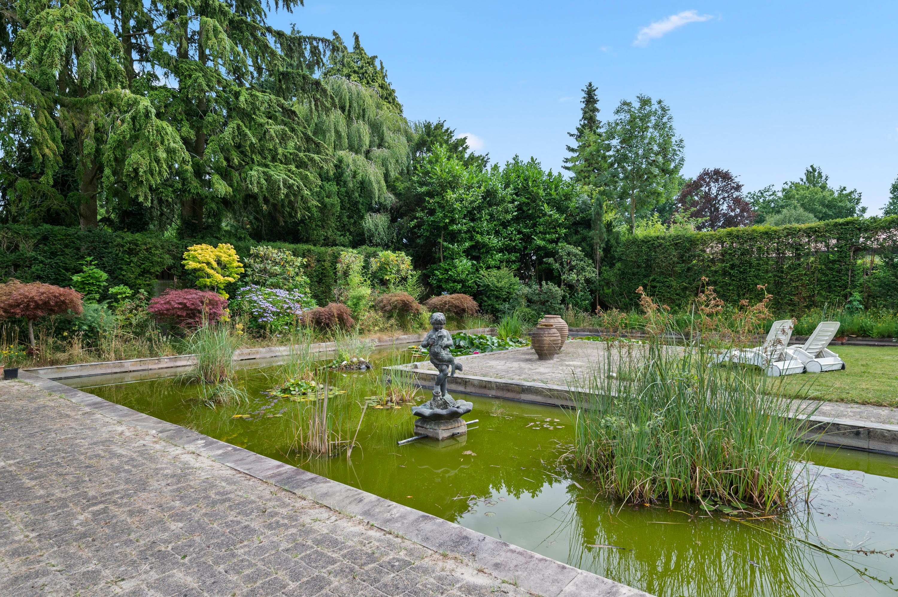 Covered entrance into a hallway with a striking double staircase and access to the guest toilet. From here, step into the L-shaped living and dining room with a cozy fireplace and classic mantel. The separate kitchen is fully equipped with built-in appliances, including a refrigerator, oven, microwave, dishwasher, and 4-zone induction hob with extractor. Three versatile rooms—currently used as bedrooms—are also accessible from the hall, two of which feature fitted wardrobes and en-suite bathrooms. Two of the bedrooms offer direct access to the beautifully landscaped rear garden, complete with a large partially covered terrace, lily pond, and lush greenery including rare and exotic plants.