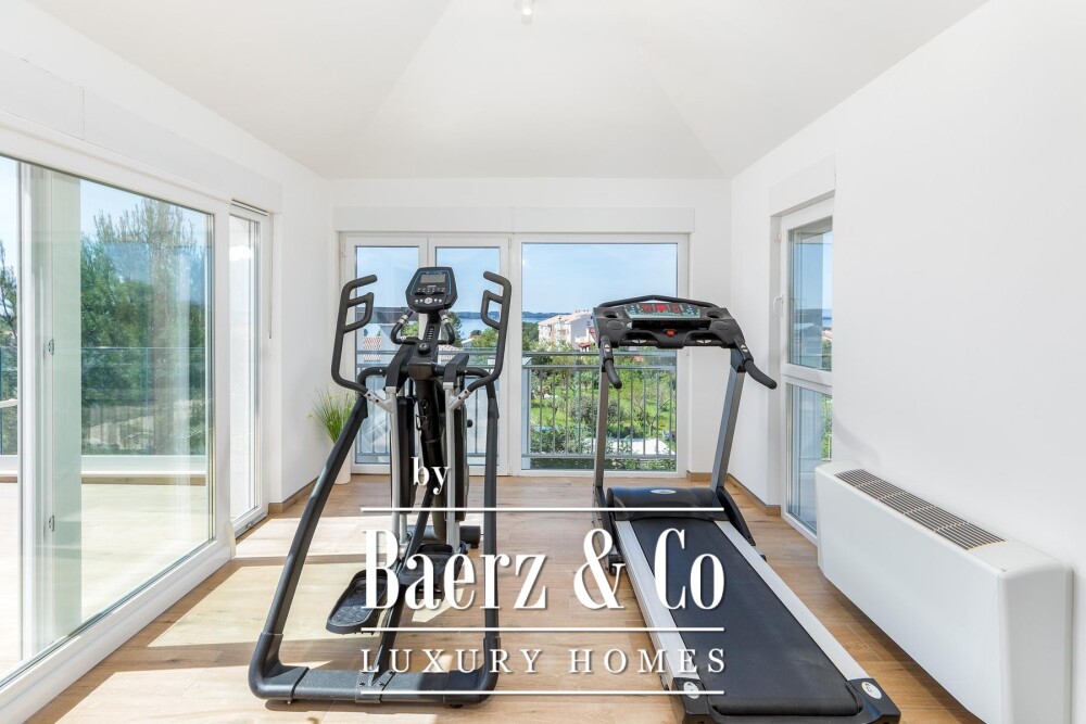 The top floor hosts an additional bedroom with access to a 40 m² terrace that offers sweeping views of the Brijuni archipelago. This level also includes a dedicated gym area and sauna, maintaining the villa’s refined focus on wellbeing. With five bedrooms and five bathrooms, solar panels, underfloor heating, and a heat pump system, the villa unites efficiency and comfort.