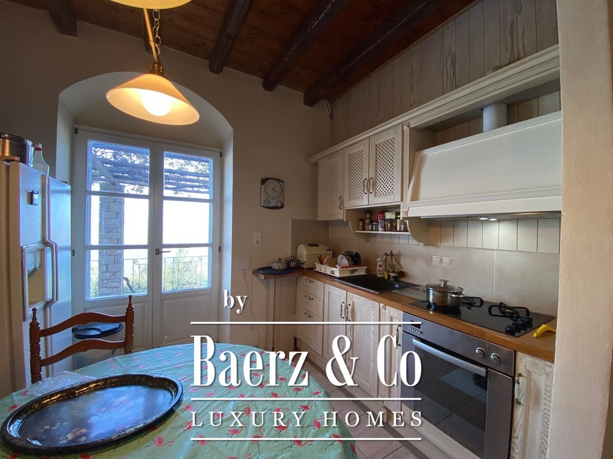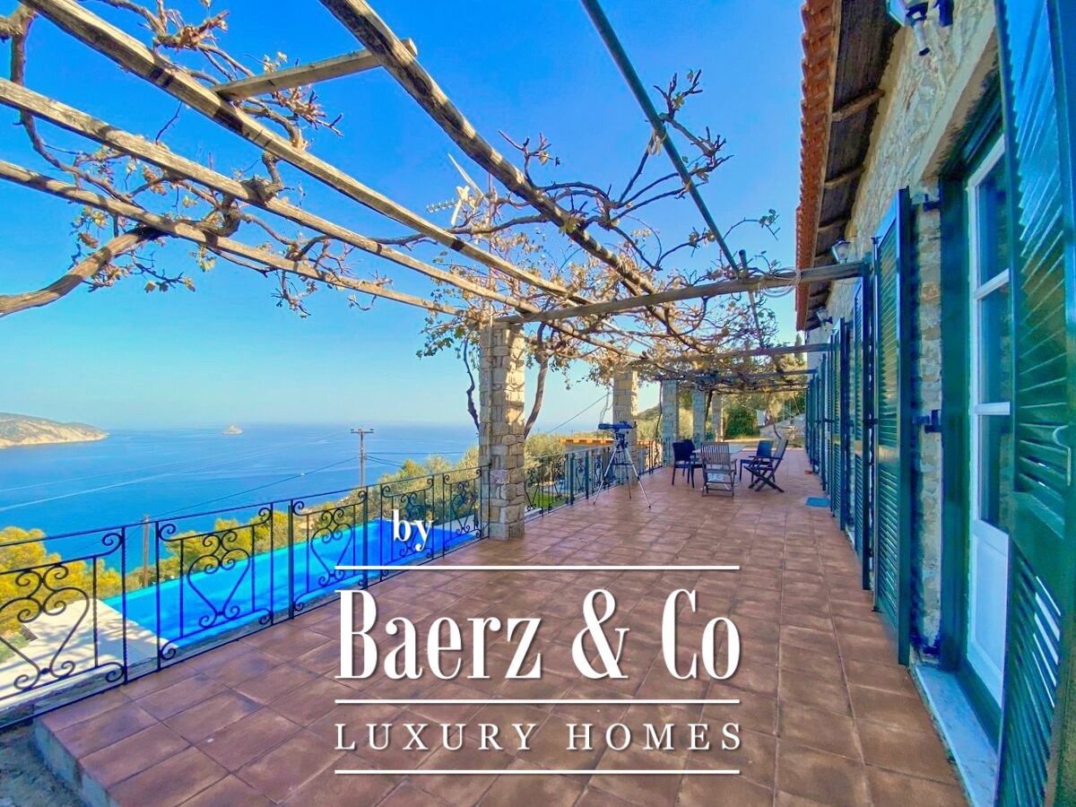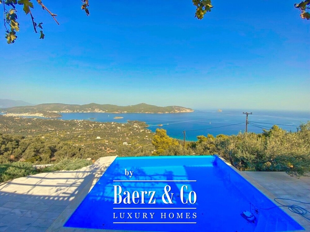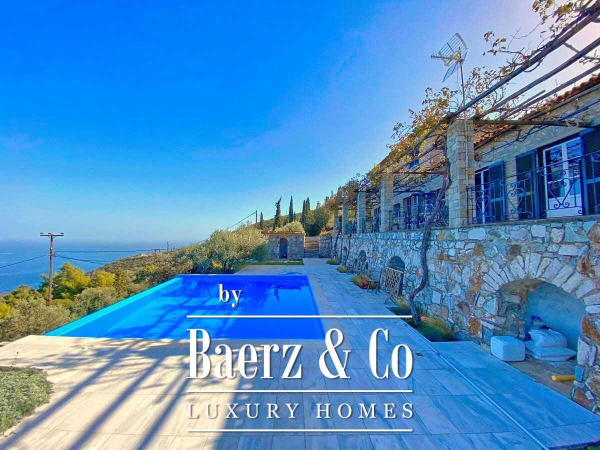 Set on a private 4,000 m² plot, the property ensures both privacy and a profound sense of freedom, heightened by Mediterranean landscaping and unobstructed blue vistas. A 50 m² veranda shaded by a vine pergola invites moments of relaxation, while the 30 m² swimming pool offers another space to appreciate the tranquil surroundings. The stone villa Galatas also features a small unfinished stone guesthouse and a large enclosed storage area within the thoughtfully designed grounds.