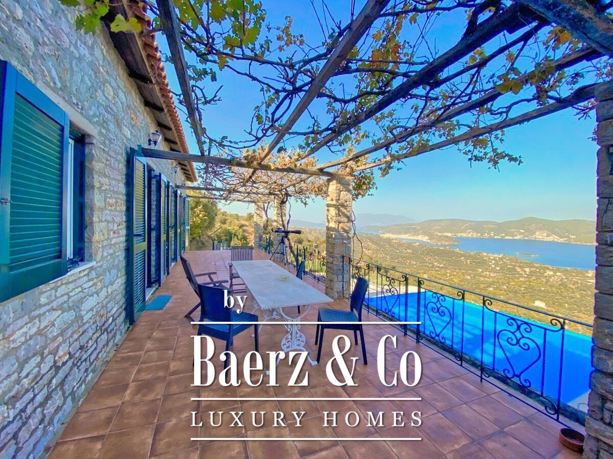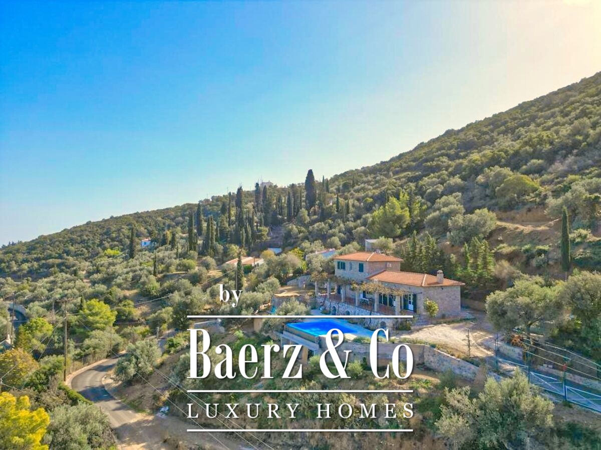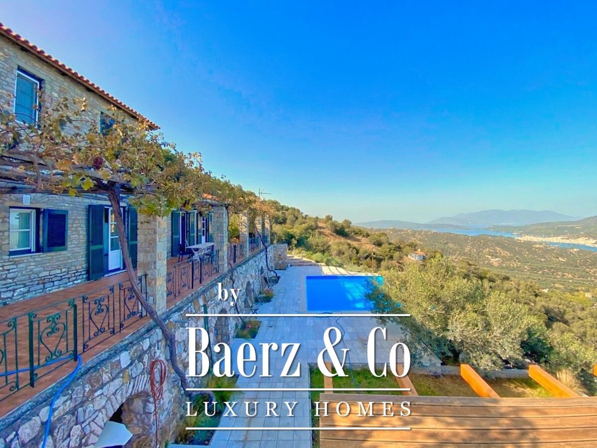 Stone villa Galatas rests on a quiet hillside, offering panoramic views over the sea and blending traditional Greek architecture with understated modern comfort. Within its 180 m² interior, spacious and inviting rooms are crafted to embrace natural light, including a central living area anchored by an impressive stone fireplace. Every room, from the separate kitchen to the three bedrooms and two bathrooms, is designed with functionality and subtle luxury in mind.