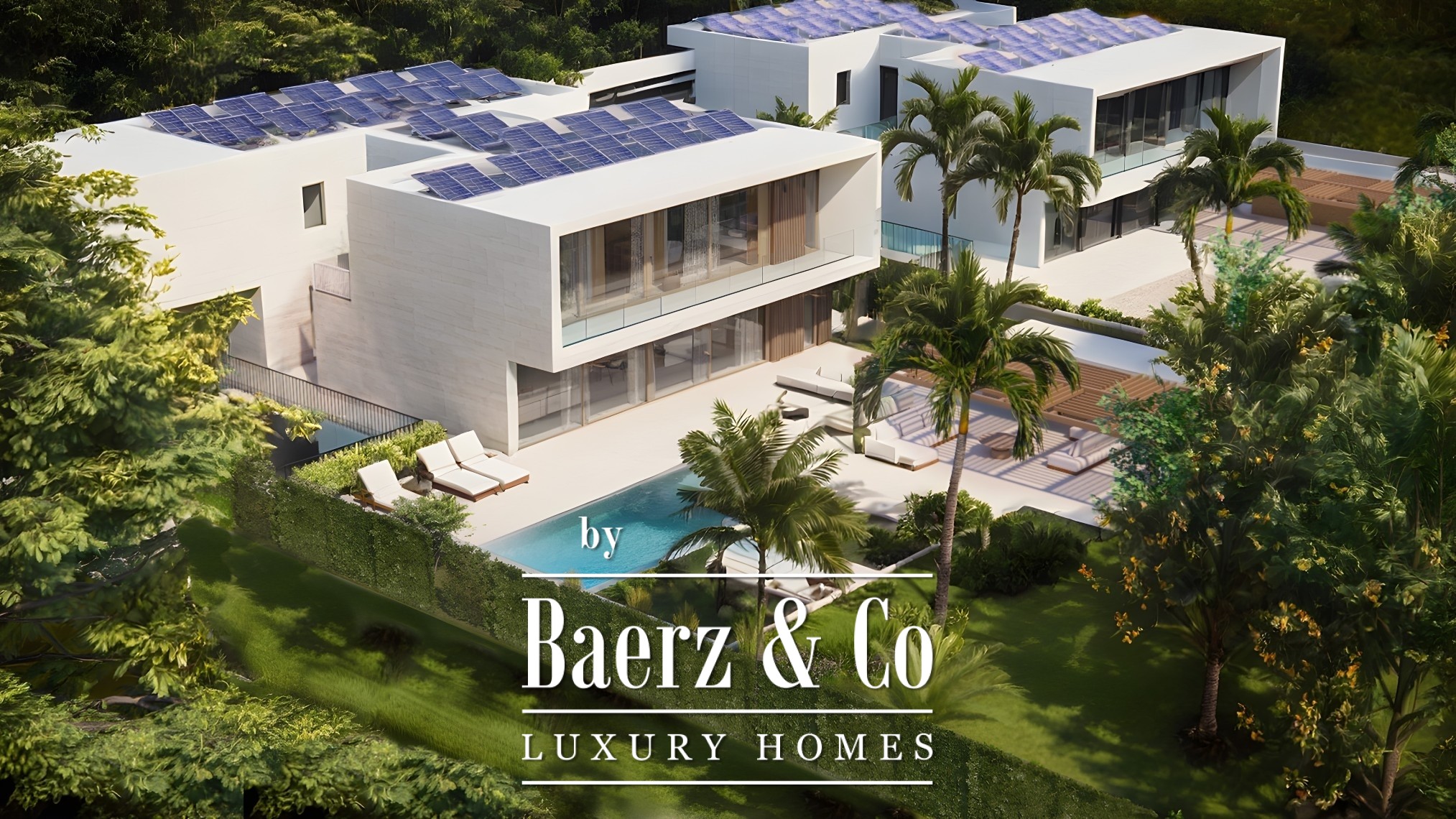Upstairs, four further bedrooms each feature en-suite bathrooms and built-in wardrobes. The master suite is distinguished by a dedicated dressing area, a serene designer bath, and a terrace granting open views. Throughout, finishes blend natural stone, wood, and large-format ceramics, while glass and exposed concrete articulate the façade’s restrained modernity.