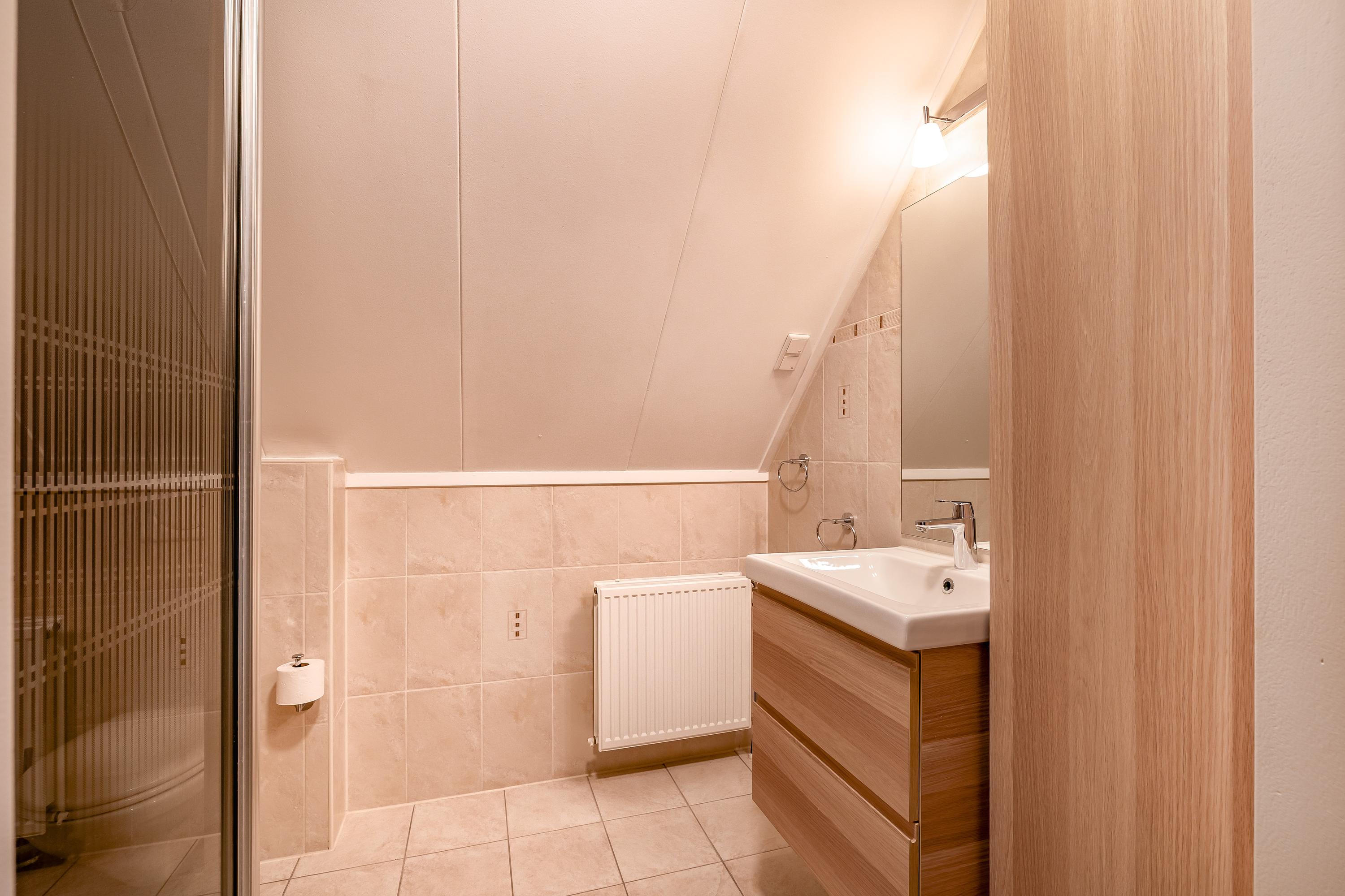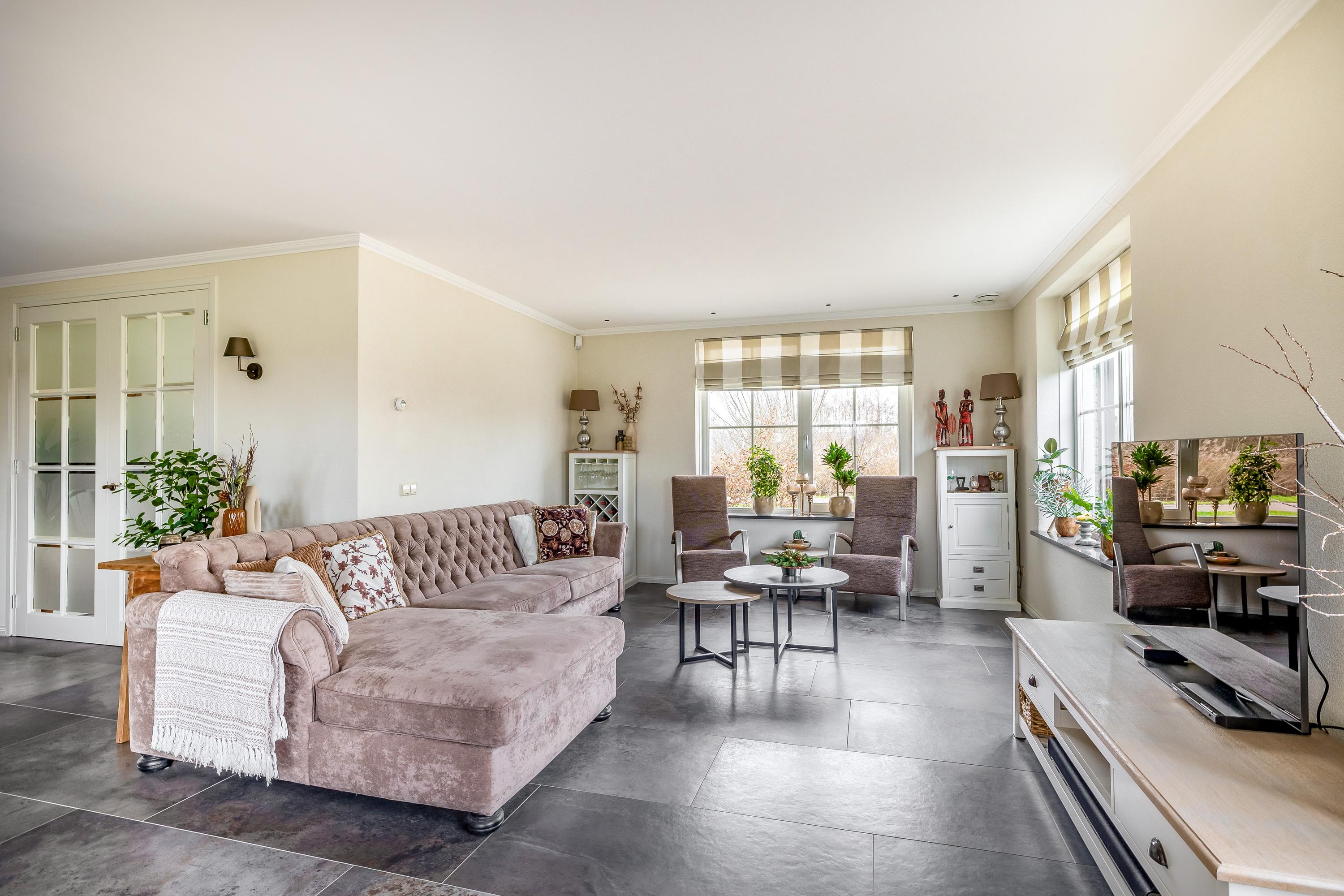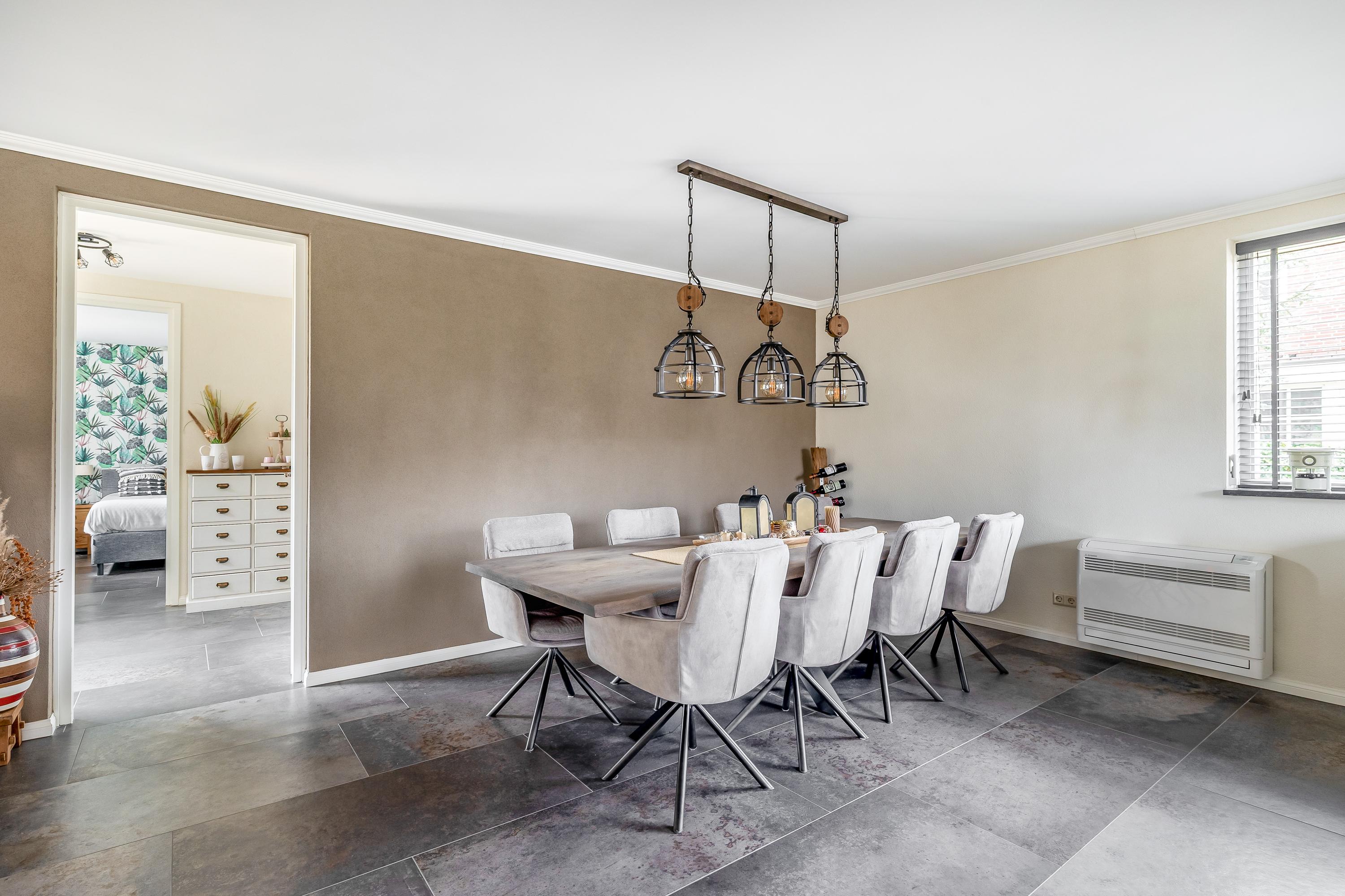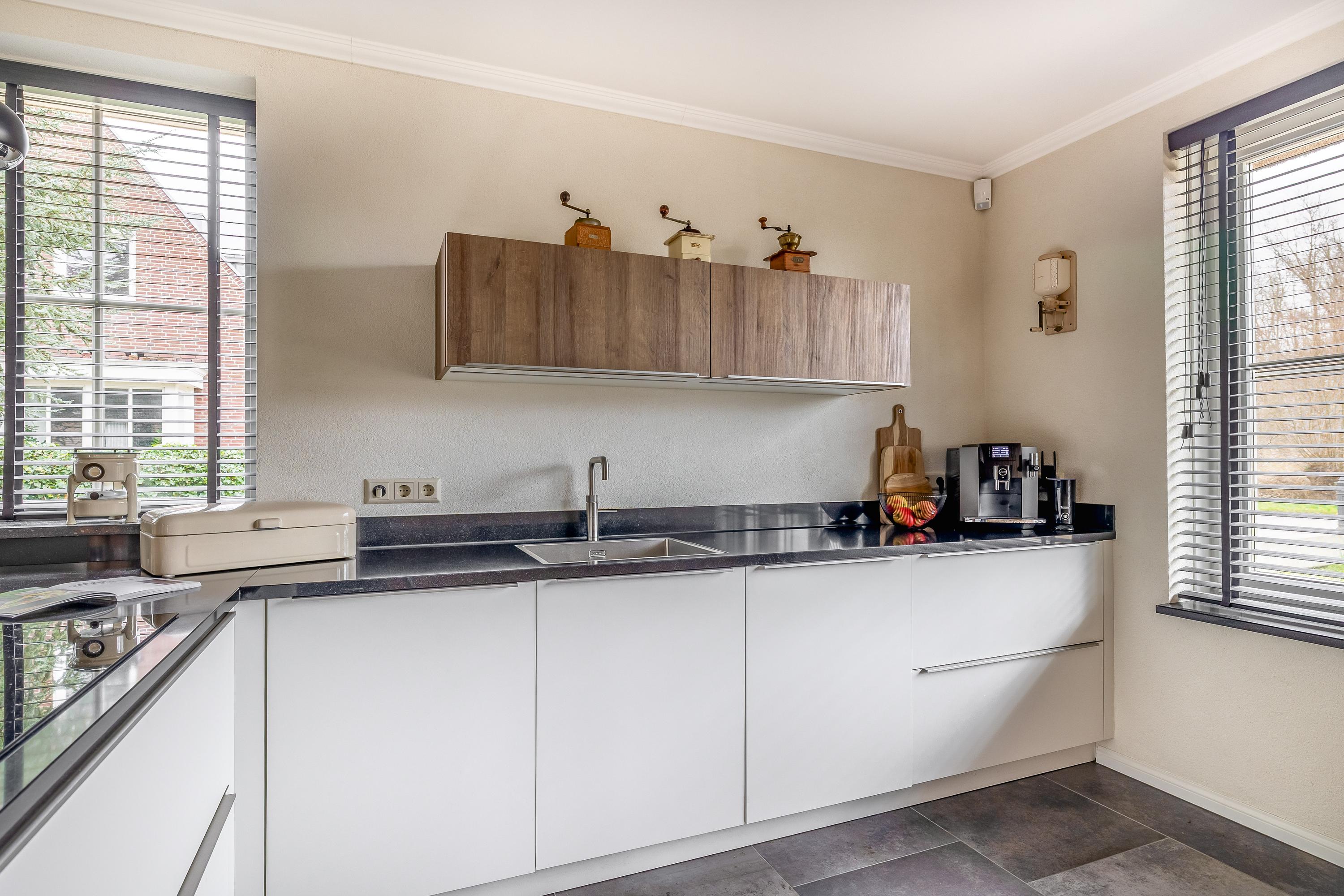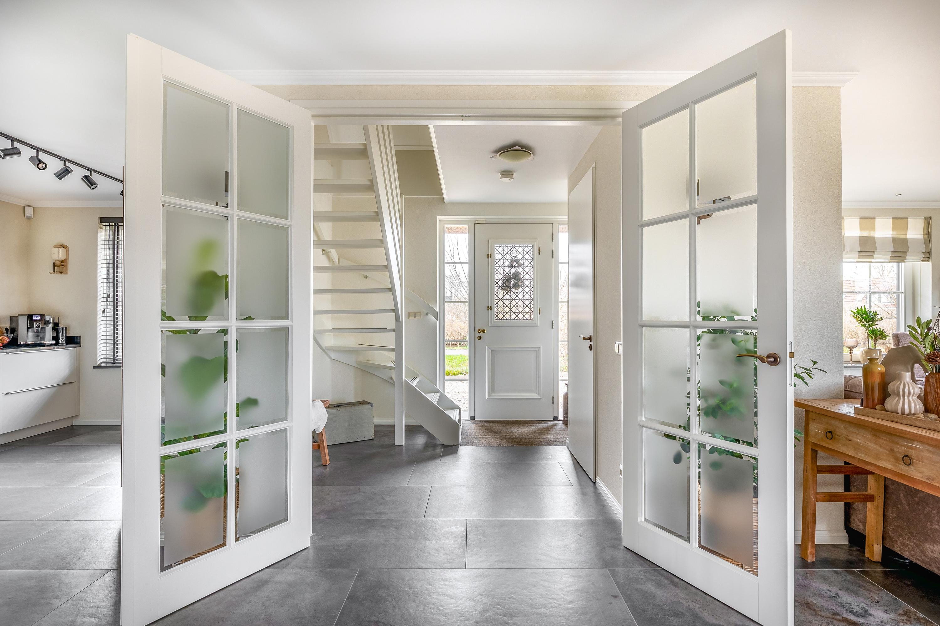 Through the stylish entrance you enter a spacious hallway with a renovated floating toilet and washbasin. Double doors lead to the very generous living area, which was completely renovated in 2022. The living space consists of a luxury open-plan kitchen, dining area and sitting area with bay window and French doors opening onto the terrace. The modern kitchen is fully equipped: an induction hob with Bora extraction, two identical combination ovens, a large refrigerator and freezer, dishwasher, Quooker and a composite worktop. In the utility room you will find connections for a washing machine and dryer, as well as a door to the outside. Thanks to the large windows and the bay window with French doors, daylight floods in abundantly. The atmospheric gas fireplace and recessed spotlights complete the picture. Also on the ground floor is a spacious bedroom with custom-made wardrobes and a luxury en-suite bathroom (2022) with walk-in shower, floating toilet, washbasin unit and designer radiator. This makes single-level living possible without sacrificing comfort.