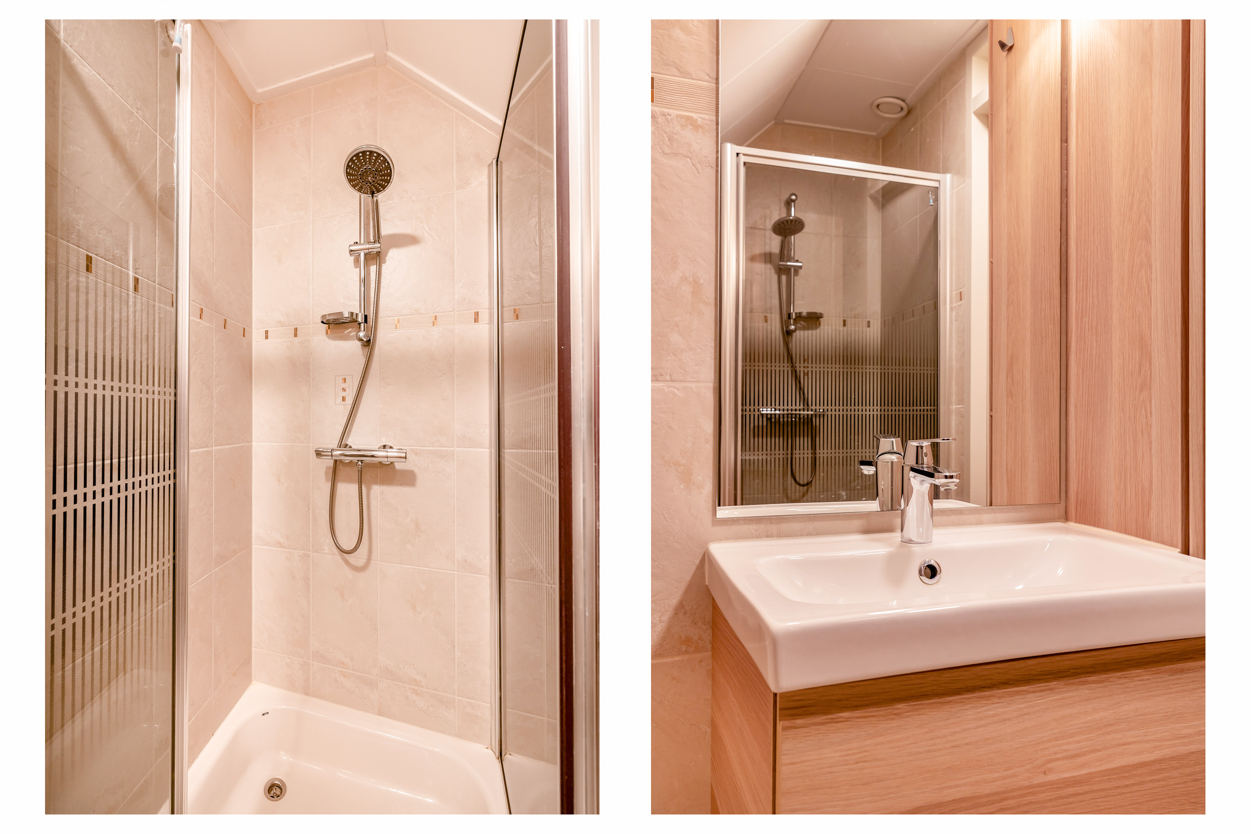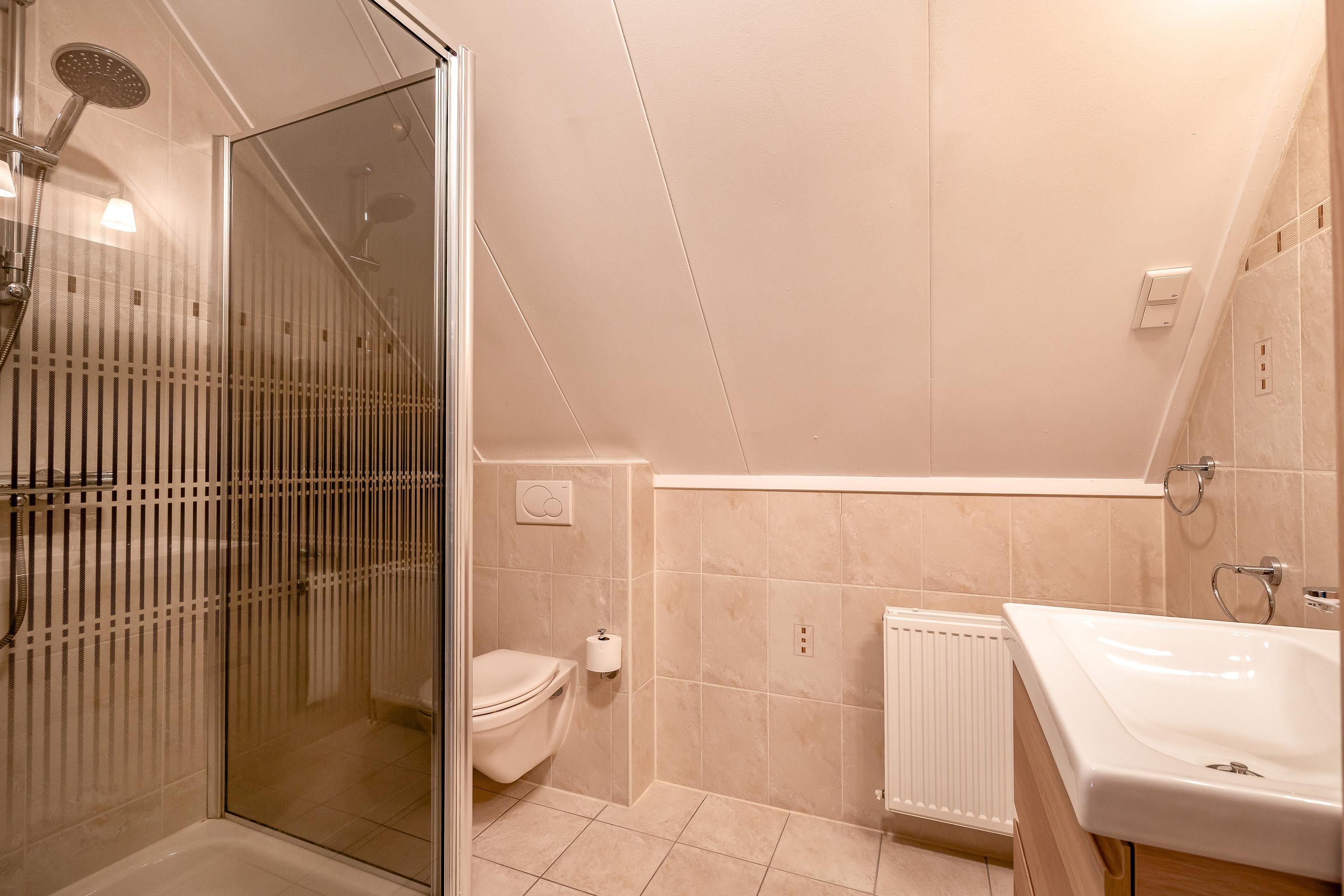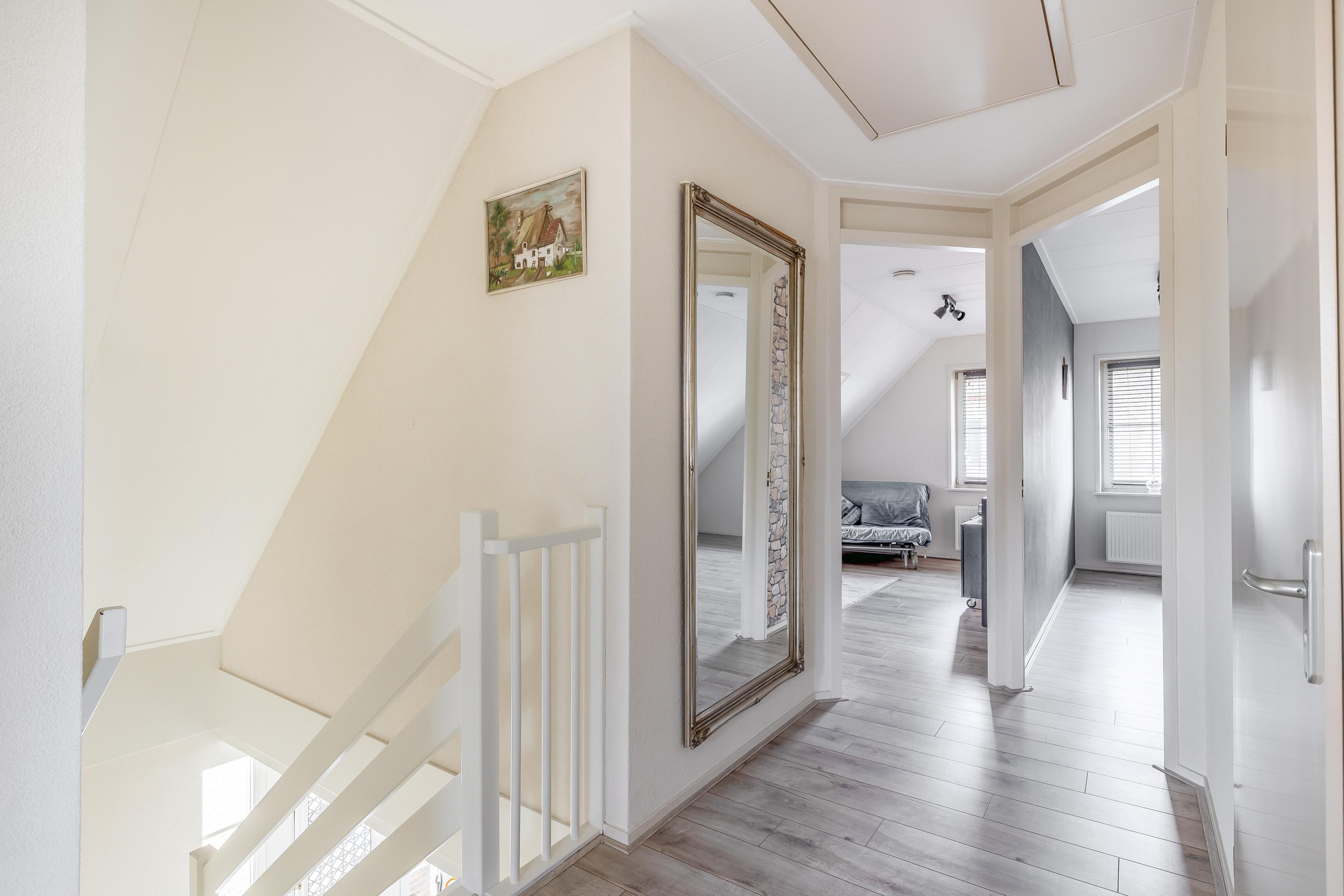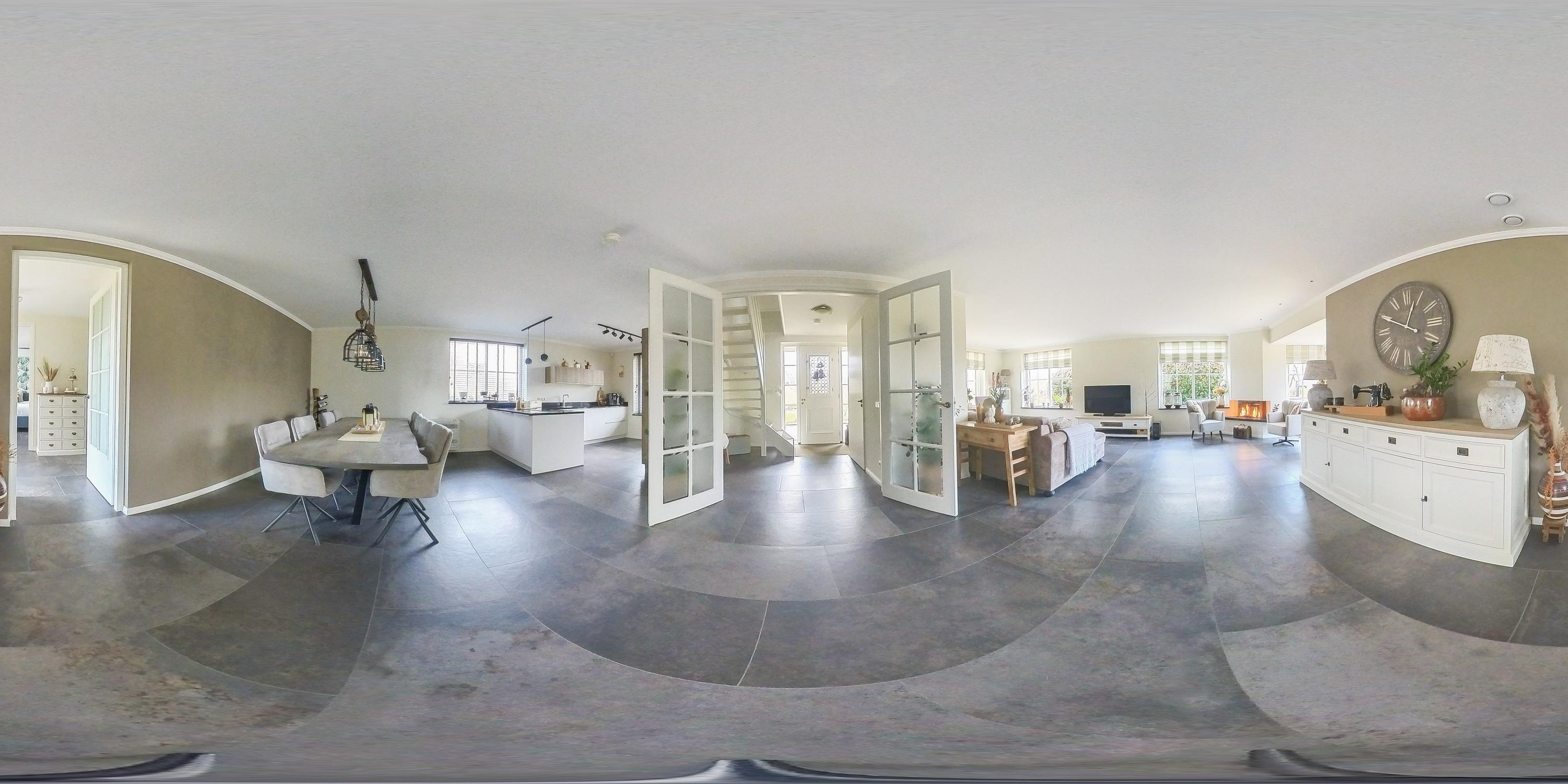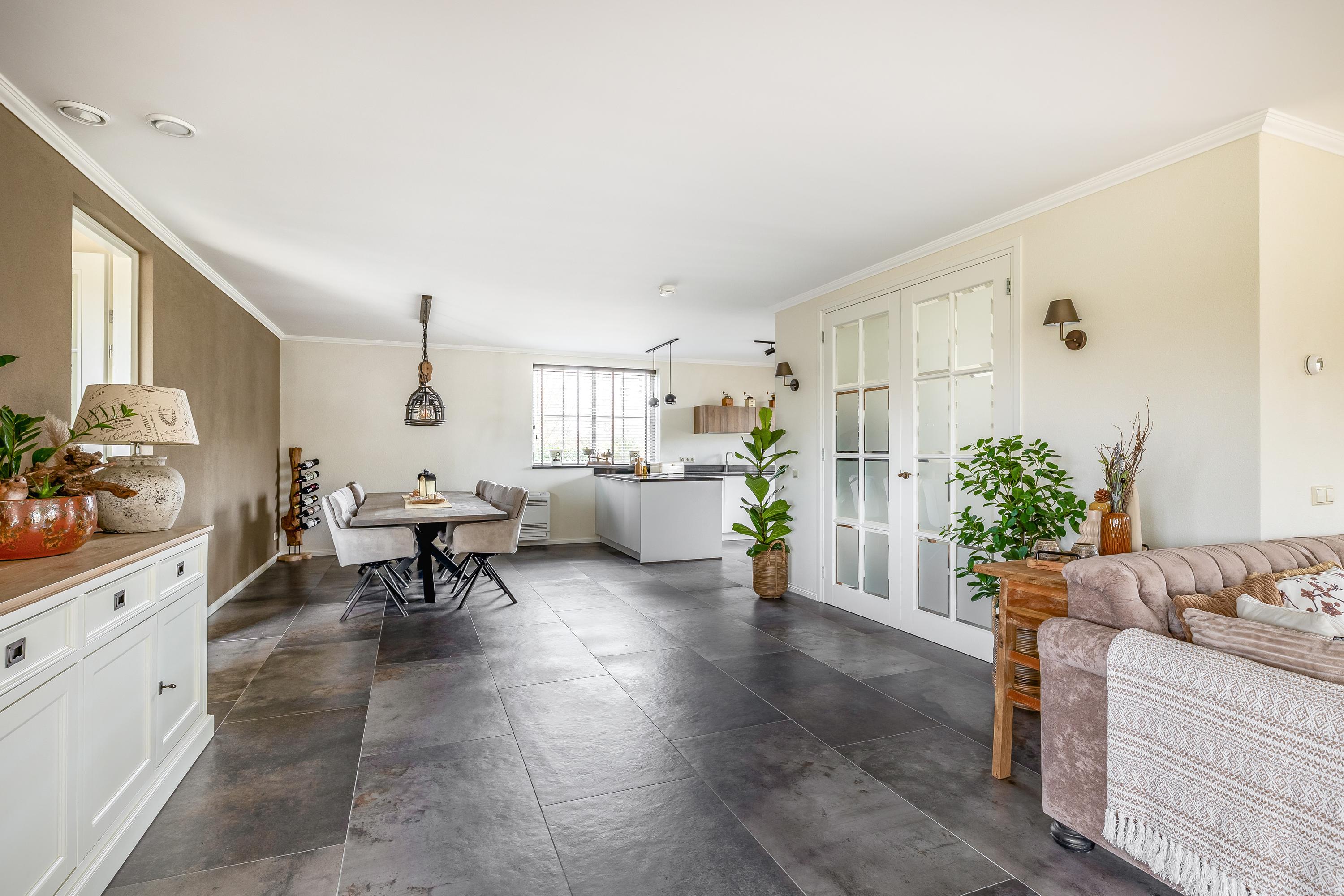Through the stylish entrance you enter a spacious hallway with a renovated floating toilet and washbasin. Double doors lead to the very generous living area, which was completely renovated in 2022. The living space consists of a luxury open-plan kitchen, dining area and sitting area with bay window and French doors opening onto the terrace. The modern kitchen is fully equipped: an induction hob with Bora extraction, two identical combination ovens, a large refrigerator and freezer, dishwasher, Quooker and a composite worktop. In the utility room you will find connections for a washing machine and dryer, as well as a door to the outside. Thanks to the large windows and the bay window with French doors, daylight floods in abundantly. The atmospheric gas fireplace and recessed spotlights complete the picture. Also on the ground floor is a spacious bedroom with custom-made wardrobes and a luxury en-suite bathroom (2022) with walk-in shower, floating toilet, washbasin unit and designer radiator. This makes single-level living possible without sacrificing comfort.