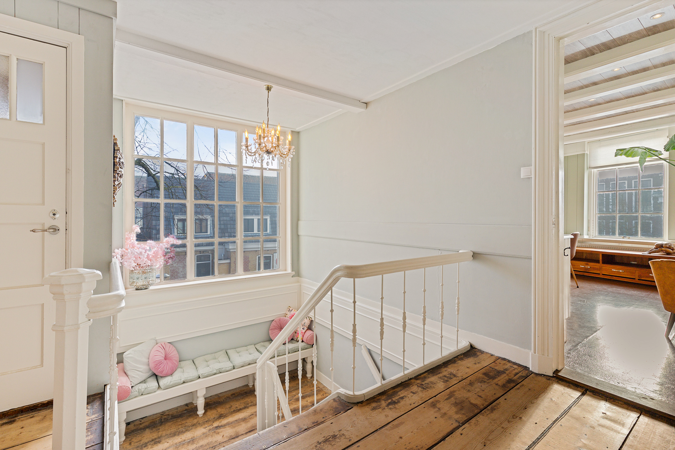 The monumental staircase leads to a generous landing on the first floor. At the front lies the atmospheric living kitchen with canal view and ample space for a large dining table and seating area.