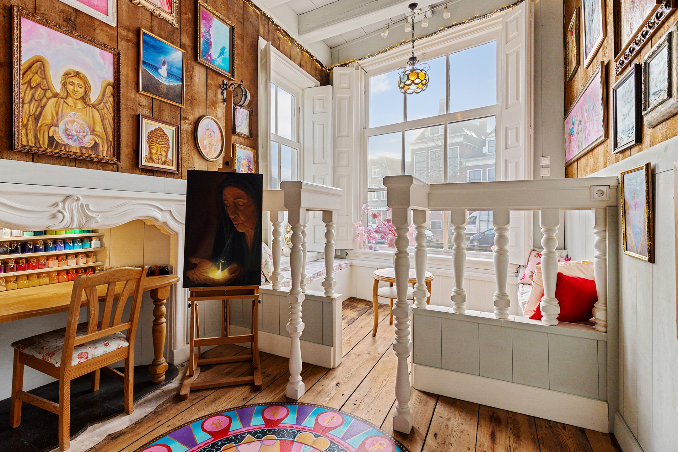 The front room currently used as a gallery shop enjoys a beautiful view of the canal through its corner windows.