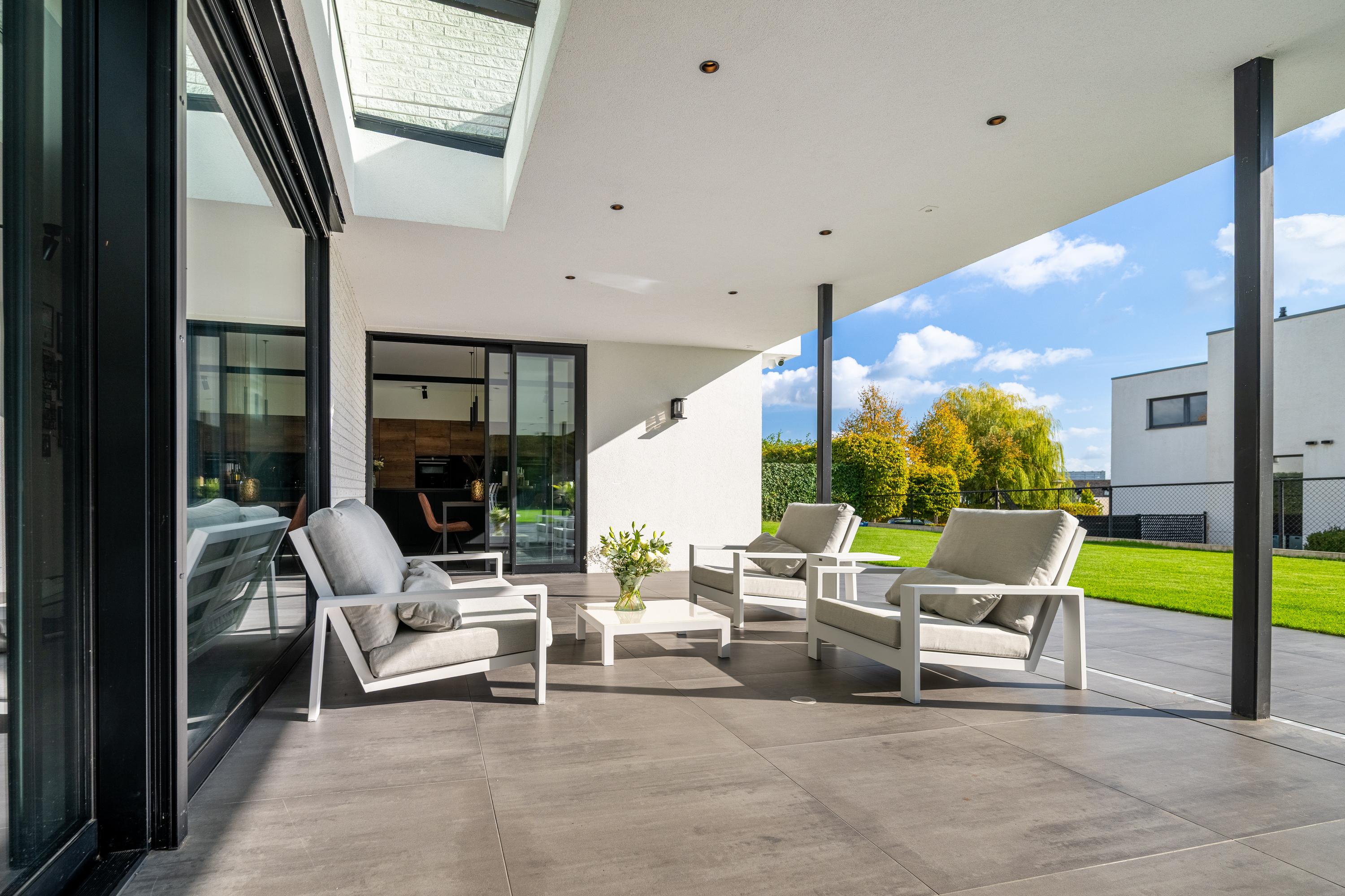 A special detail is the large flower window, which provides a playful view of the garden and the edge of the forest. In combination with the large sliding doors to the covered terrace, this creates a spacious and open whole, in which inside and outside flow harmoniously into each other. The living room and kitchen are both equipped with an air conditioning unit.