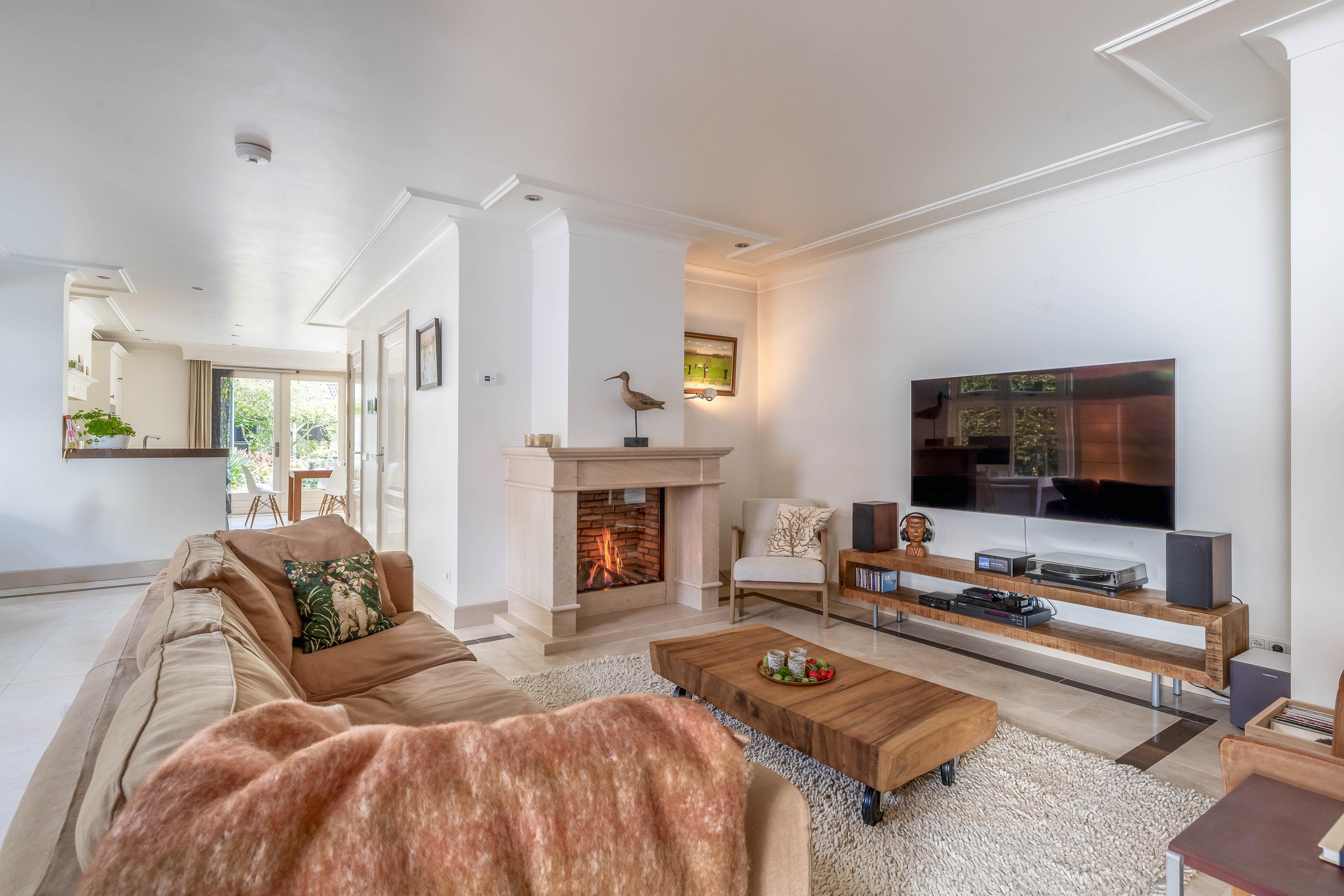 window provides access to the living room. The living room has a marble tiled floor with underfloor heating, stucco walls and a stucco ceiling with decorative mouldings. Thanks to the many windows and a large bay window, the room enjoys plenty of natural light, creating a spacious effect. Adjacent to the living room is a versatile space, ideal for an inspiring workspace or a cosy play area. The space can be closed off with a sliding door with stained glass. The kitchen has a corner layout and is equipped with a 5-burner gas hob, combination microwave/oven, sink, American fridge and dishwasher. Various base and wall cabinets provide storage space. There is enough space to place a dining table. The kitchen has a tiled floor with bis. The walls are partly finished with sleek stucco and partly with wooden panelling. The ceiling has stucco with decorative mouldings. The kitchen is open to the adjoining garden room. Here too, large windows provide a sea of light and a beautiful view of the surrounding garden. A wonderful place to relax! The walls are partly finished with sleek stucco and partly with wooden panelling. The ceiling is also finished with stucco and decorative mouldings. French doors provide access to the garden. There is also access to the utility room from here. The utility room is a practical space, equipped with a sink, a storage cupboard and a fixed cupboard wall with sliding doors. There is also a toilet. A door provides access to the garden. You can also reach the rear of the house from this room.