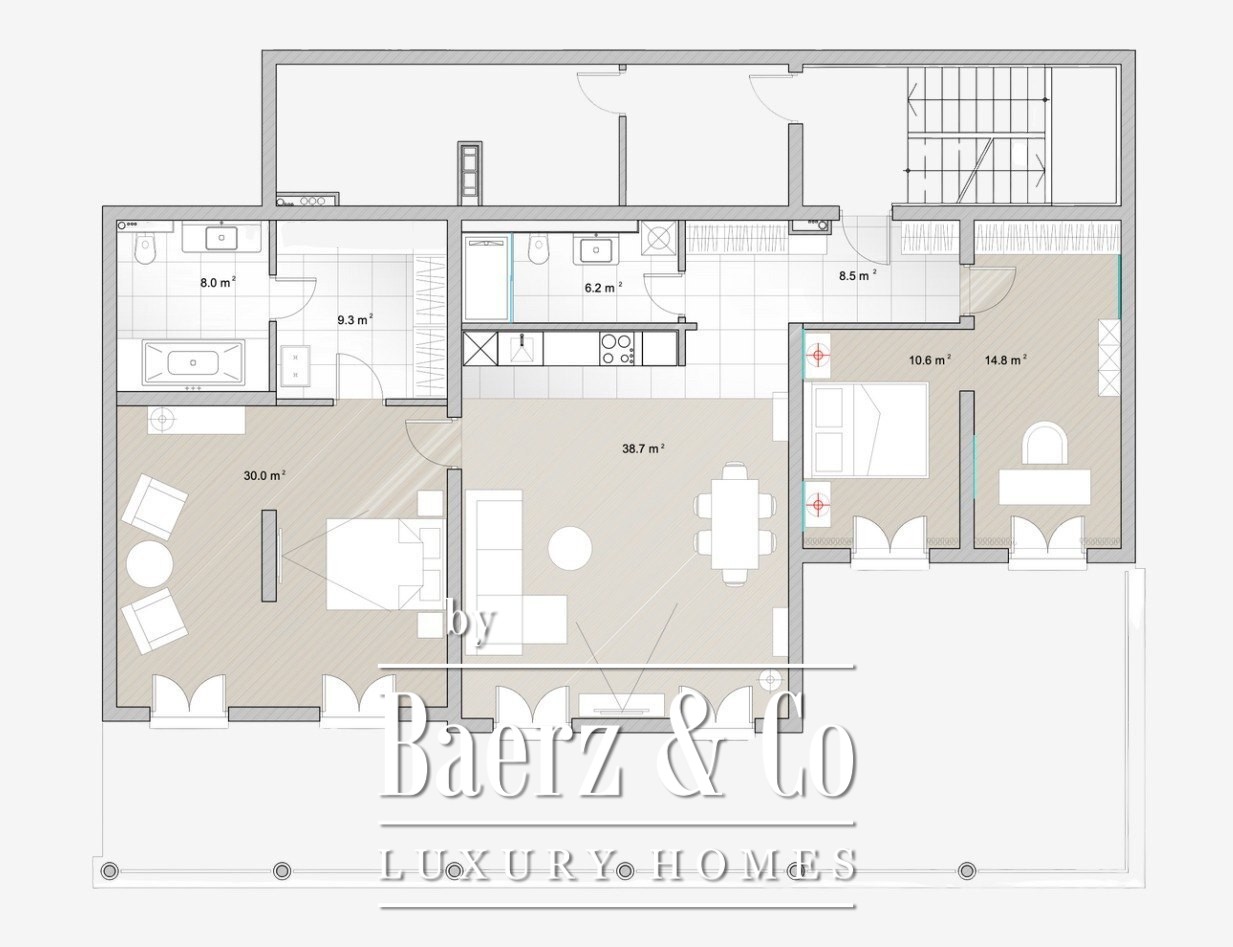 The enclave provides its residents with discreet luxury: year-round heated swimming pool, a fitness club, a concierge service available around the clock, and curated amenities such as bath complexes and saunas. Services including shuttle and airport transfers, apartment cleaning, and even private sailing are available on request, enhancing both privacy and access. Maintenance is attentive, incorporating not only physical upkeep but thoughtful touches such as sunbeds and refreshments by the pool during summer.
