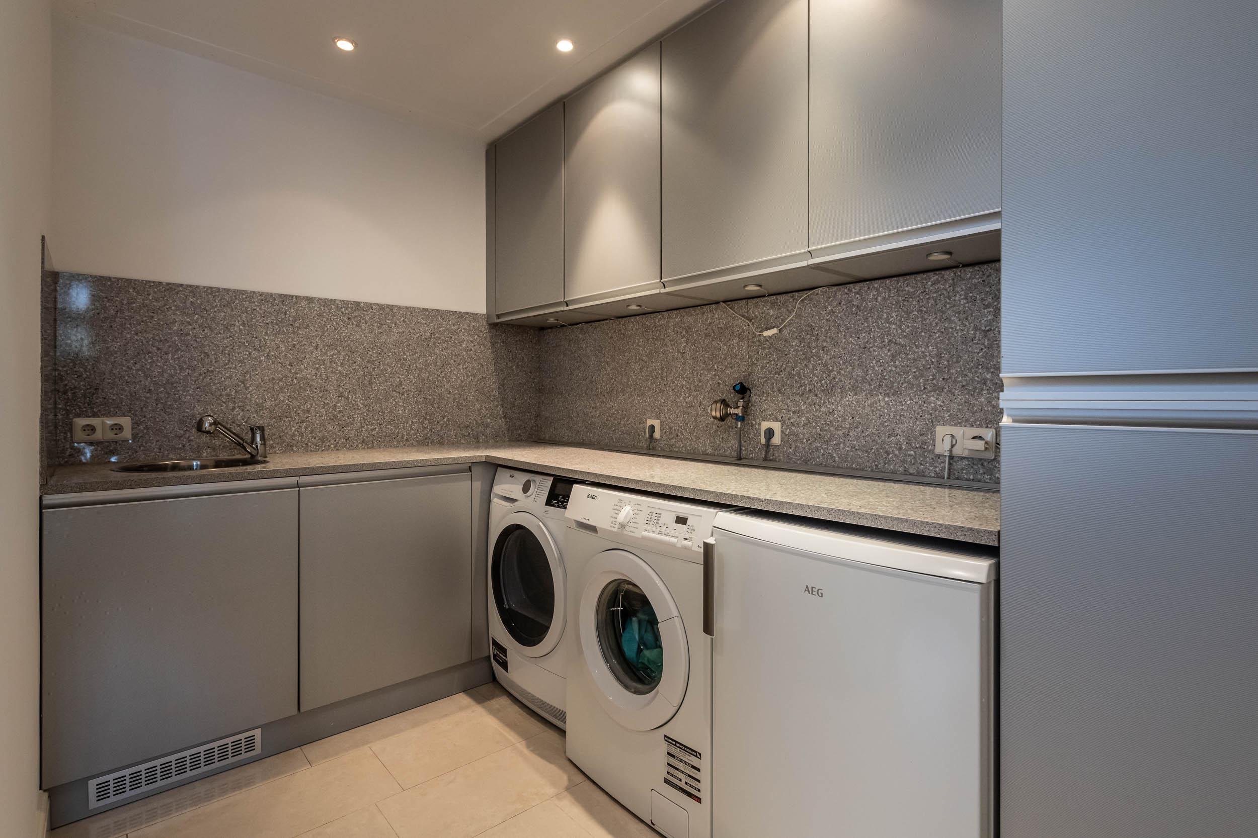 Ground floor: Entrance, large L-shaped hall with wardrobe and WC. From the hall, access is provided to the garage on the right and the living room on the left. At the front of the house are the dining room and a dedicated office space. Through the sliding doors of the dining room, you enter the rear of the house, where a cosy sitting room features a gas fireplace, a wide wall of built-in cupboards, and double doors opening onto the backyard. The spacious, modern SieMatic kitchen is open to the living room and features a large cooking island equipped with a built-in teppanyaki plate and an induction wok, along with additional features. One wall is fitted with a range of modern kitchen appliances. The utility room, accessible from both the garage and the kitchen, is equipped with a washing machine connection and a kitchen unit with a sink. The double French doors open onto a beautiful, spacious garden featuring a partially covered terrace, multiple seating areas, and a stylish garden shed.