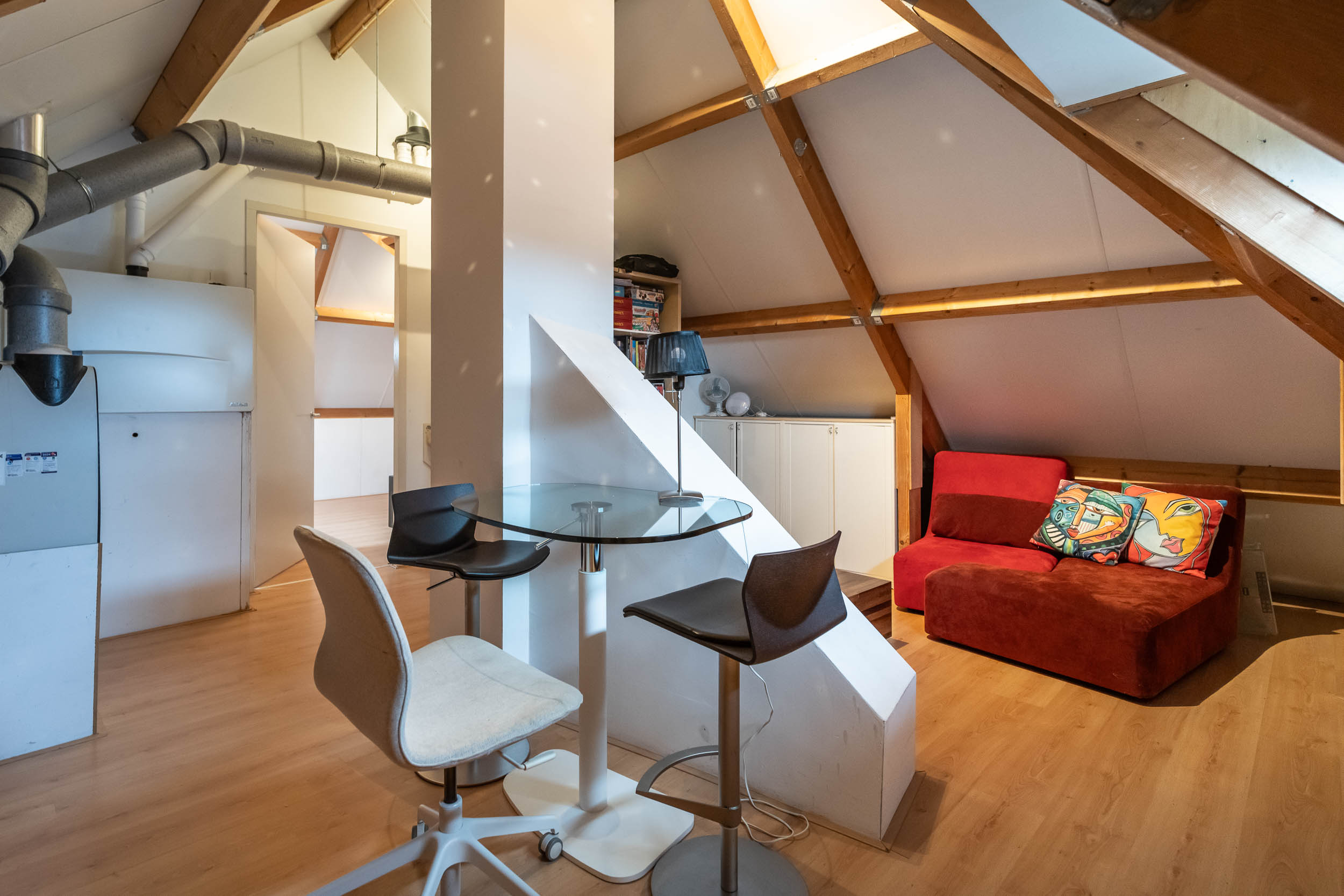Second floor: The multifunctional attic space, currently serving as a playroom, leads to one bedroom. Both rooms have a dormer window. The bedroom provides access to a storage room.