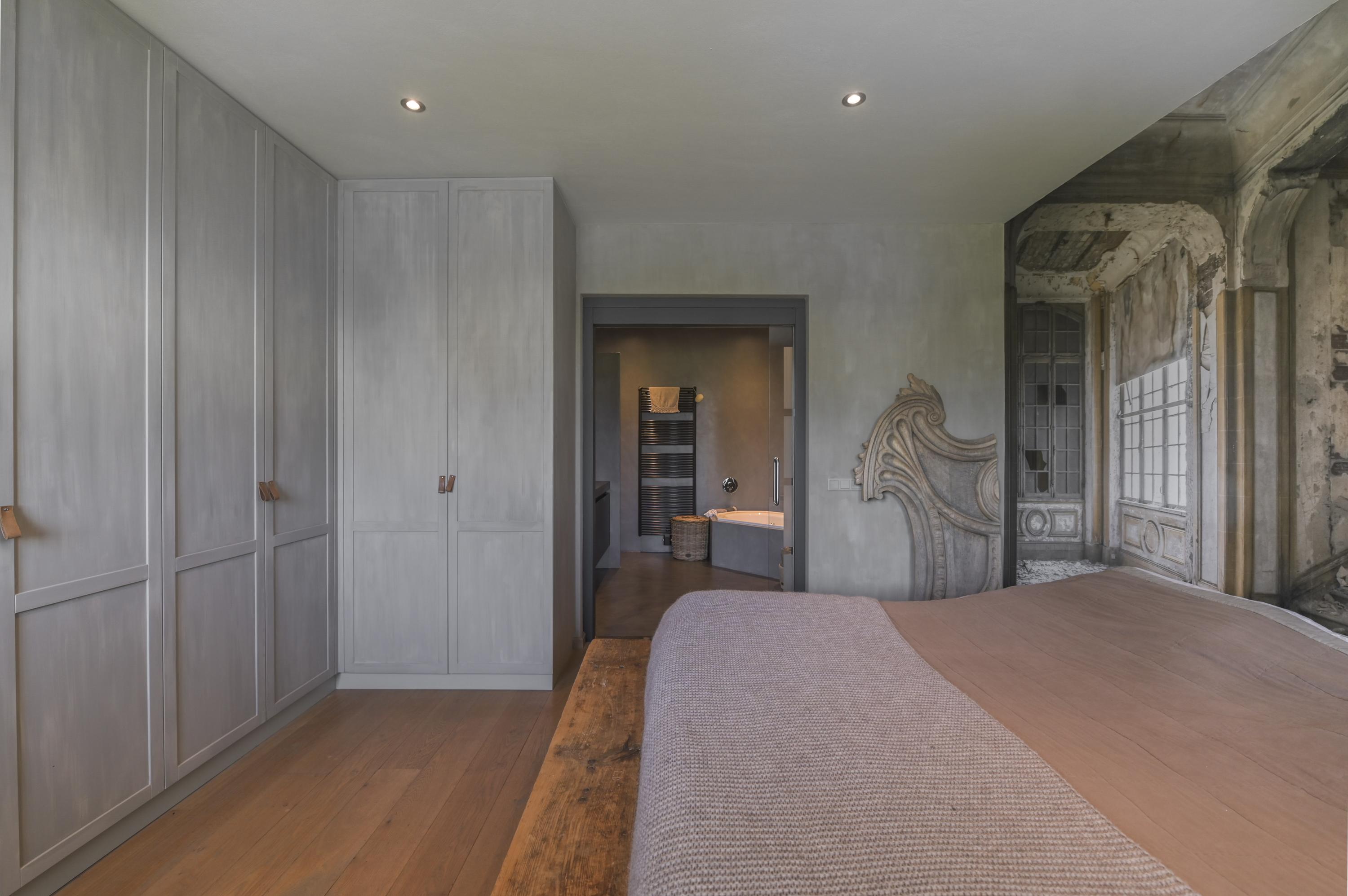 The master bedroom features a wooden floor, fitted wardrobes, and access to the en-suite bathroom through a glass sliding door. This bathroom has been fully renovated with a beton ciré floor and includes a walk-in shower with built-in taps, whirlpool bath, toilet, washbasin with vanity, and natural ventilation through a window.
