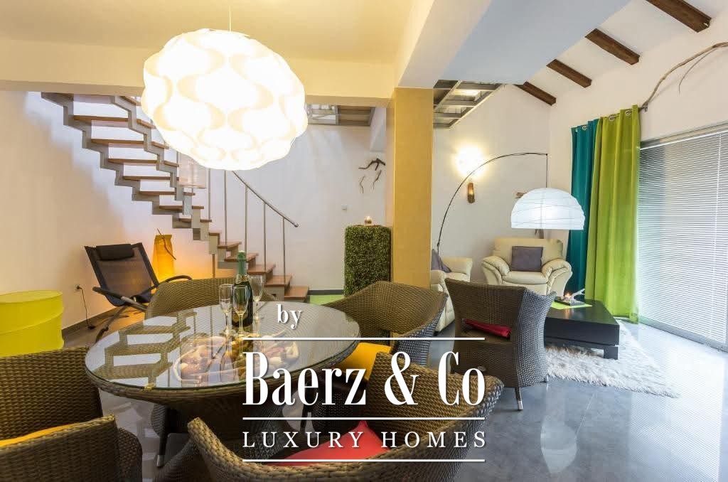 The residence spans 110 m² and balances privacy with openness. The lower level unfolds into a living room, a separate kitchen, two bedrooms, a bathroom, and two terraces. The larger terrace frames direct, uninterrupted sea views and the silhouette of Kotor’s medieval skyline. The upper level includes a third bedroom, a second bathroom, and a smaller living room, offering versatile space for family or guests. Each room is fully furnished and carefully prepared for immediate use.