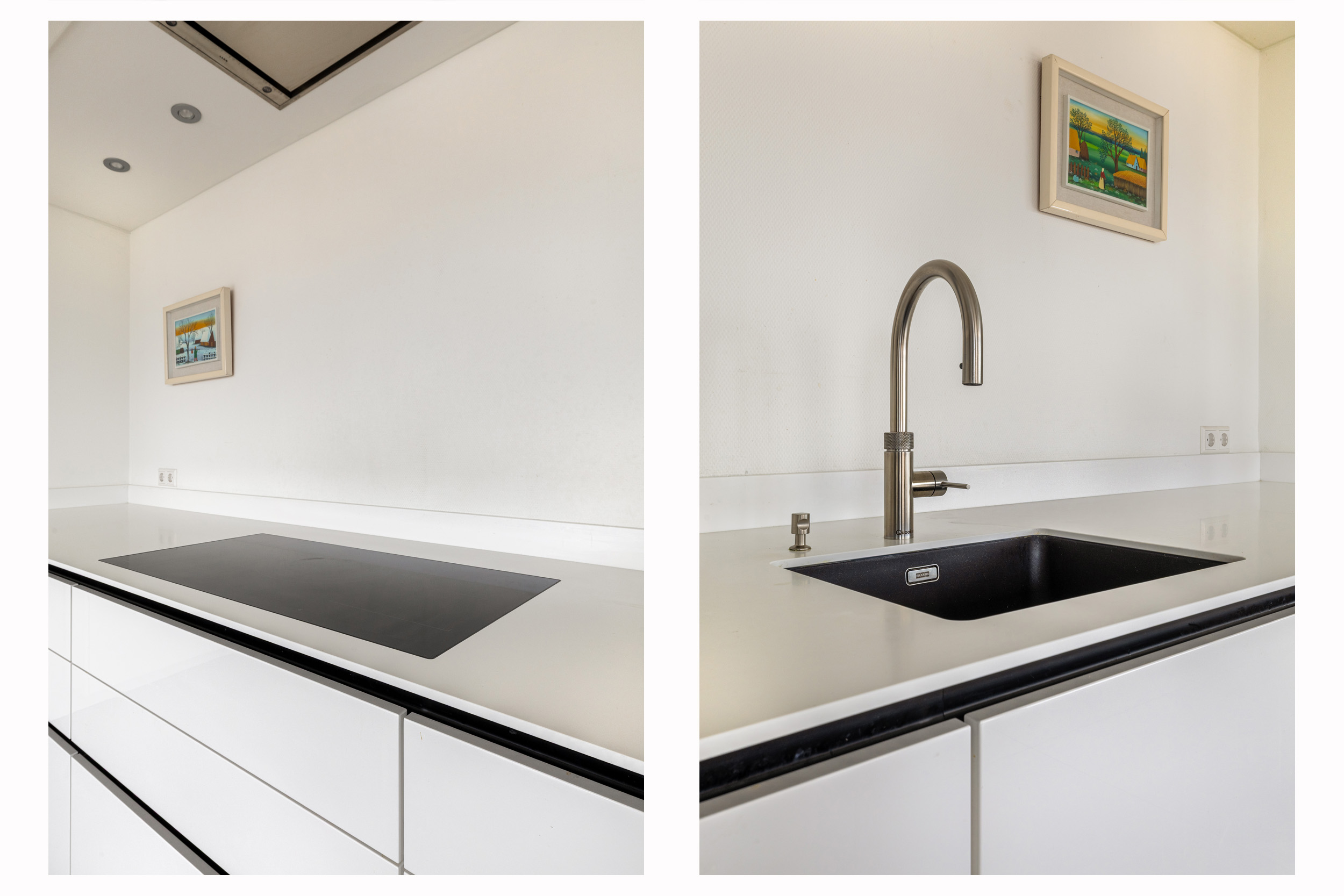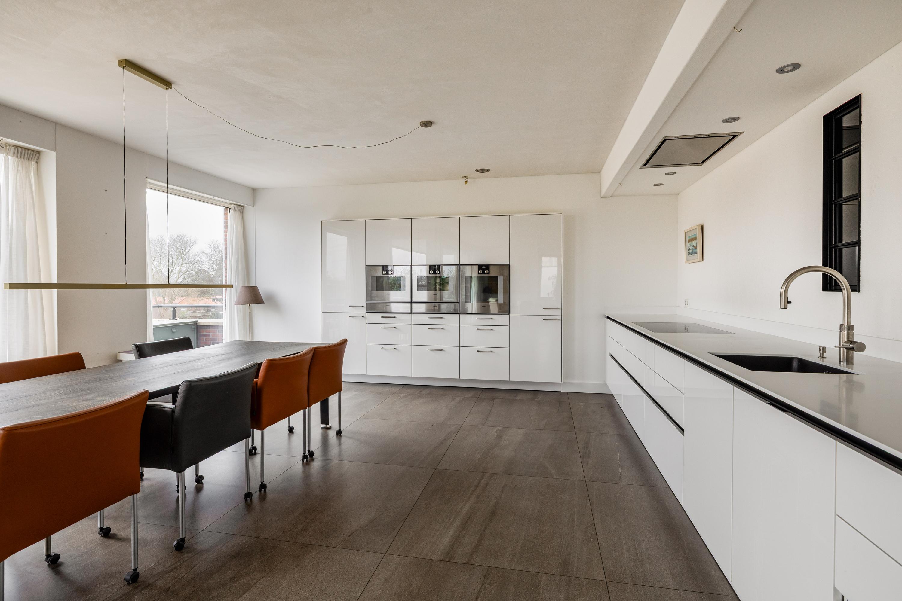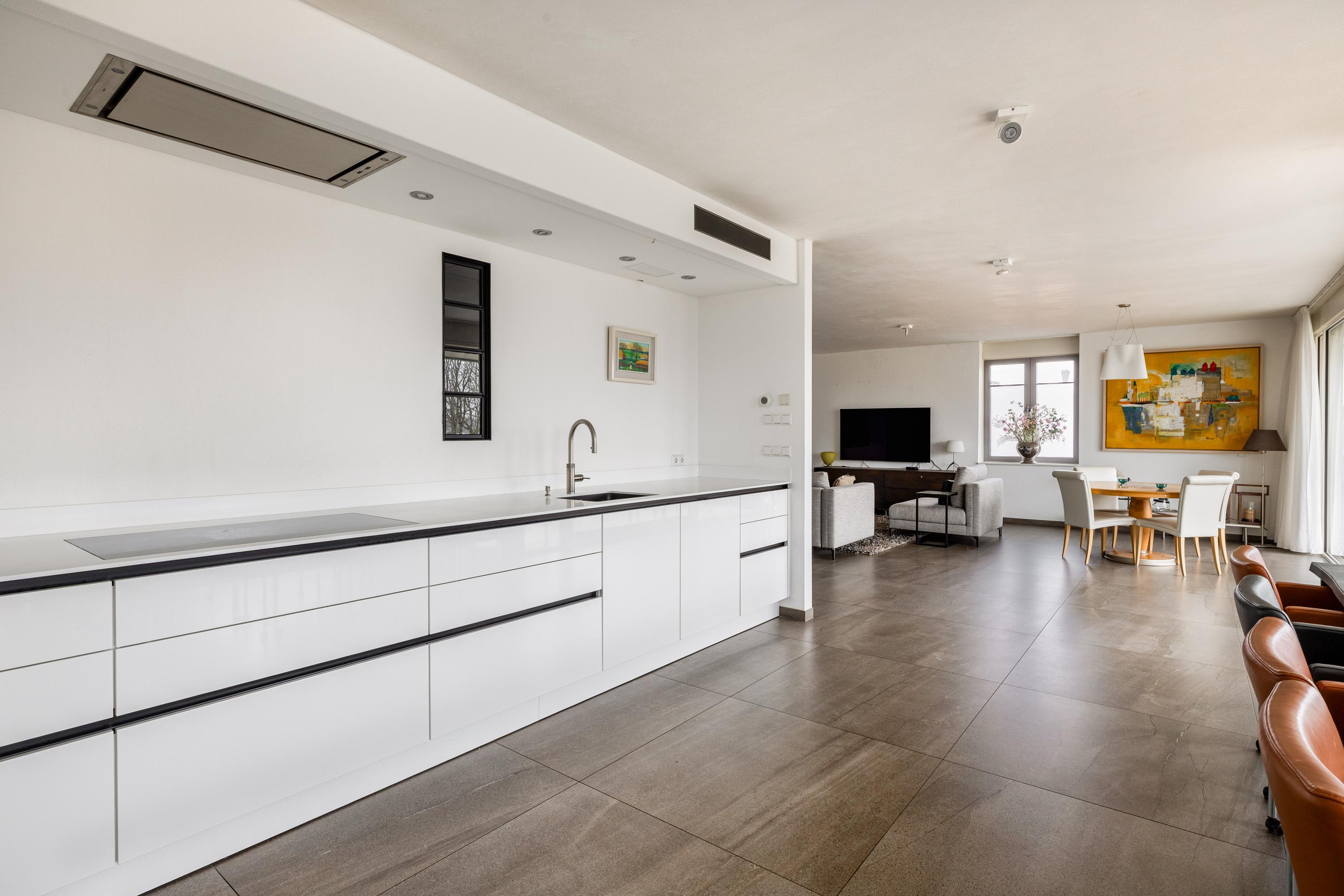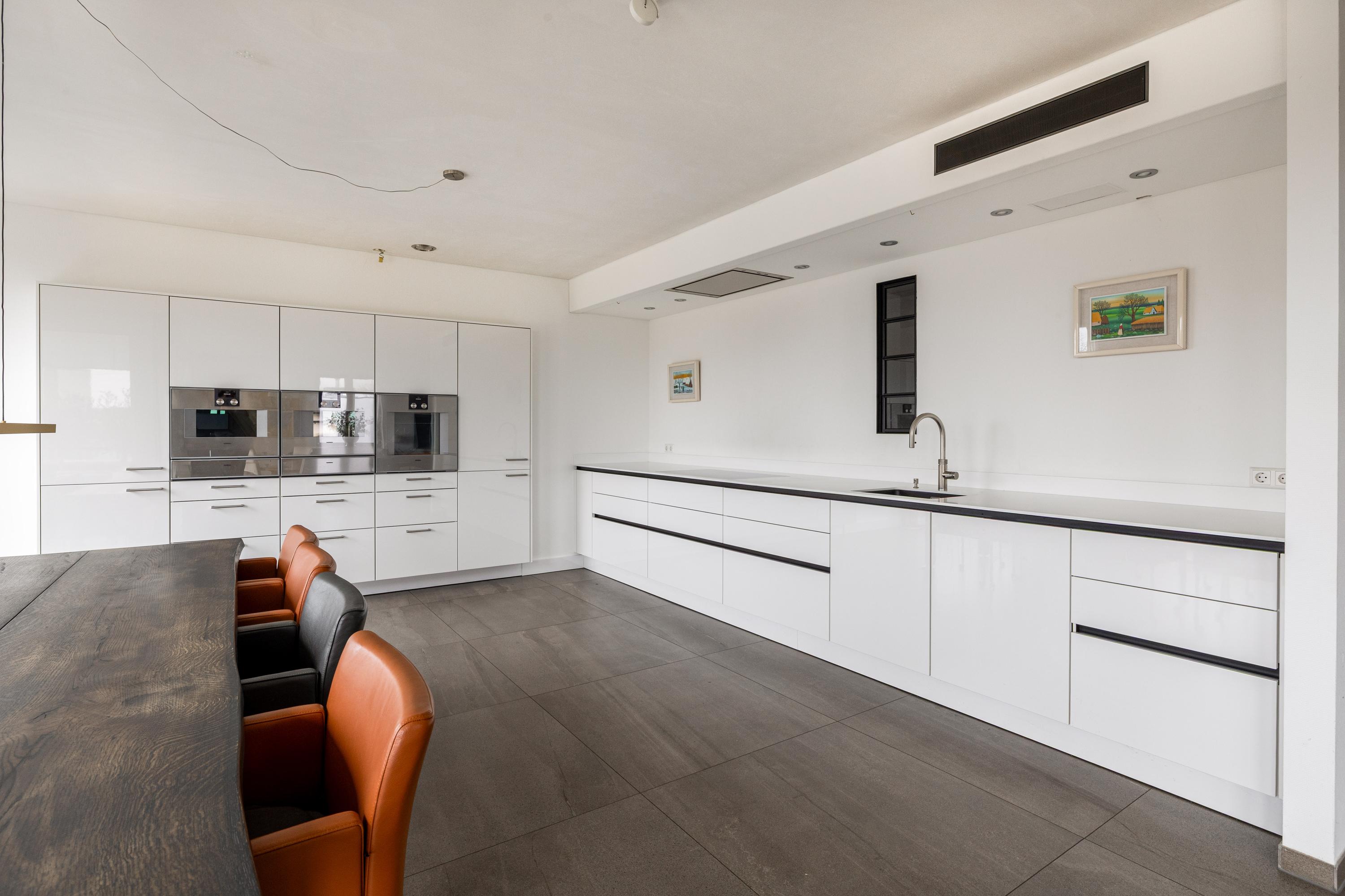Adjacent to the living room is the very spacious open-plan kitchen, a place that invites long dinners and convivial moments. The SieMatic kitchen is sleek, timeless and fully equipped. Featuring high-quality Gaggenau appliances, generous work surfaces and a practical layout, it is a kitchen where cooking comes naturally. Whether you enjoy elaborate culinary evenings or comfortable everyday use, this kitchen offers it all.