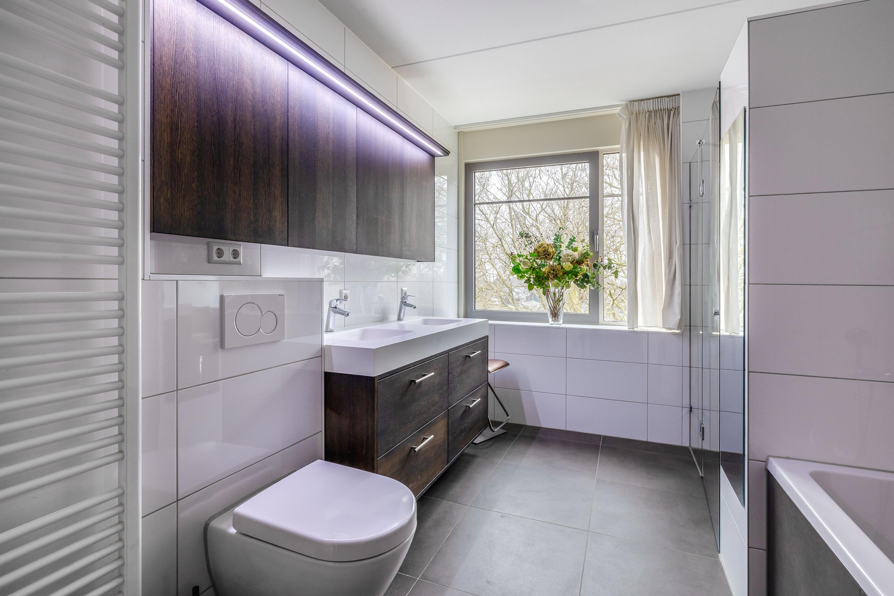 The en-suite bathroom is stylishly and comfortably finished and includes a bathtub, spacious walk-in shower, double washbasin and high-quality materials throughout. Everything is generously designed and perfectly suited for those who wish to live on one level without sacrificing luxury or comfort. The second bathroom is ideal for guests or a (small) family, ensuring everyone has their own space.