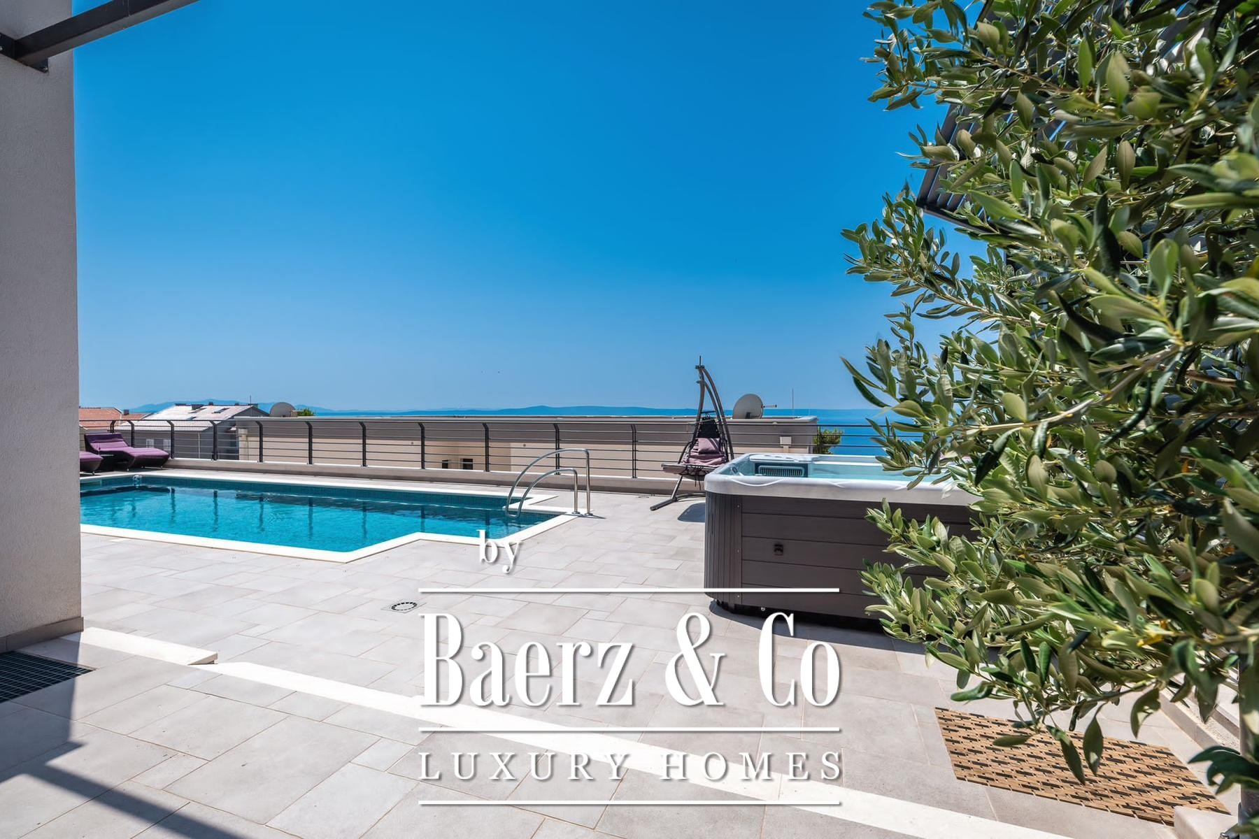 Villa Makarska occupies an elevated position, delivering panoramic views across the sea and the historic town below. This villa in Makarska stretches across 450 m² of living space, integrated into a 448 m² plot that articulates a clear connection between interior and exterior living. The south-facing orientation ensures constant natural light in every principal room, enriching daily life with views that shift from dawn to evening.